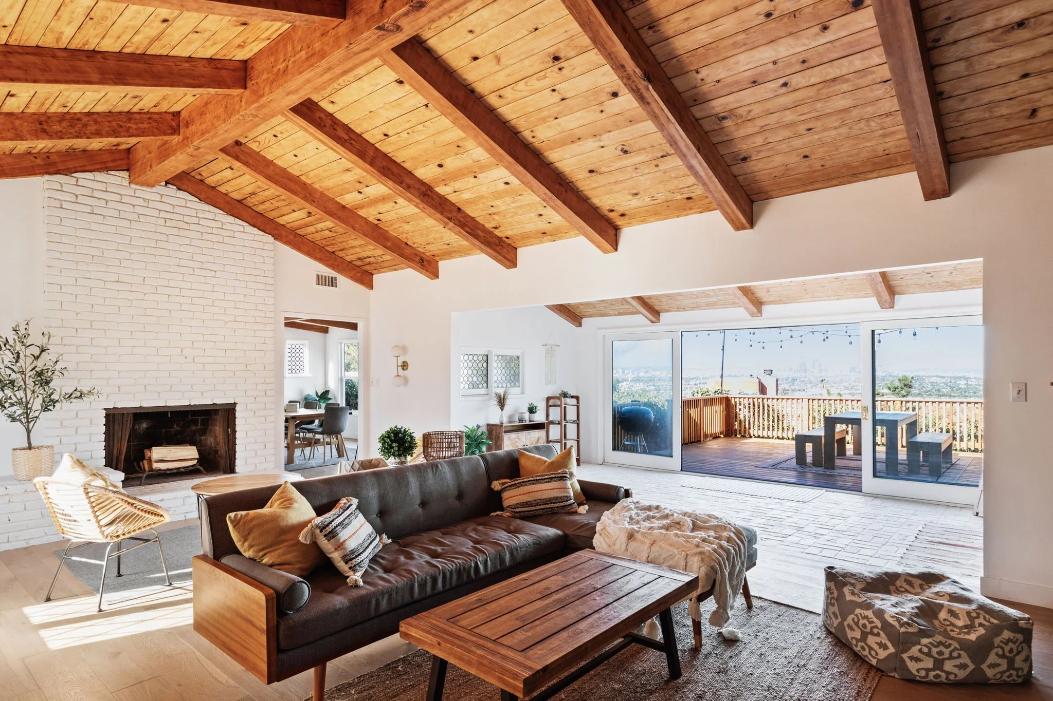 Sun-bathed midcentury rancher with indoor-outdoor architecture, vaulted ceilings, exposed wood beams, a floor-to-ceiling brick fireplace, and a large outdoor deck w stunning 180-degree views of Los Angeles and the DTLA skyline.