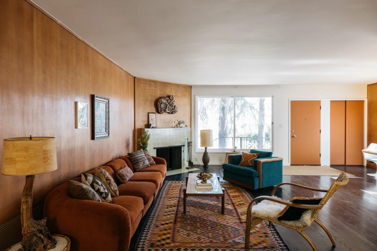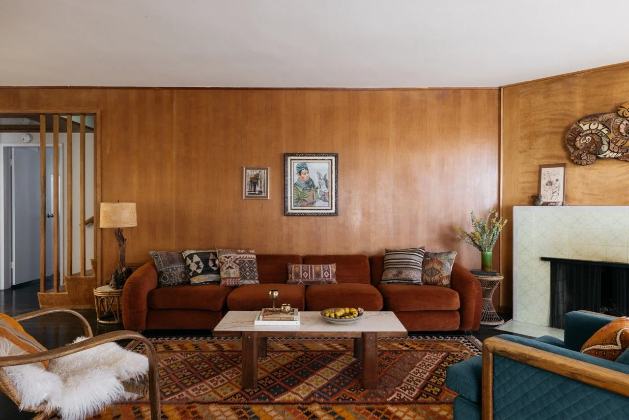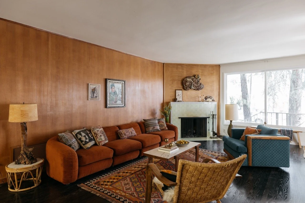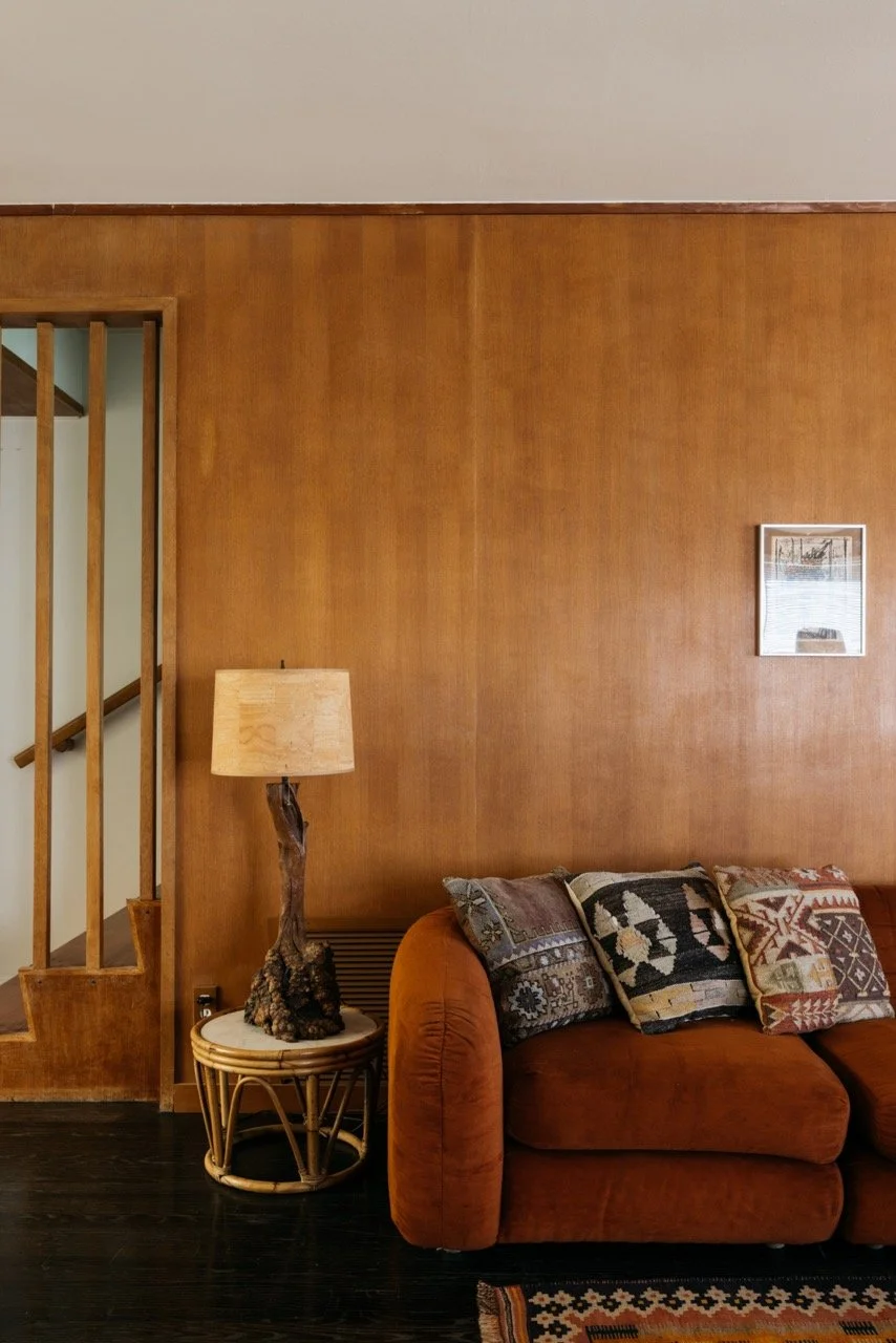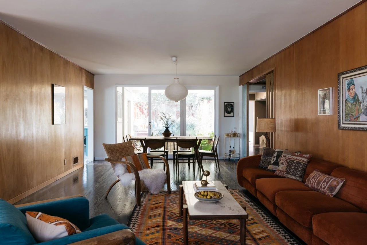 An all original 1950s modern family home with warm wood paneling, bohemian decor, and all the laid back California vibes.