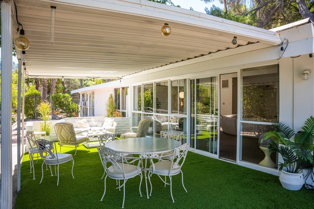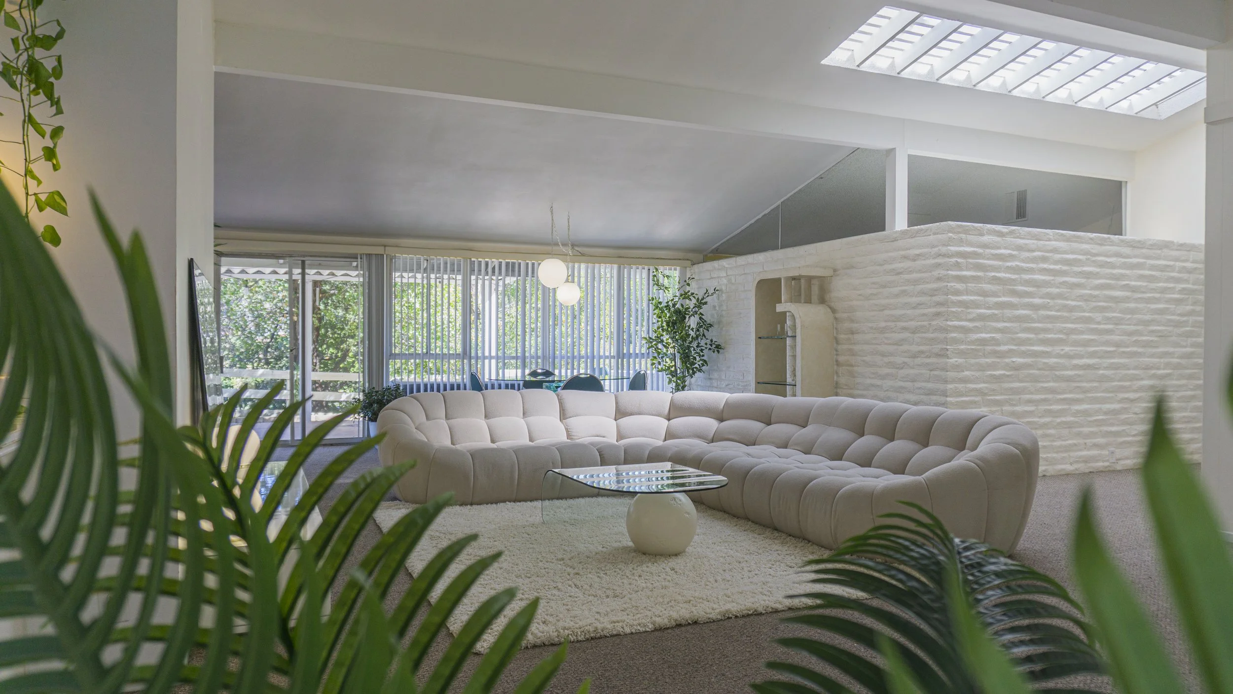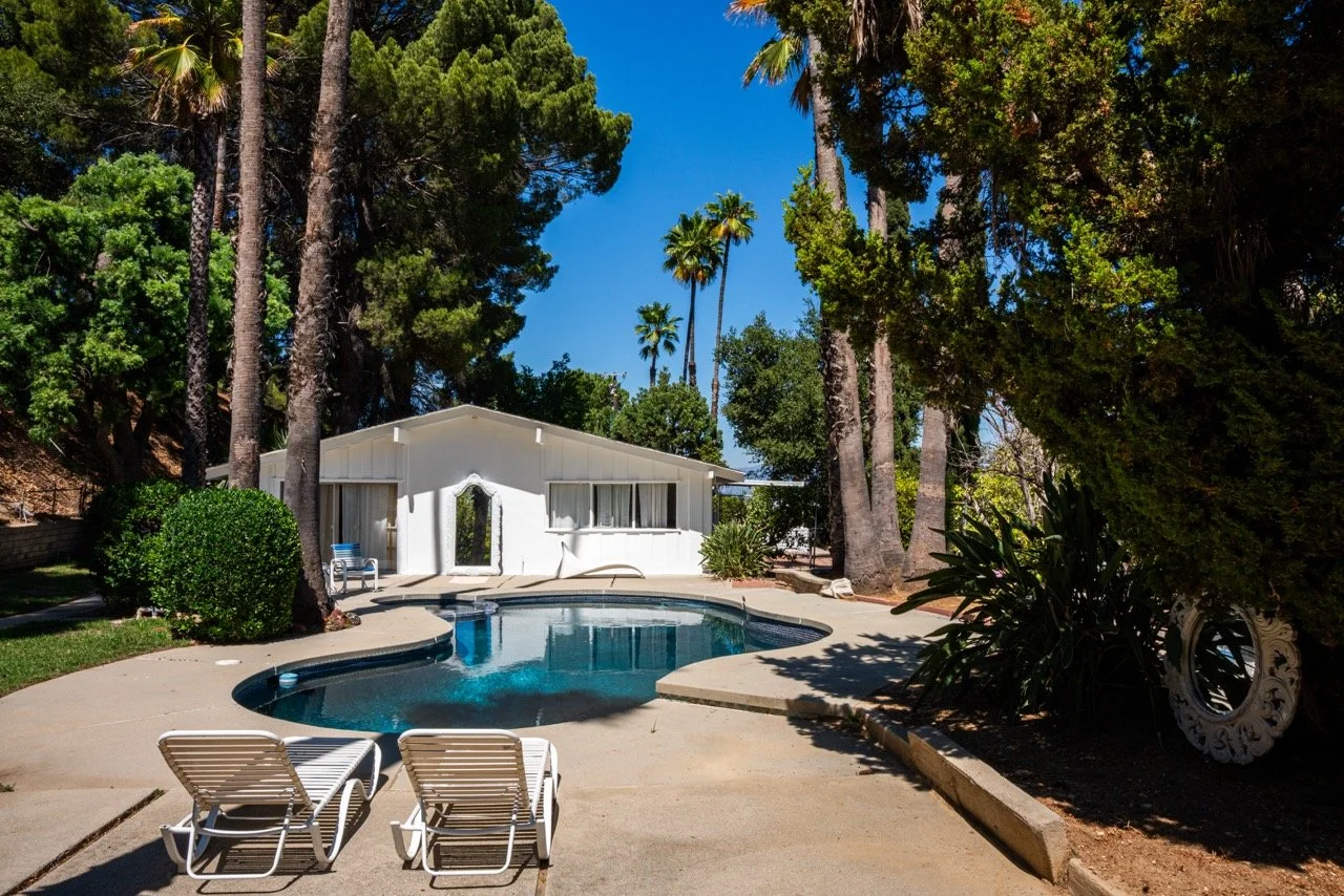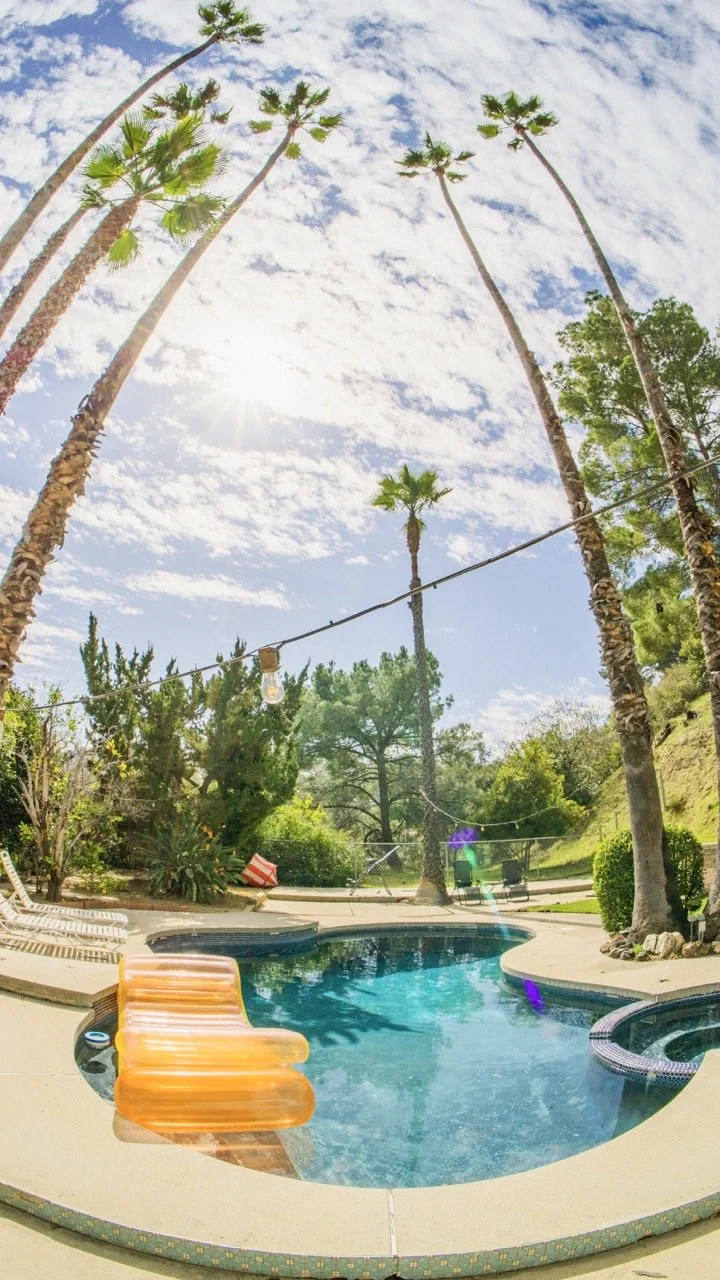 A sun-soaked oasis in the Hollywood Hills, this MCM style bungalow features minimal modern decor, windows flooded with sunlight, and a pool sur- rounded by towering palms.