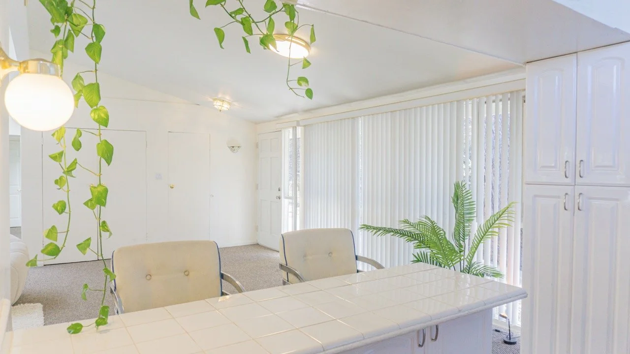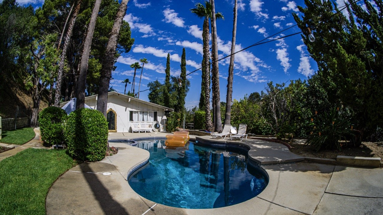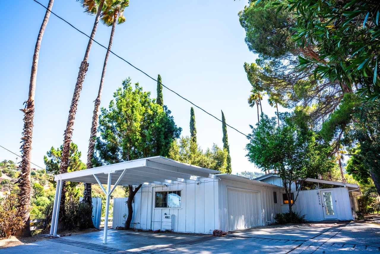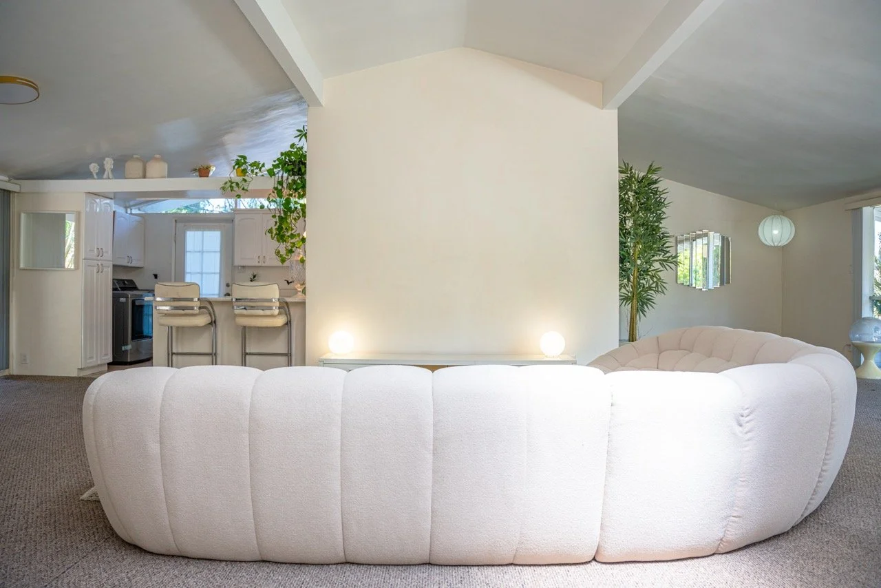 A sun-soaked oasis in the Hollywood Hills, this MCM style bungalow features minimal modern decor, windows flooded with sunlight, and a pool sur- rounded by towering palms.
