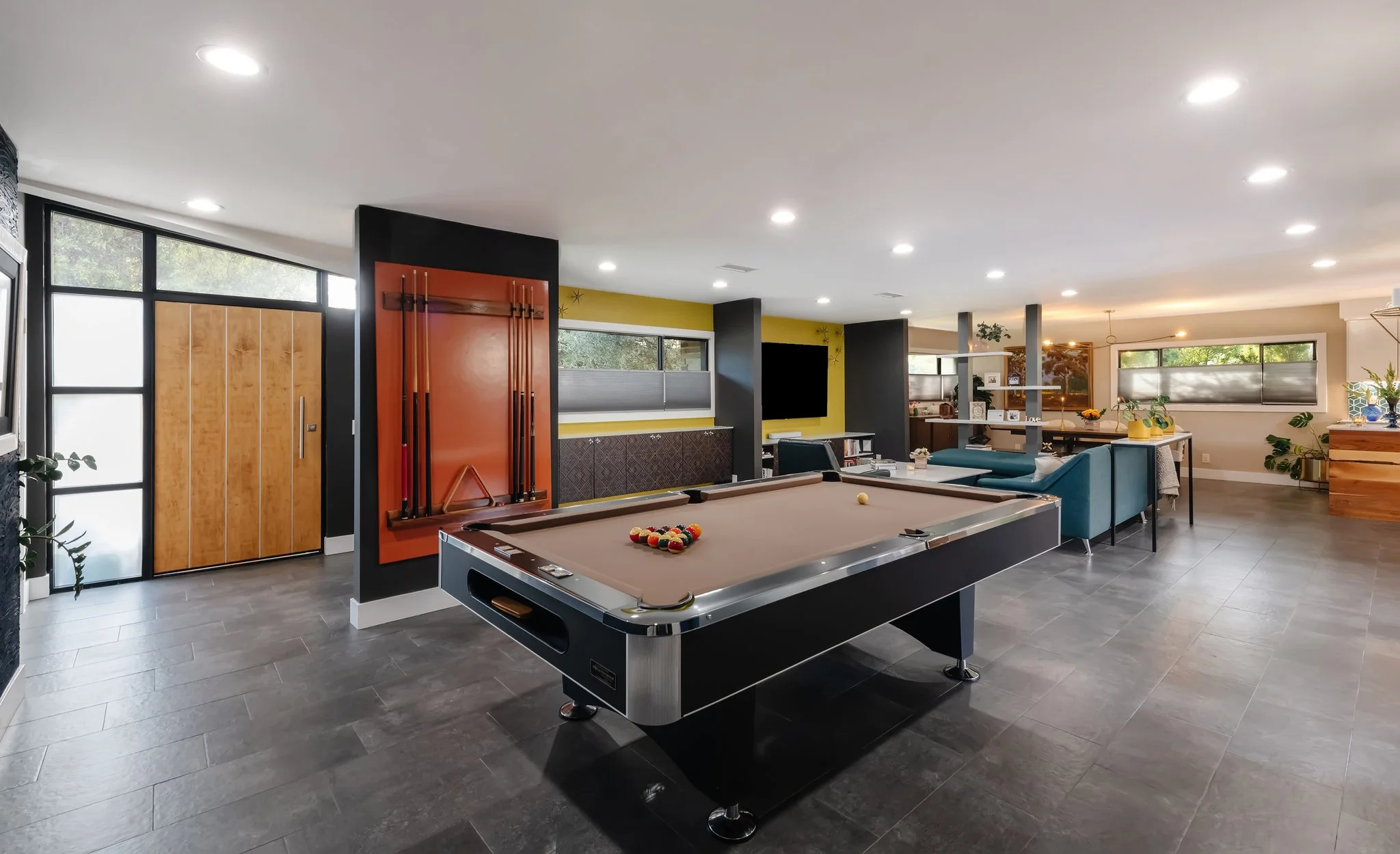 Step inside to a sun-filled living room crowned by dramatic vaulted ceilings, where a stylish billiards table anchors a relaxed entertainment zone. The living space flows effortlessly into the dining area and an immaculate kitchen that’s equal parts design and function: a generous center island with bespoke counters and cabinetry, perfect for cooking scenes and shows.