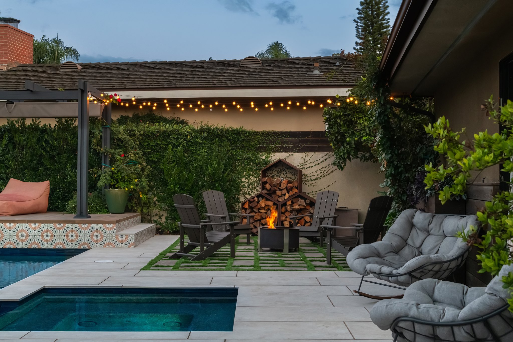 Outside, the yard unfolds as a true entertainer’s paradise — multiple dining and seating areas, a cozy firepit, and a majestic pool framed by lush landscaping and ample lounge space.