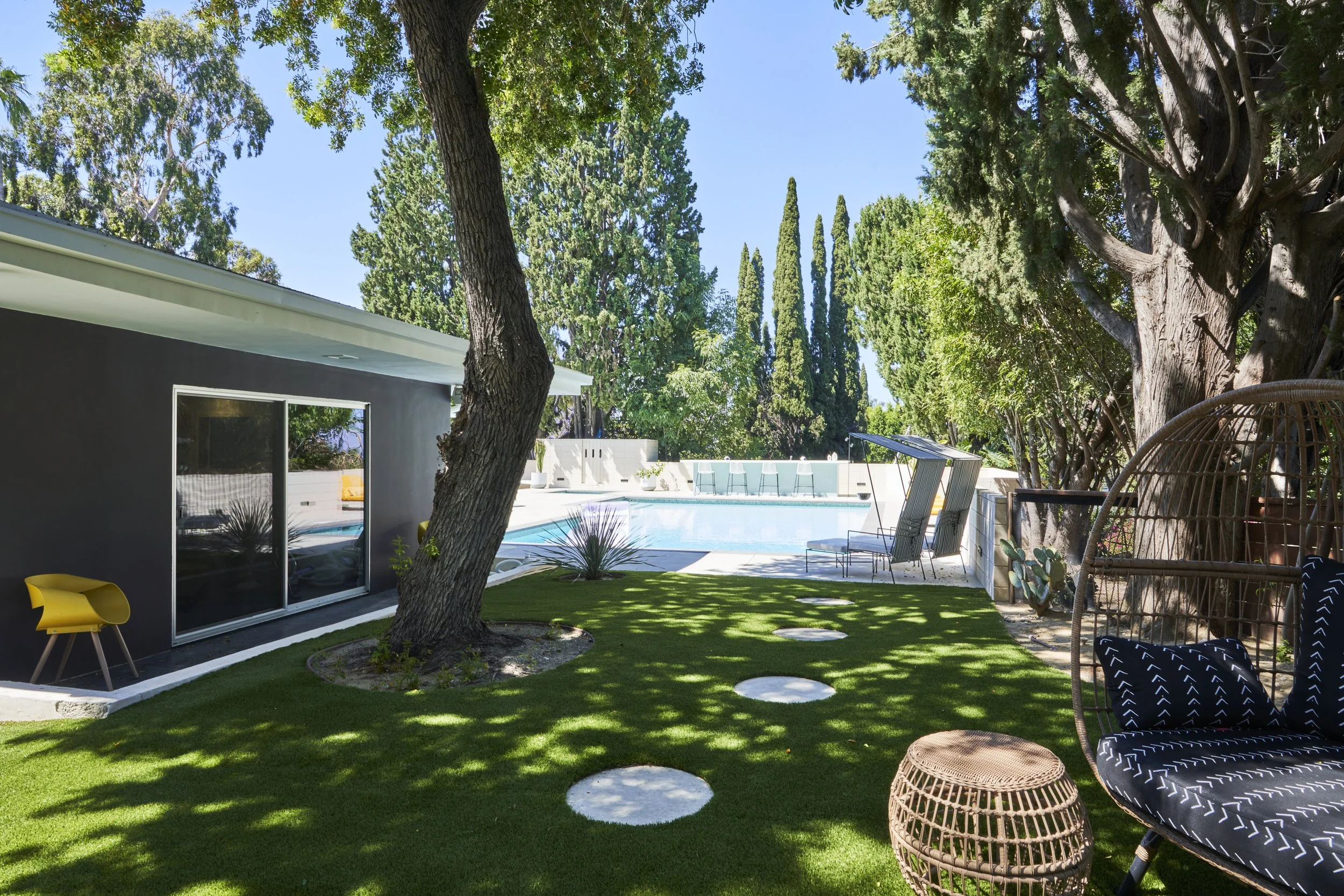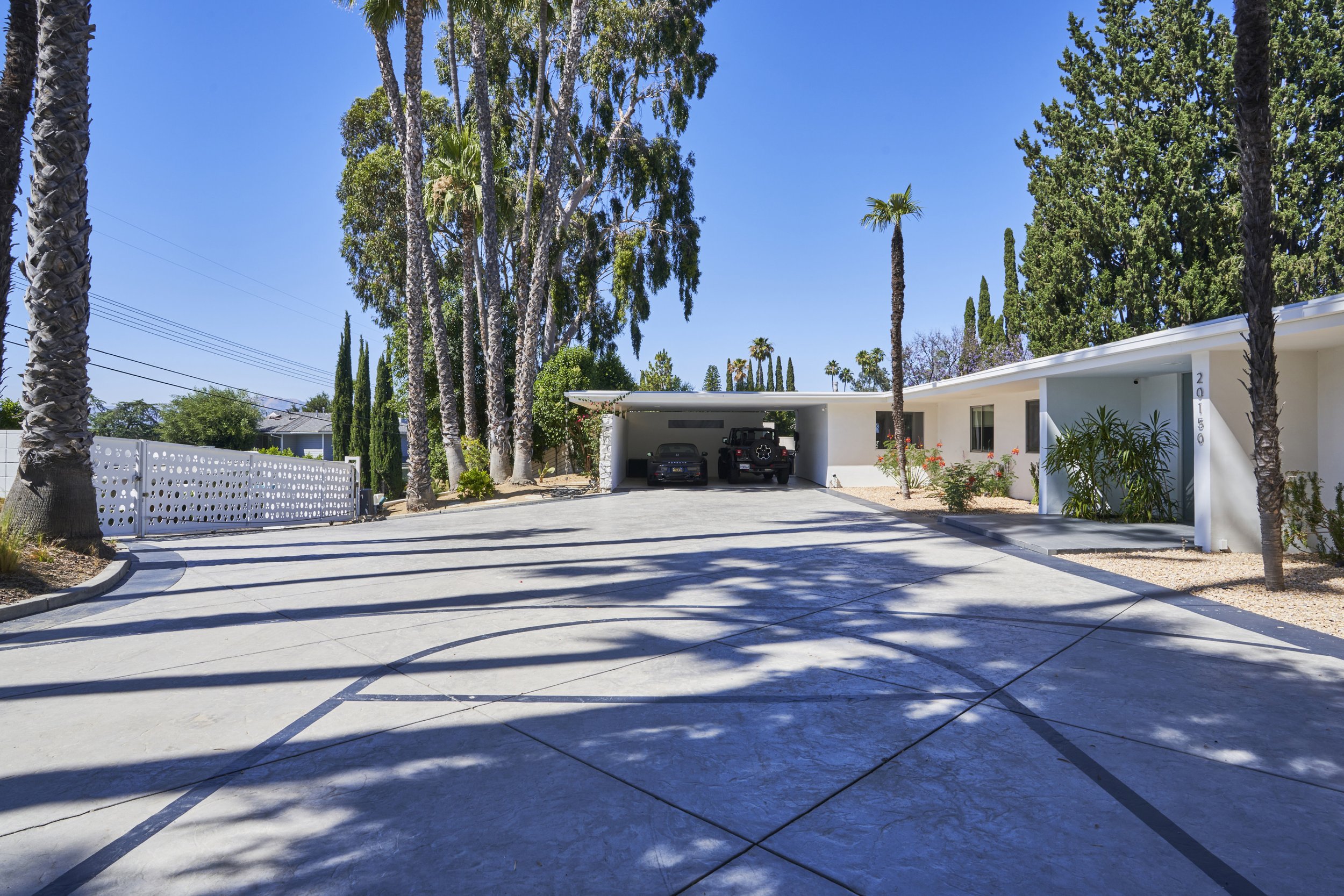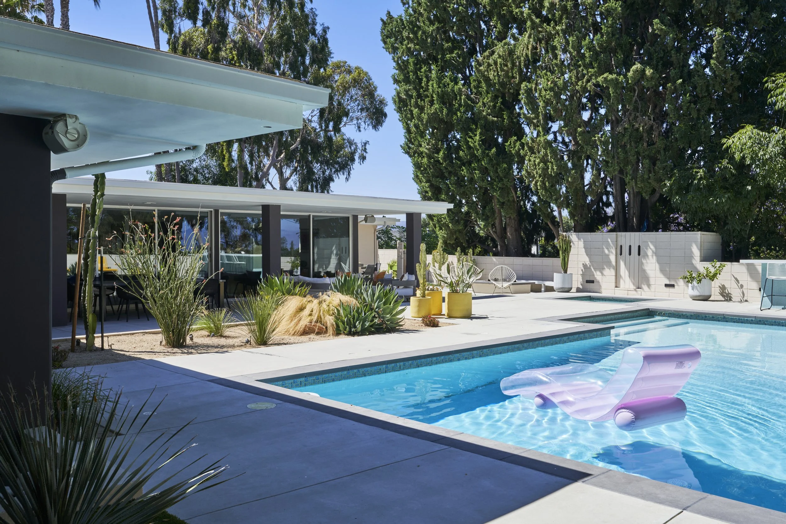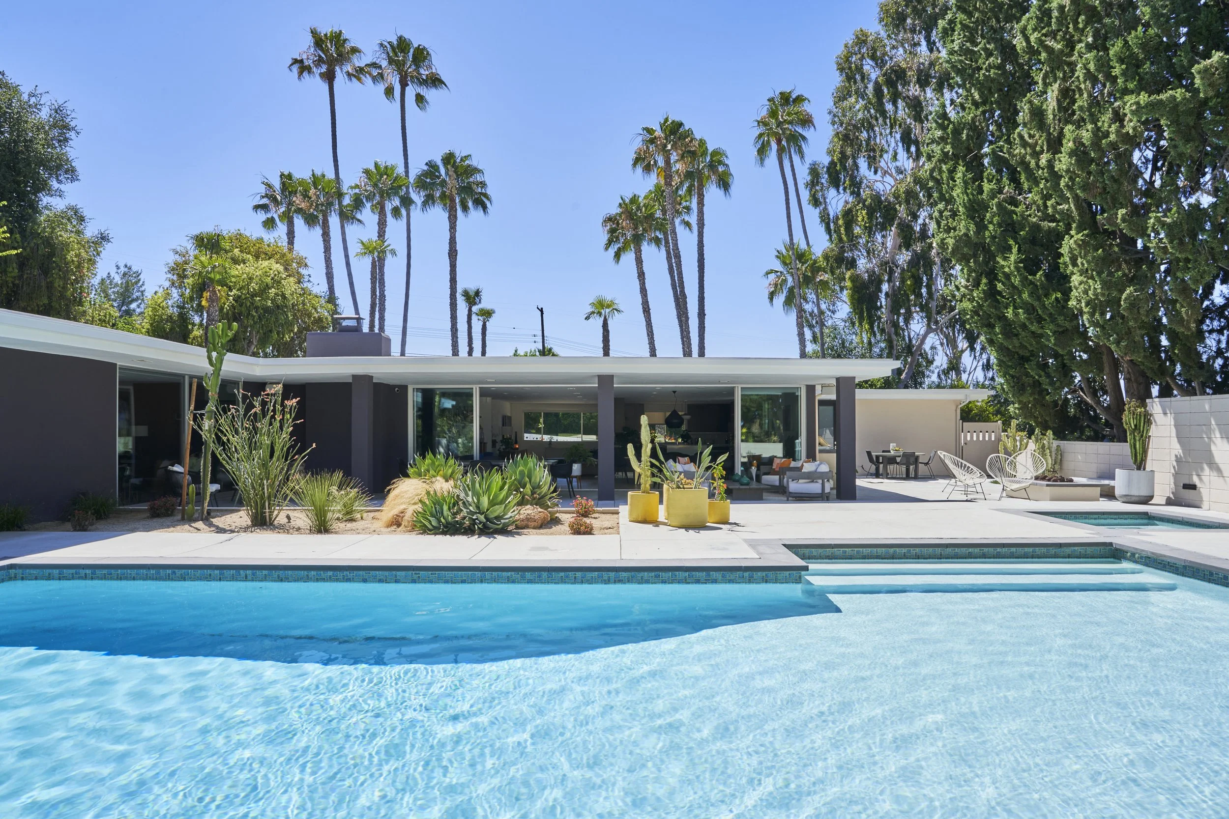 Midcentury Mansion boasts a stunning Palm Springs-like aesthetic, complete with breathtaking views of swaying palm trees, exceptional cement work, and an inviting pool area. The eclectic decor pays homage to its Mid-Century roots while also incorporating contemporary elements to ensure that the space feels fresh and current.