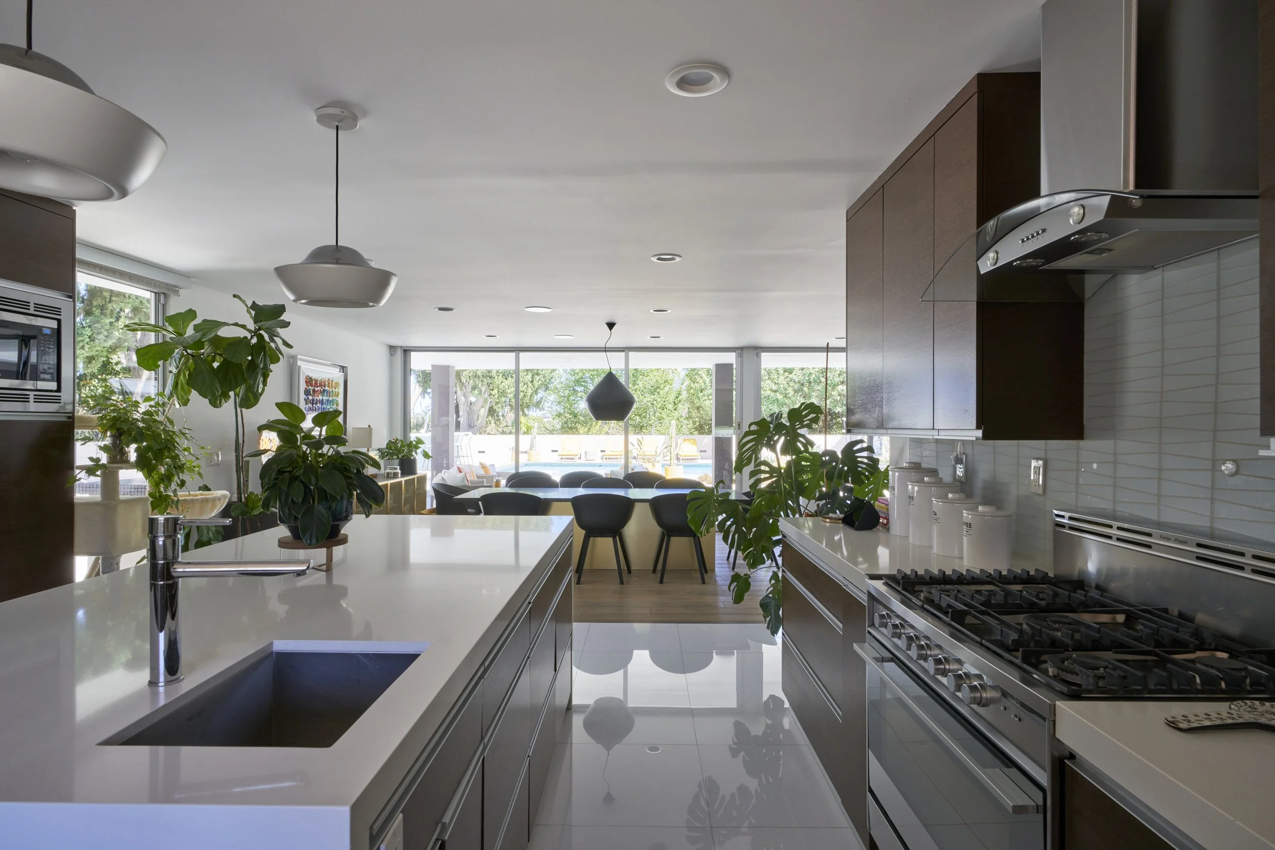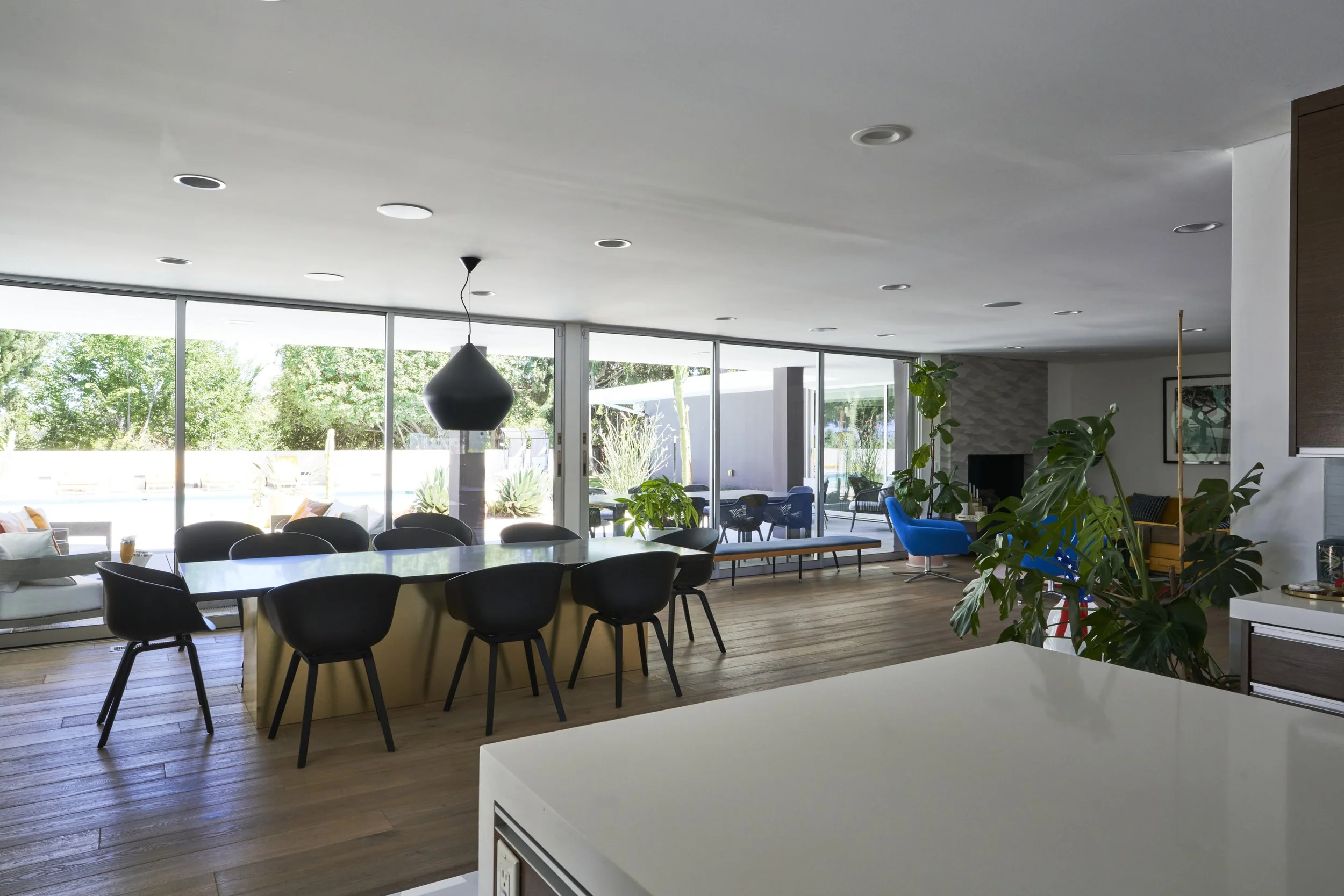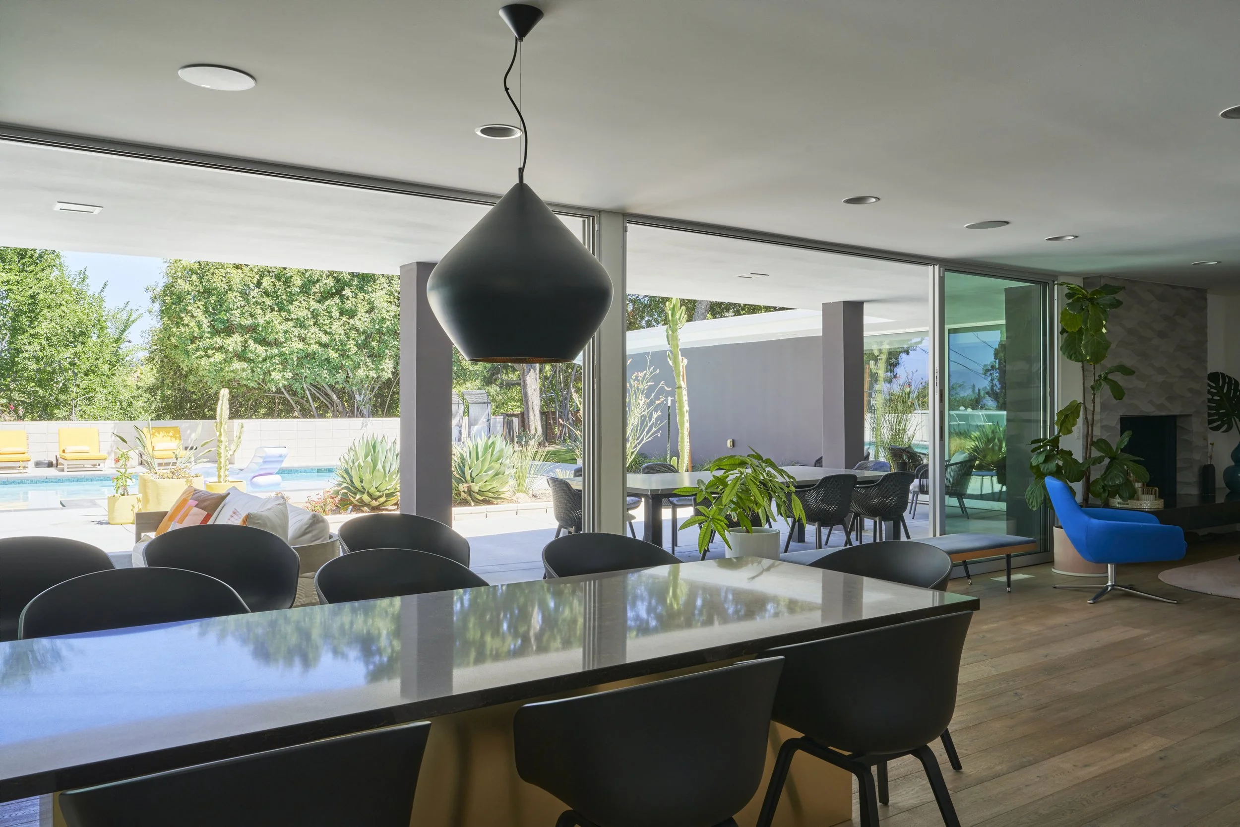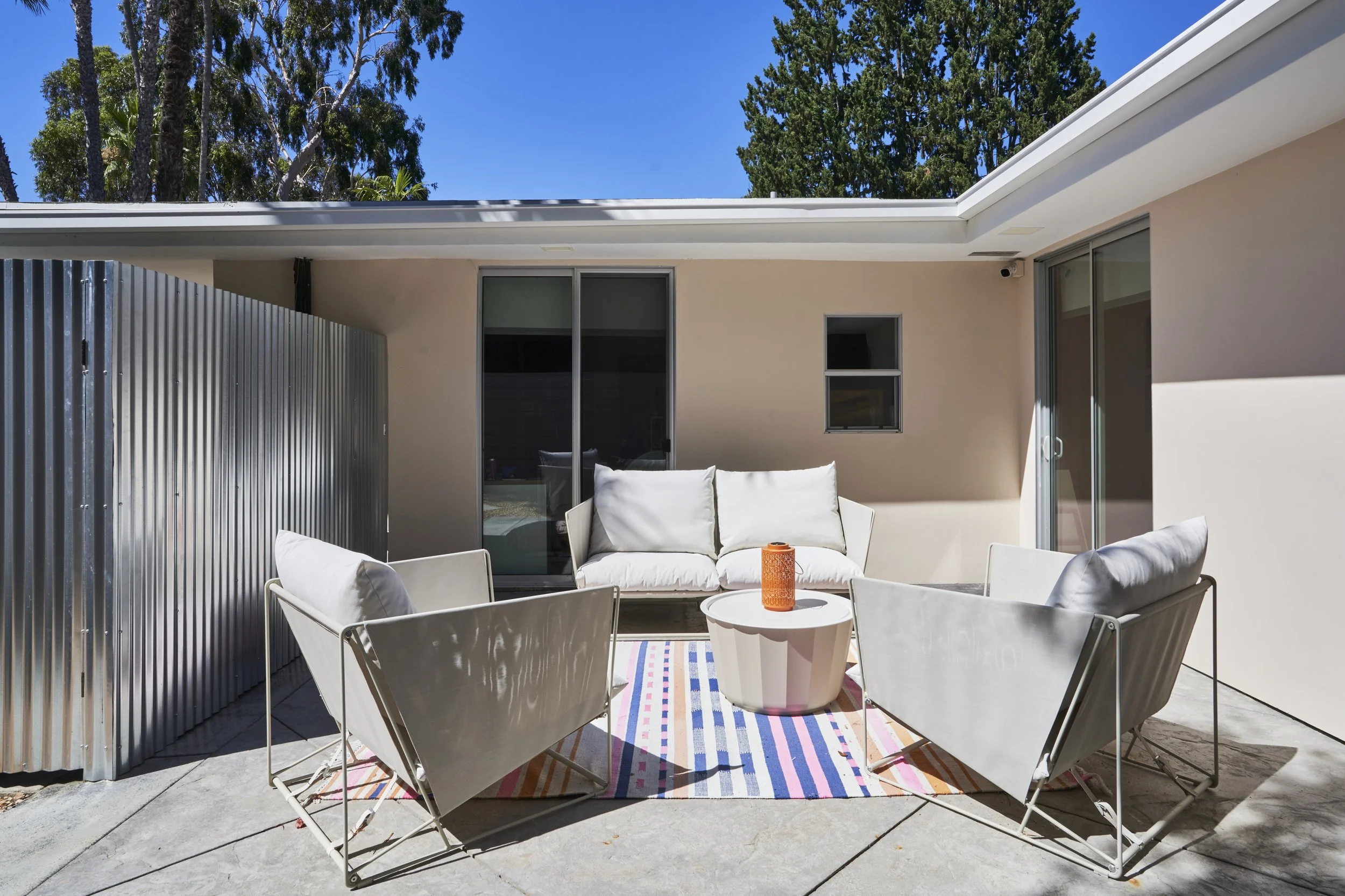 Midcentury Mansion boasts a stunning Palm Springs-like aesthetic, complete with breathtaking views of swaying palm trees, exceptional cement work, and an inviting pool area. The eclectic decor pays homage to its Mid-Century roots while also incorporating contemporary elements to ensure that the space feels fresh and current.