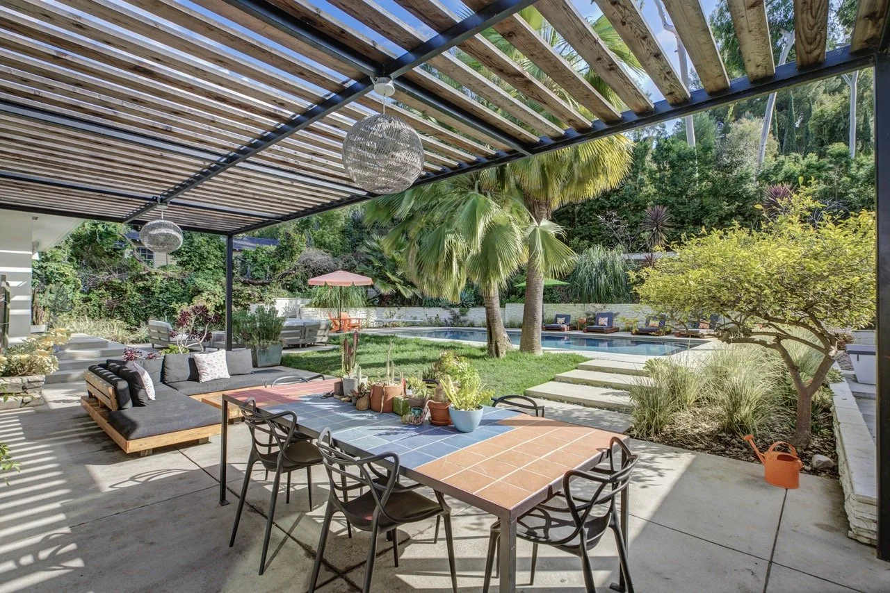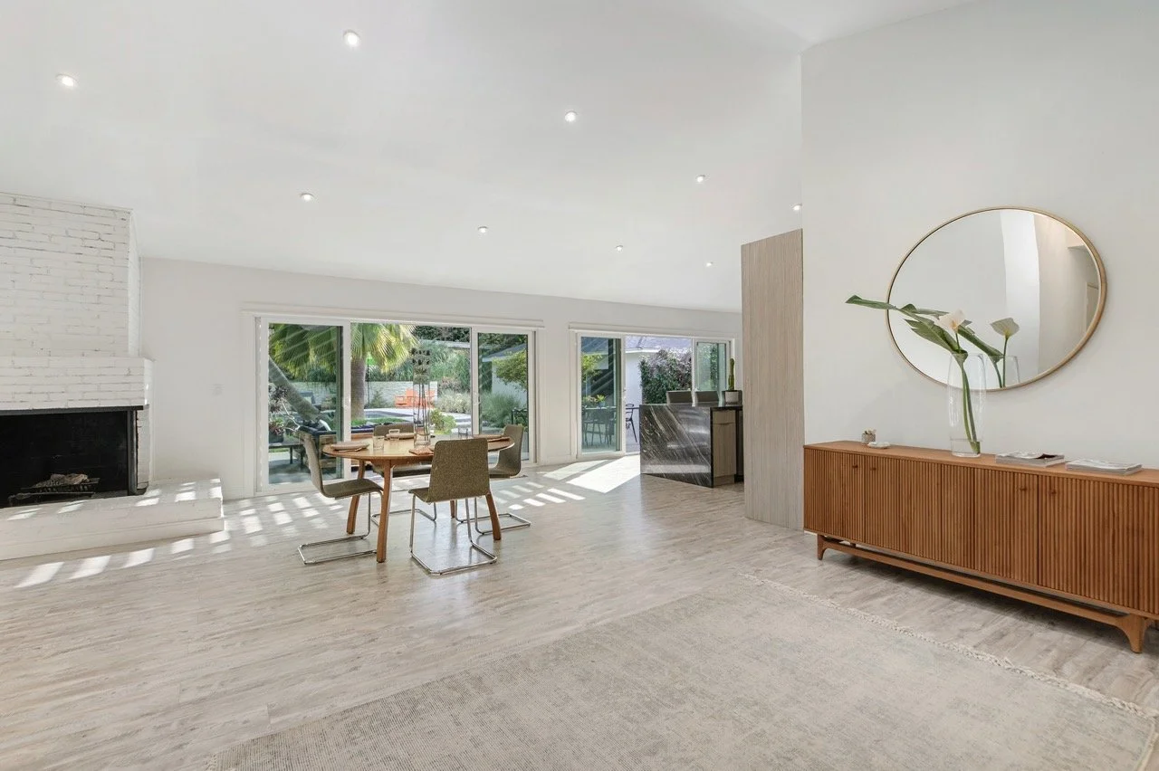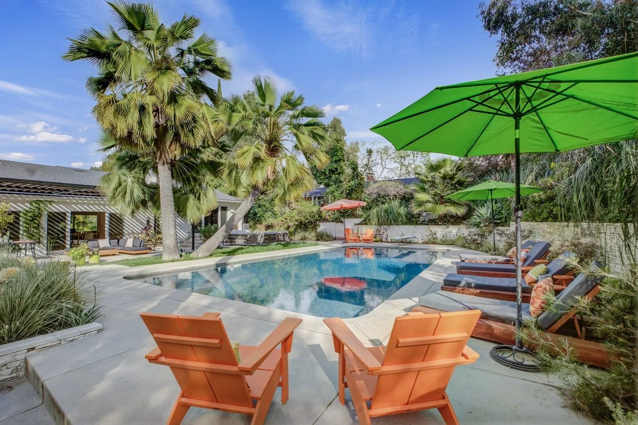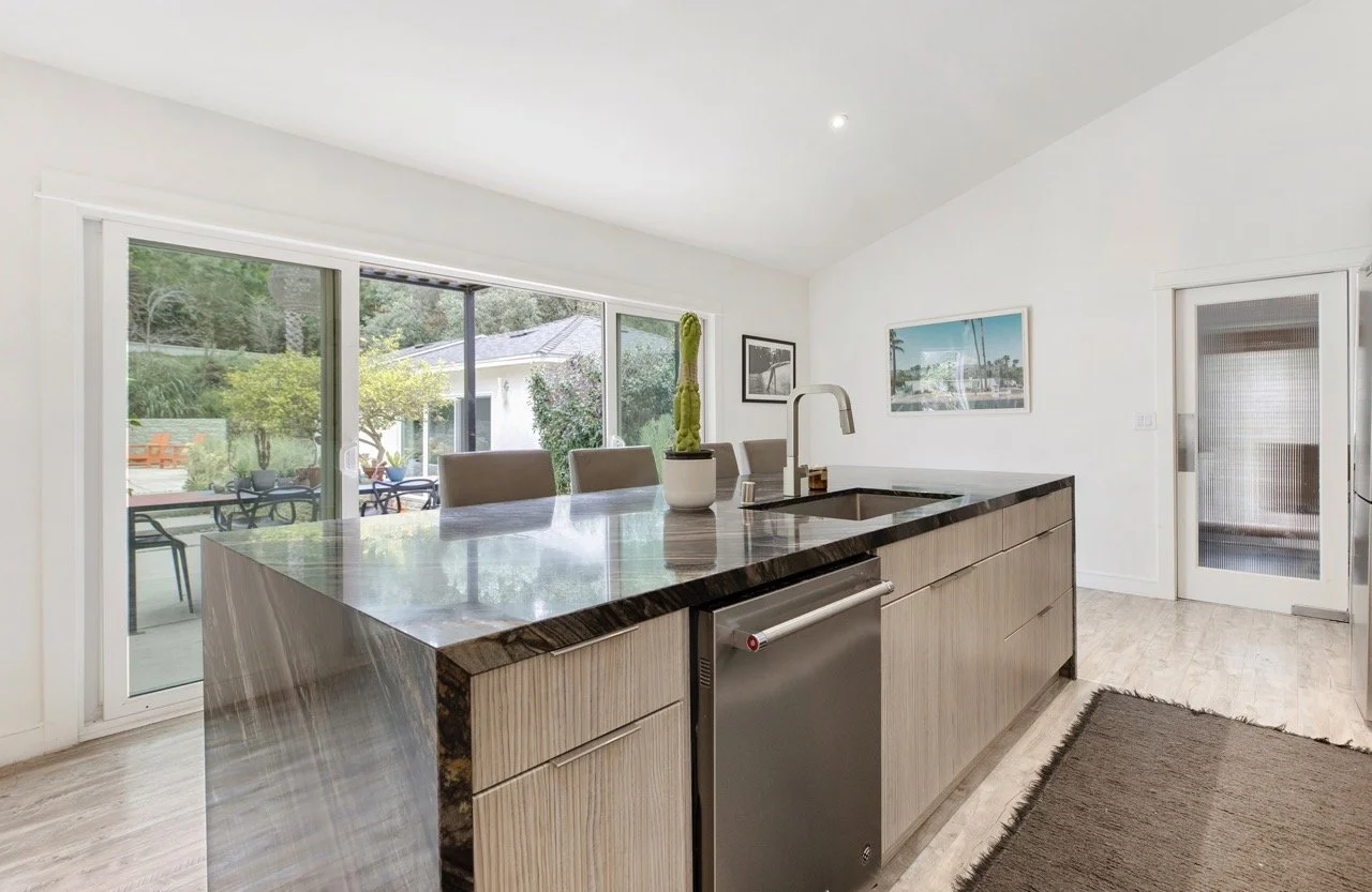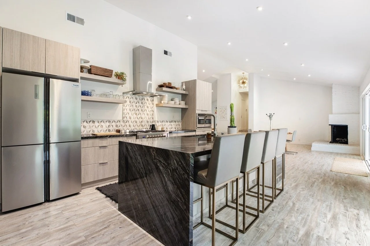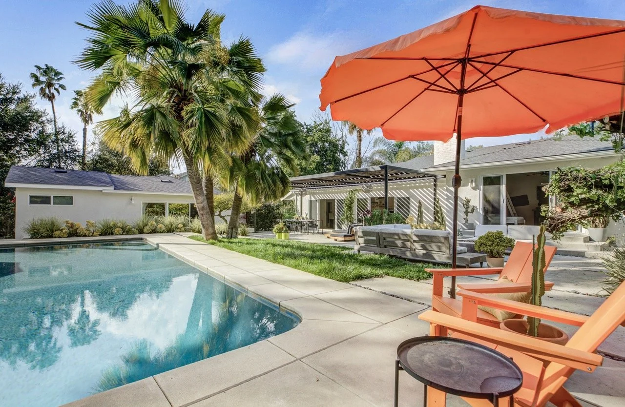Palm Springs meets Studio City in this amazing, fully renovated home with a modern open floor plan and one of the best backyards you can imagine! The moment you enter you get a dramatic view of the resort-like pool and grounds. Living room with high vaulted ceilings and a supercool stovepipe fireplace, dining area, and a second fireplace round out the public spaces and look into the backyard beyond. Amazing kitchen with center island/breakfast bar, marble counters, custom cabinets and high end appliances opens directly to the pool and yard.