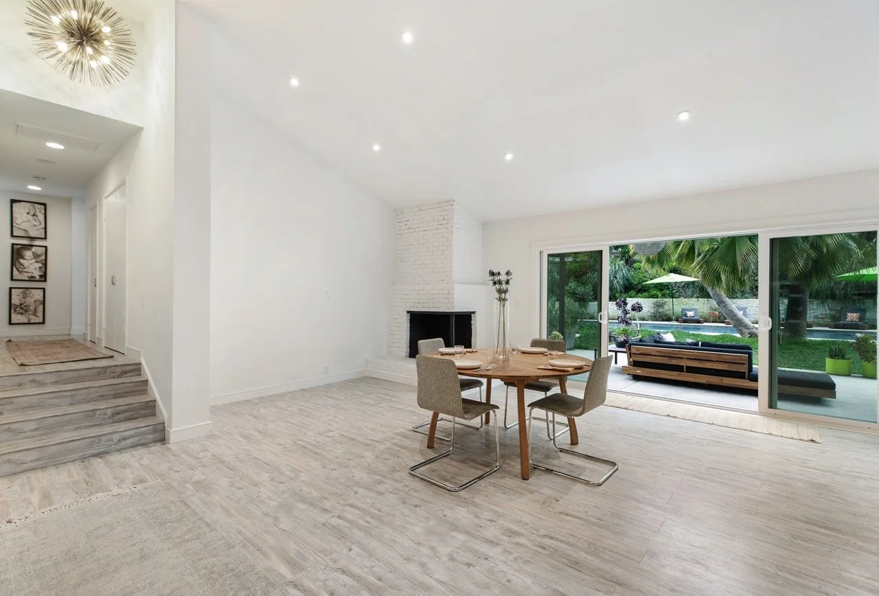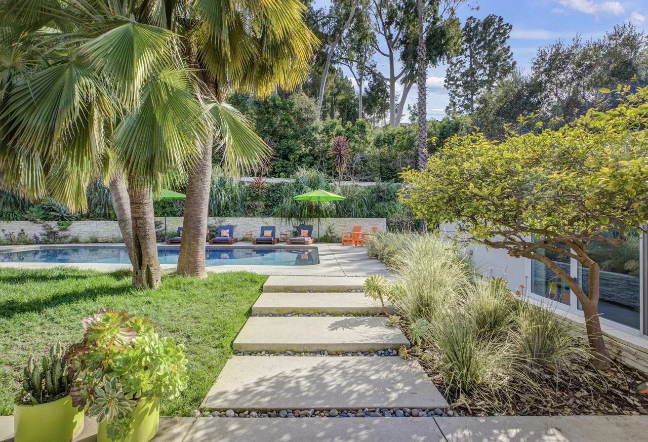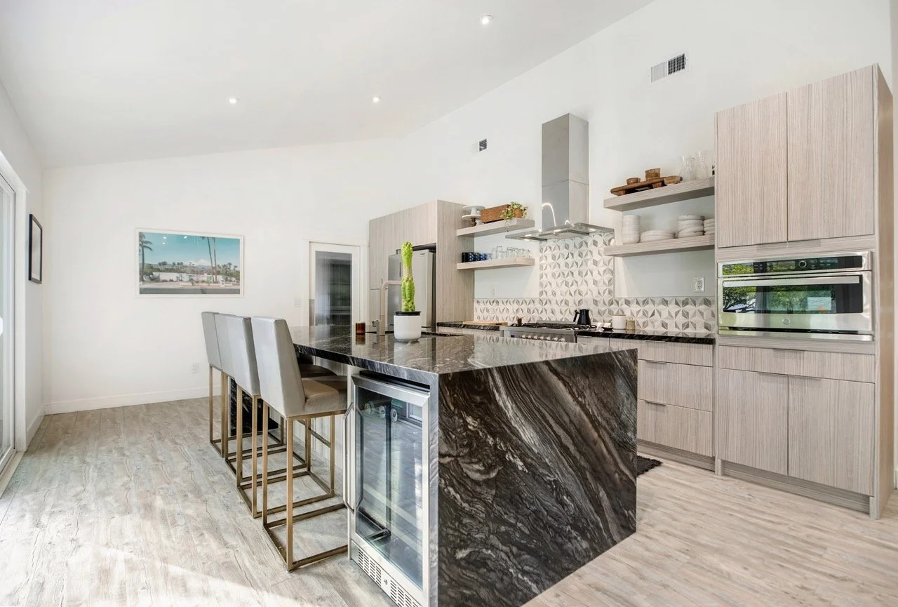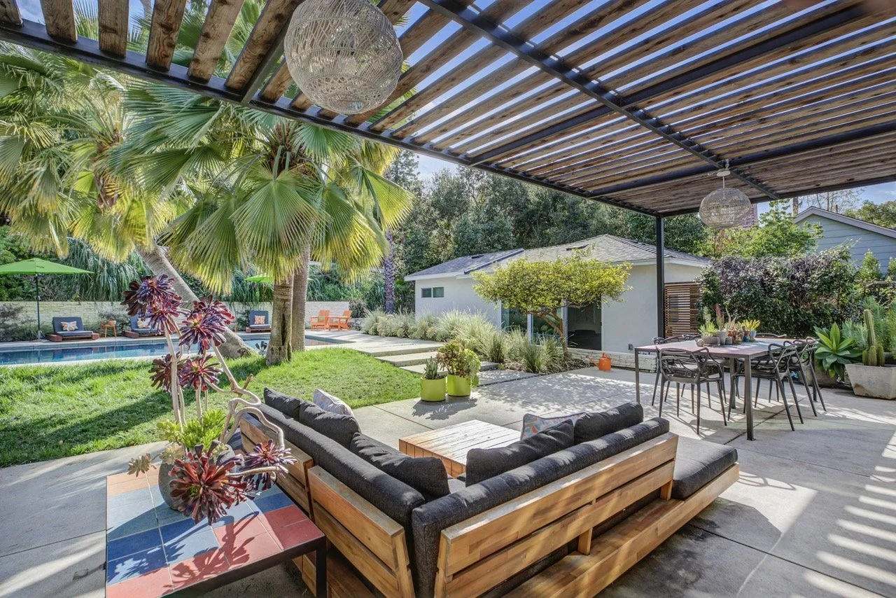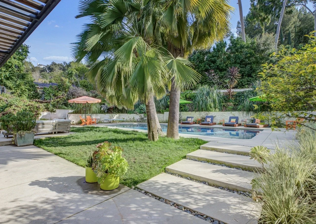 Palm Springs meets Studio City in this amazing, fully renovated home with a modern open floor plan and one of the best backyards you can imagine! The moment you enter you get a dramatic view of the resort-like pool and grounds. Living room with high vaulted ceilings and a supercool stovepipe fireplace, dining area, and a second fireplace round out the public spaces and look into the backyard beyond. Amazing kitchen with center island/breakfast bar, marble counters, custom cabinets and high end appliances opens directly to the pool and yard.