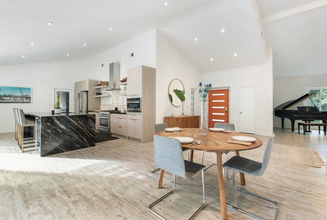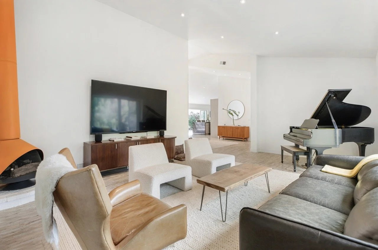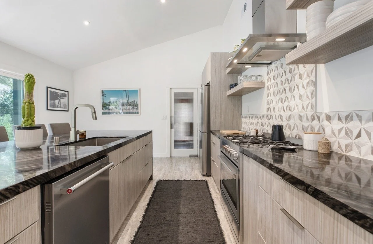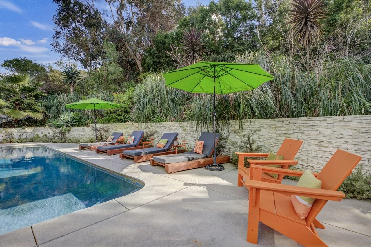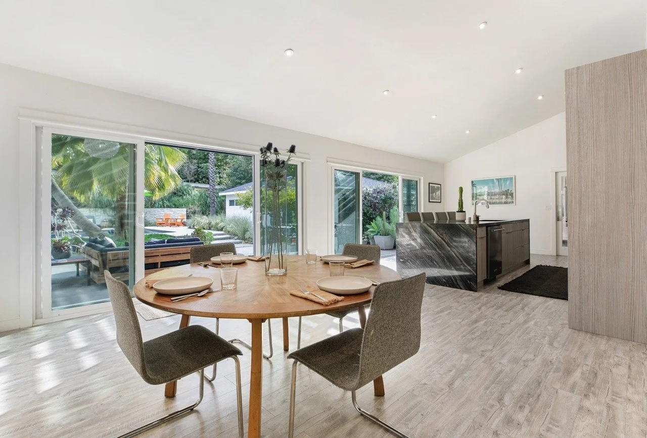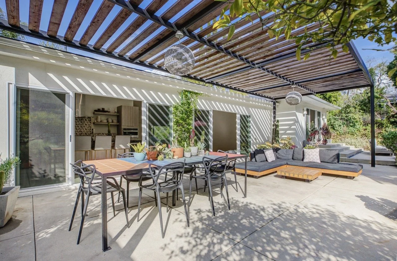 Palm Springs meets Studio City in this amazing, fully renovated home with a modern open floor plan and one of the best backyards you can imagine! The moment you enter you get a dramatic view of the resort-like pool and grounds. Living room with high vaulted ceilings and a supercool stovepipe fireplace, dining area, and a second fireplace round out the public spaces and look into the backyard beyond. Amazing kitchen with center island/breakfast bar, marble counters, custom cabinets and high end appliances opens directly to the pool and yard.