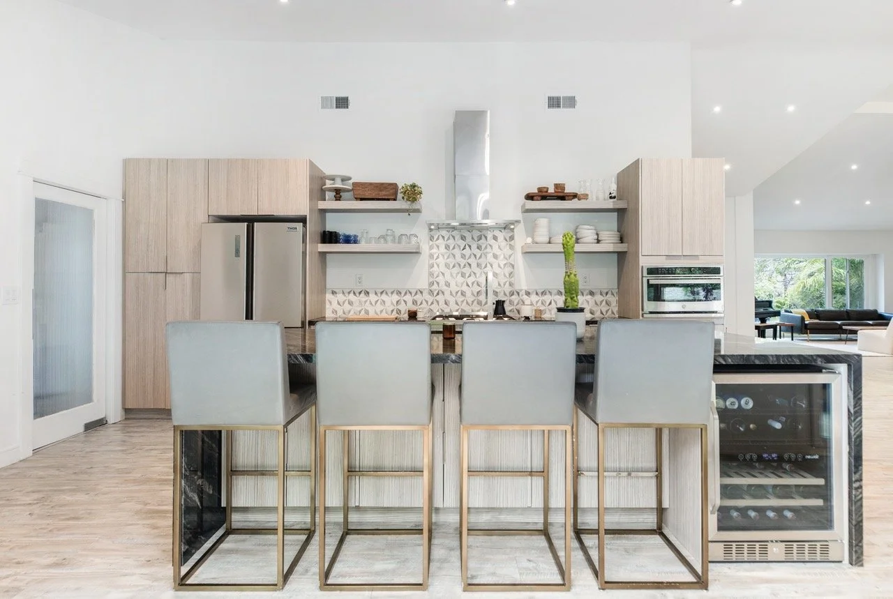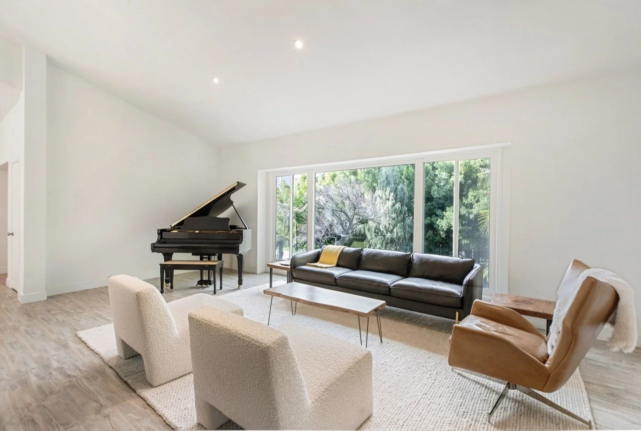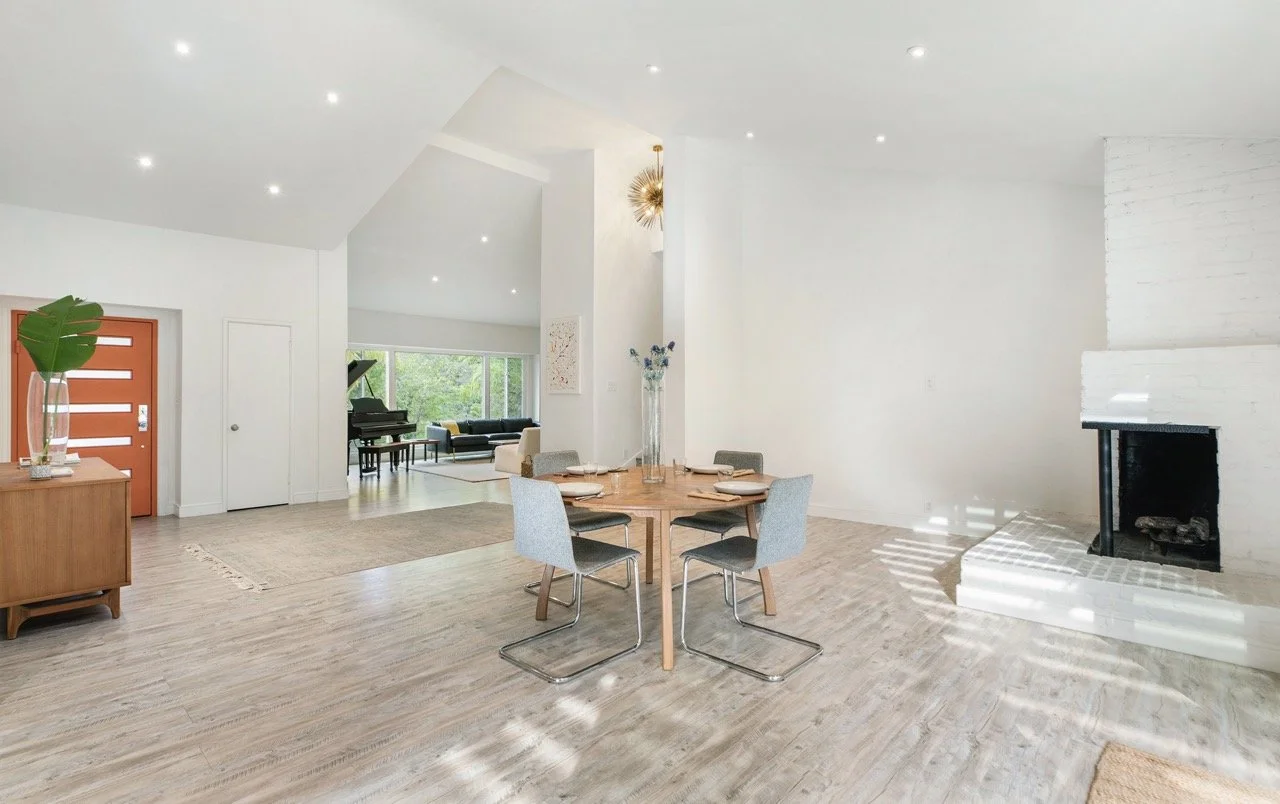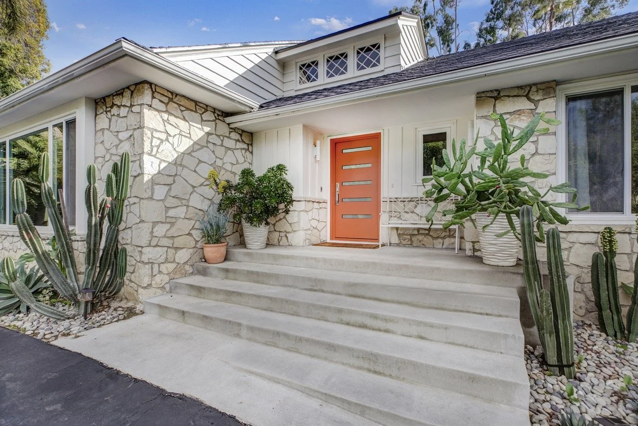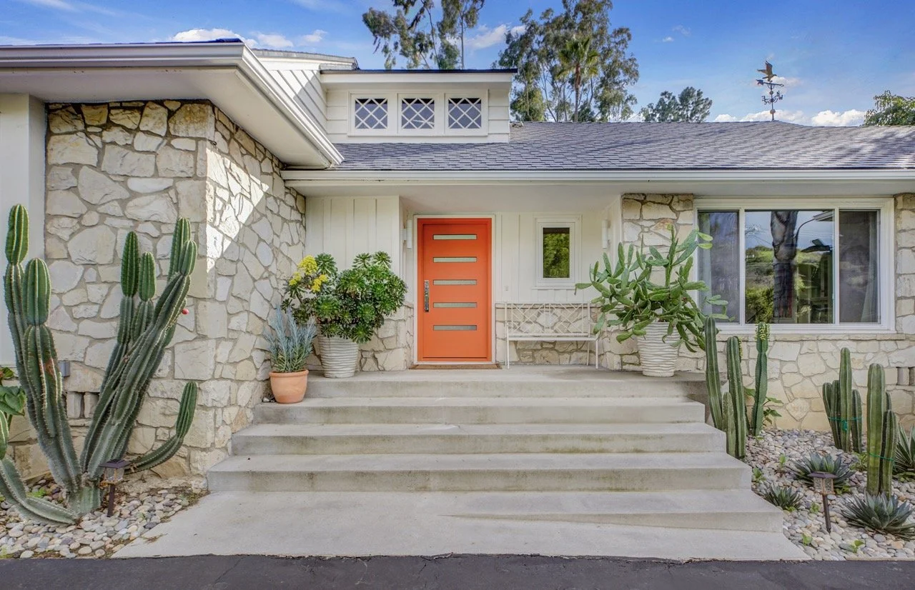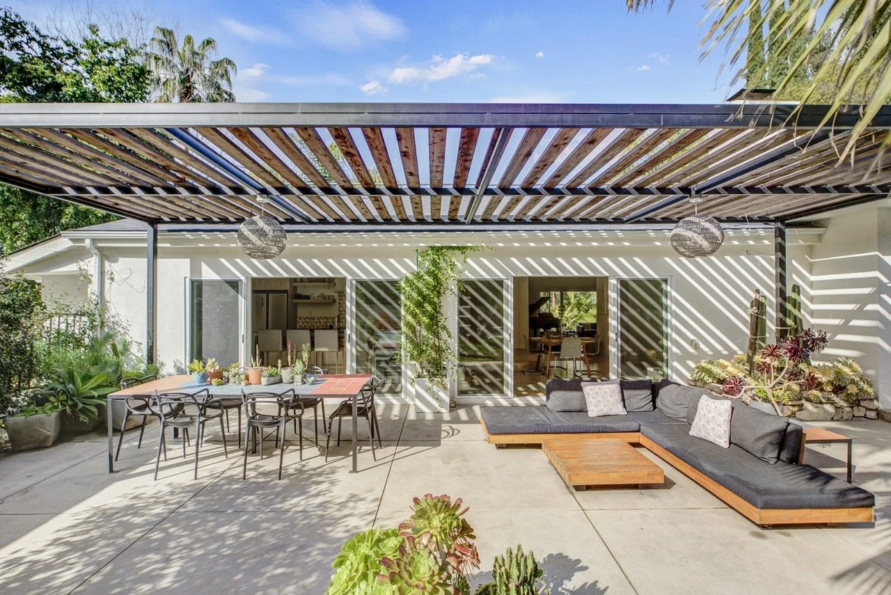 Palm Springs meets Studio City in this amazing, fully renovated home with a modern open floor plan and one of the best backyards you can imagine! The moment you enter you get a dramatic view of the resort-like pool and grounds. Living room with high vaulted ceilings and a supercool stovepipe fireplace, dining area, and a second fireplace round out the public spaces and look into the backyard beyond. Amazing kitchen with center island/breakfast bar, marble counters, custom cabinets and high end appliances opens directly to the pool and yard.