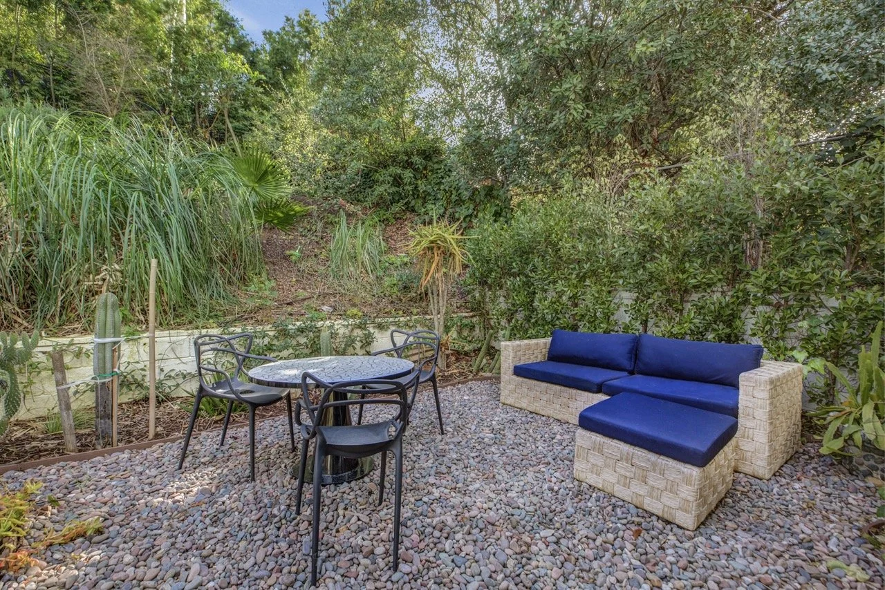 Topping it off is a standalone permitted 600 sq/ft ADU with full kitchen, living room, bathroom and bedroom that opens out to its own patio. Gated circular driveway accommodates off street parking for 8. A private oasis in the City.