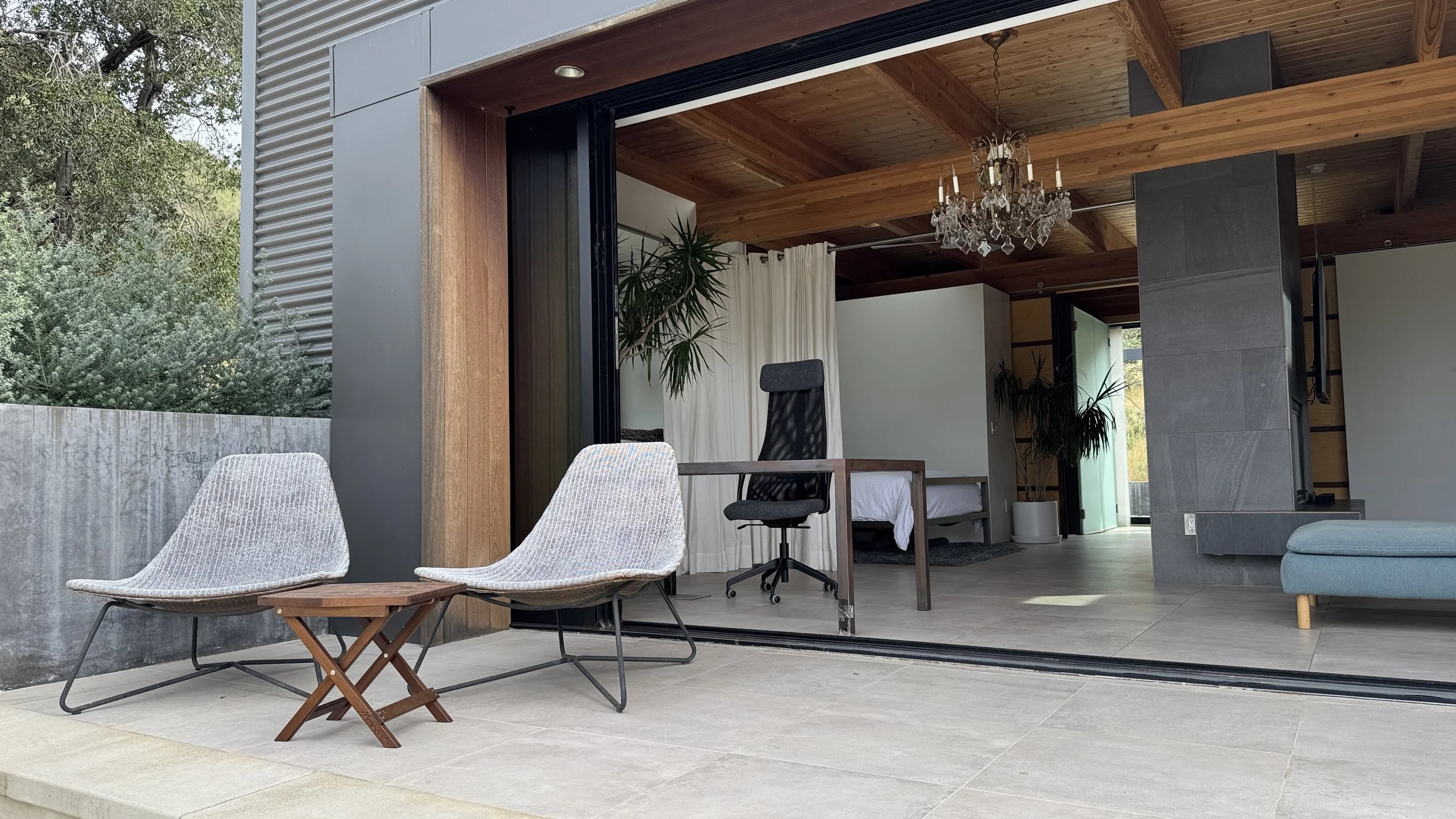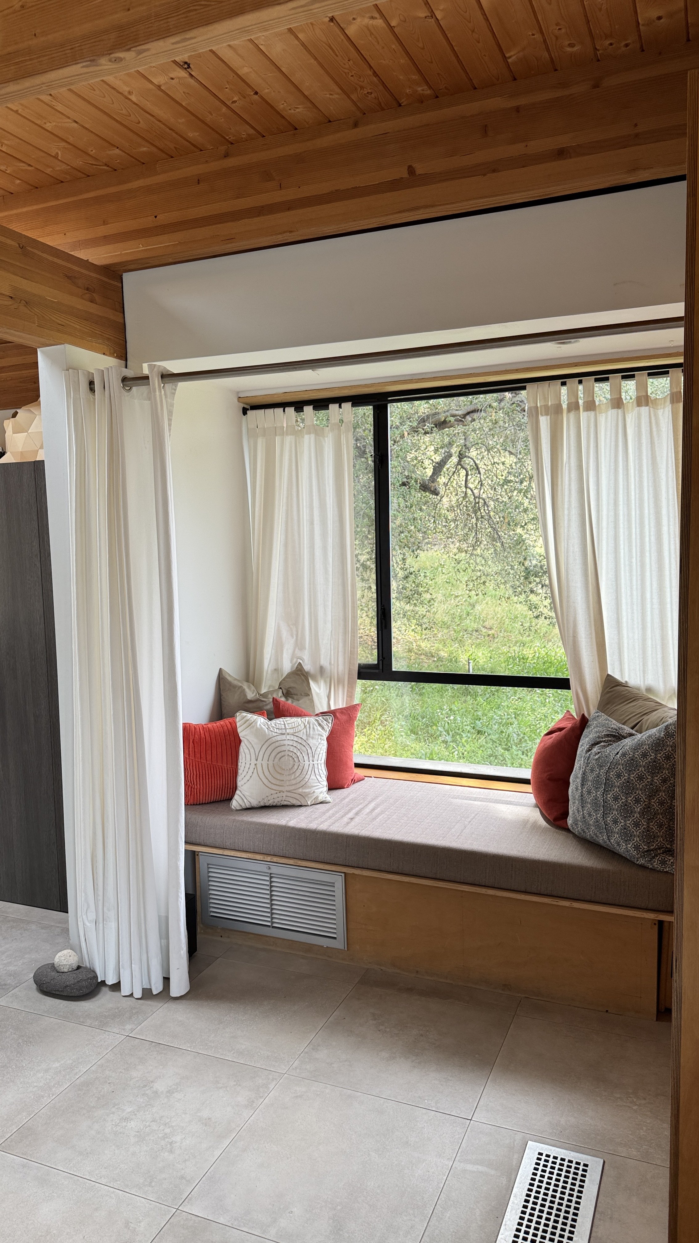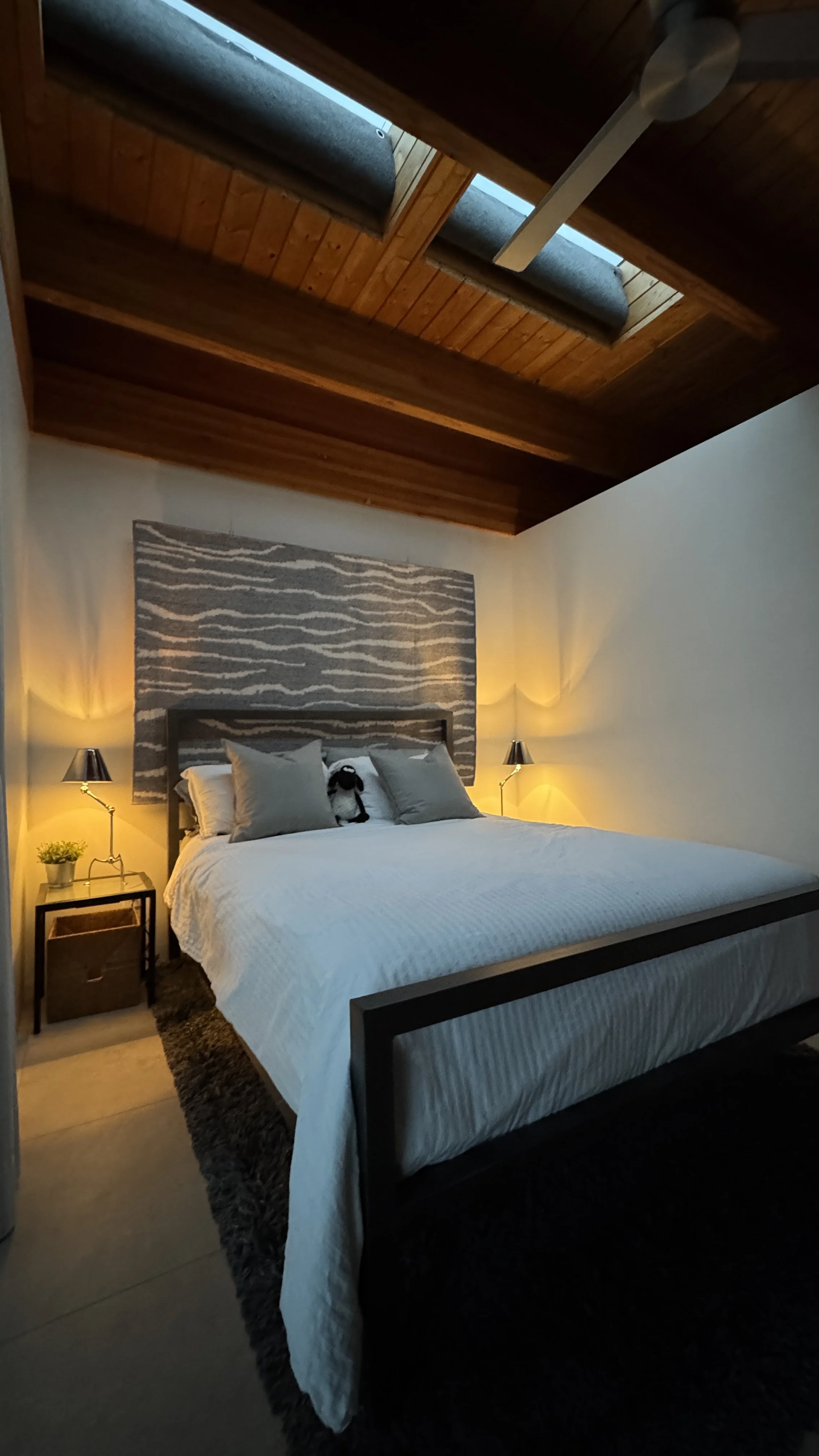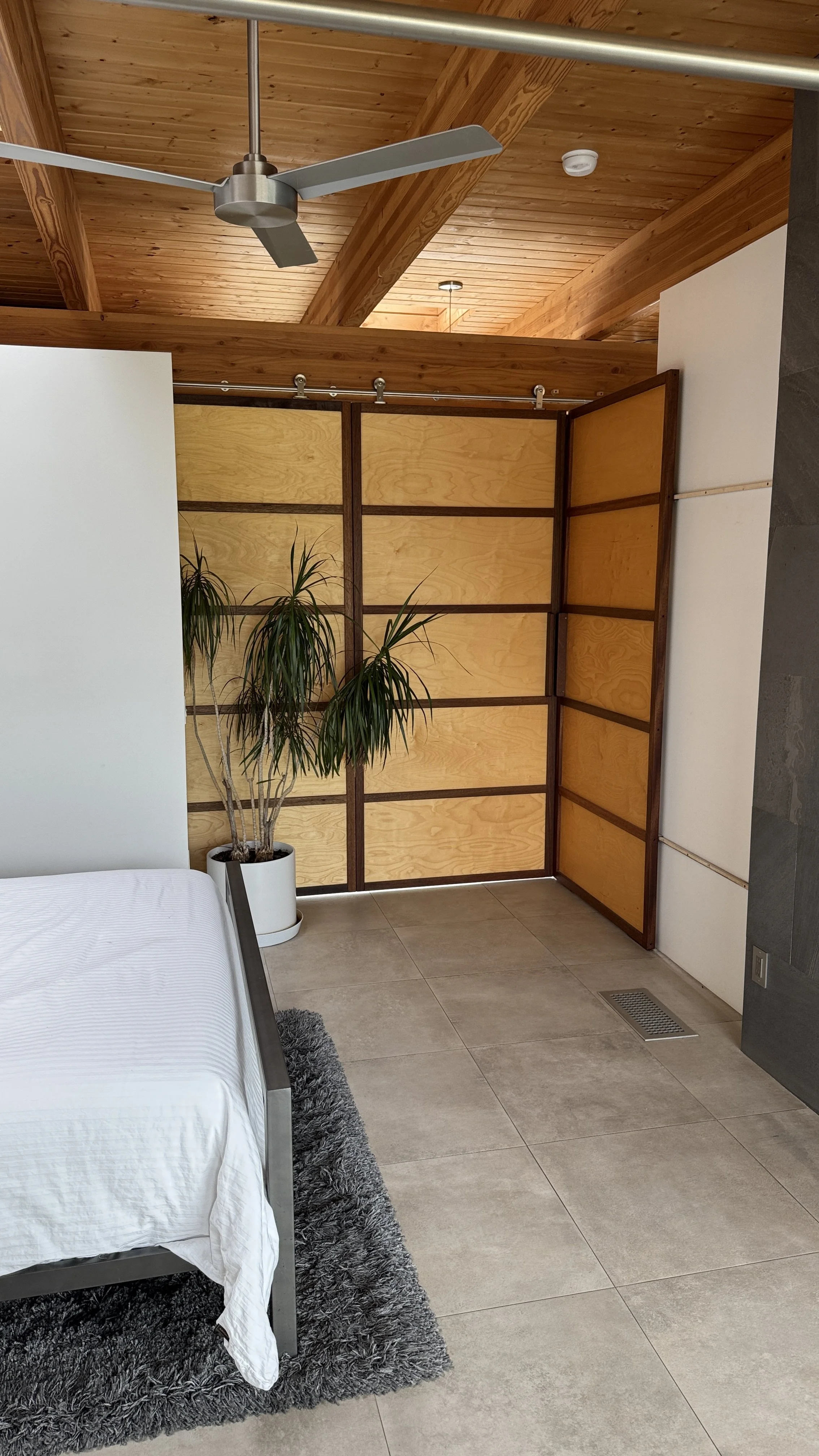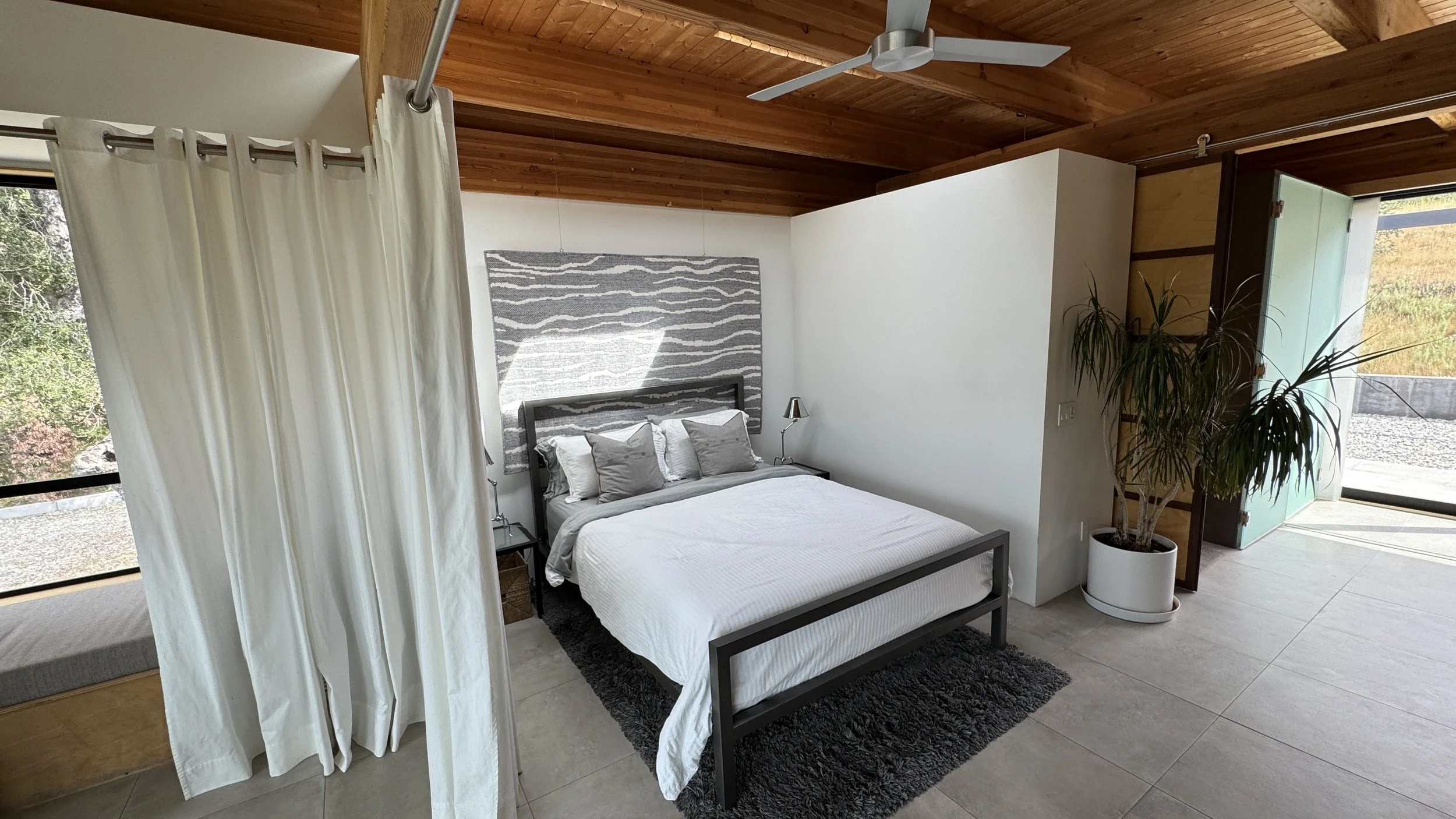 Just north of Mulholland Dr, 15 minutes to the 101 freeway, 20 minutes to downtown Malibu and beach, 45 minutes from Hollywood, the house pulls you in with its open plan interior, inspired by downtown artists lofts and Japanese Shoji style sliding walls, which redefine interior space functionality as needed per shoot. Hidden shower and sink counter are open to the exterior for unique photographic opportunities. Large window seats offer unique feature settings. The bed is open to the exterior for dramatic mood shots with full length curtains to redefine the space as needed. Glass front wall retracts for fluid indoor/outdoor transition shots.