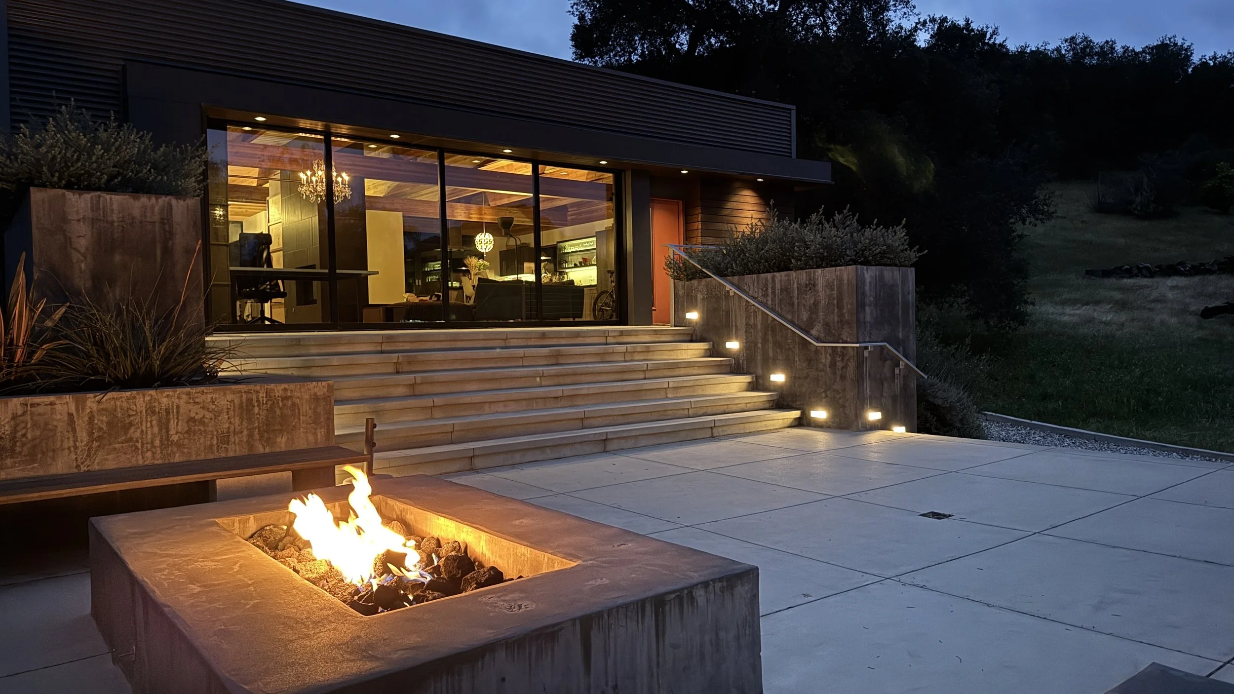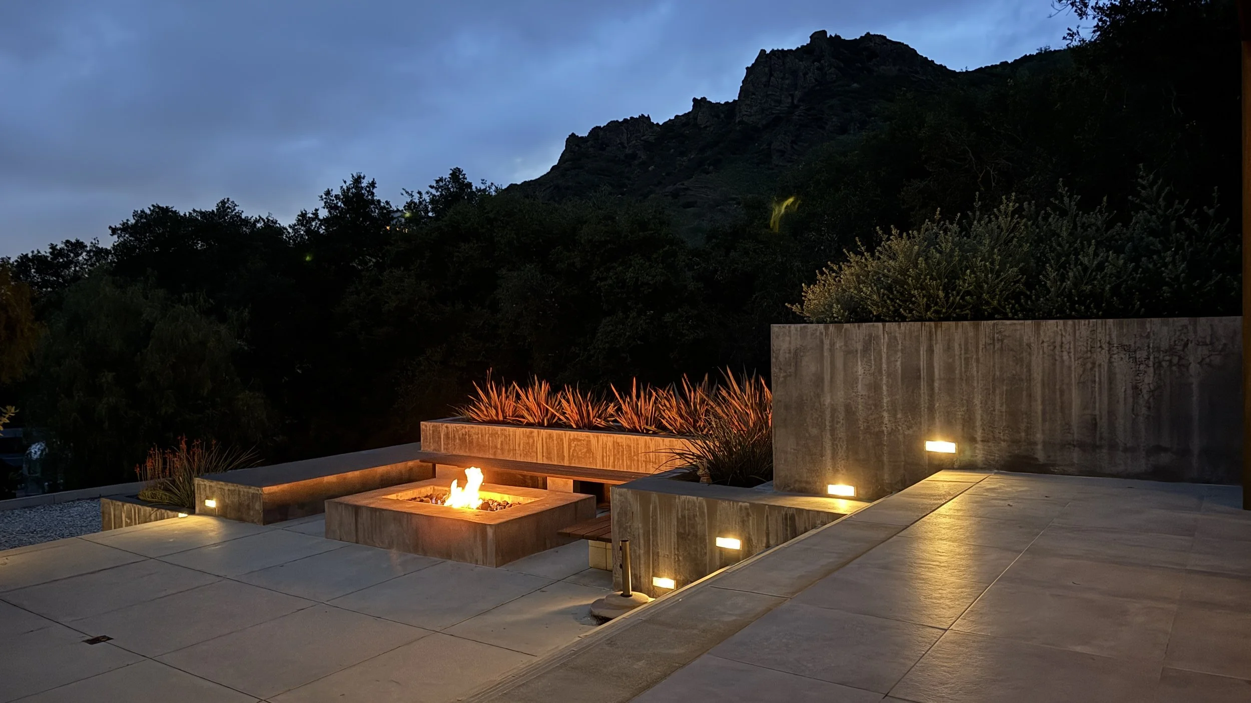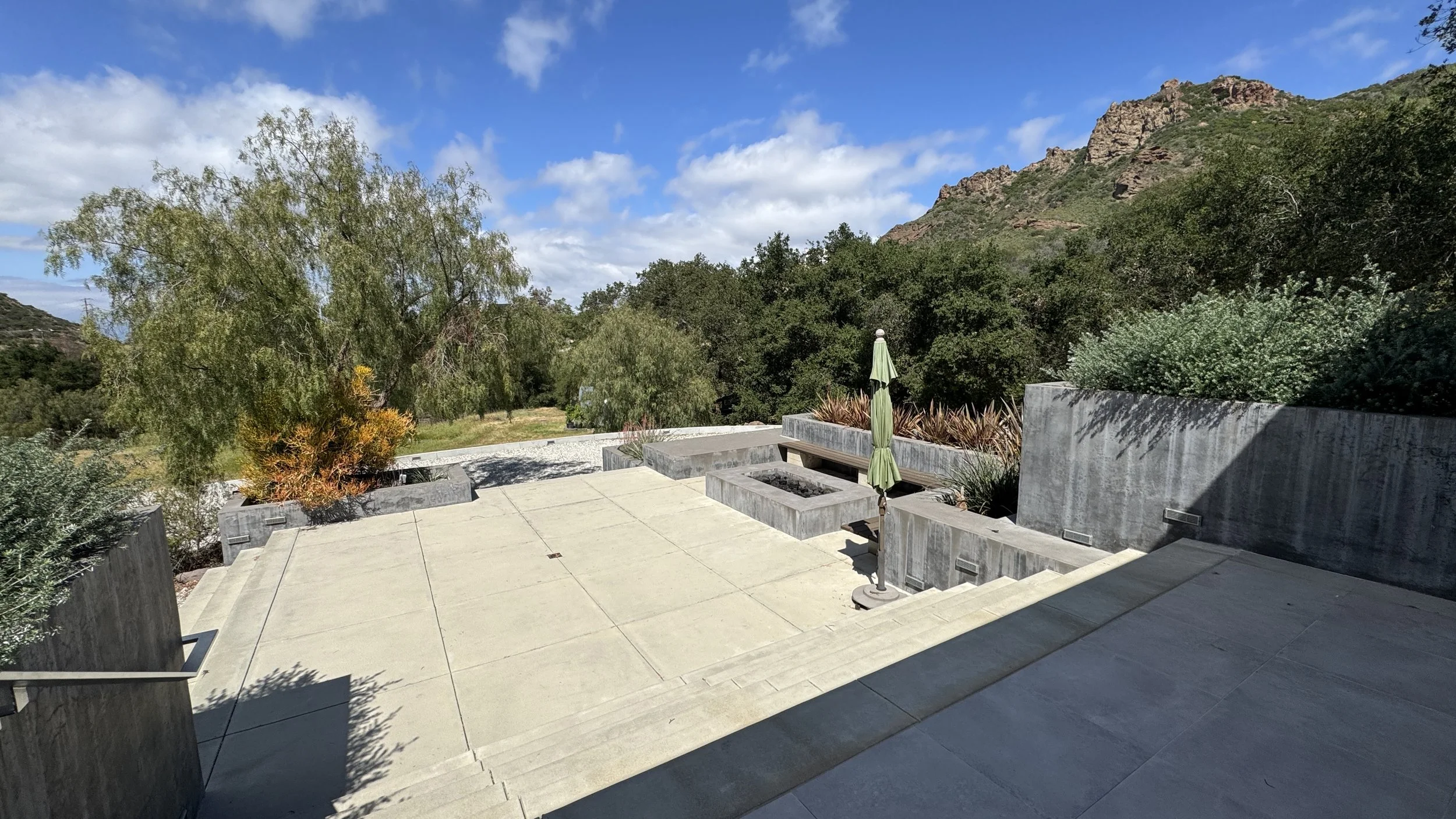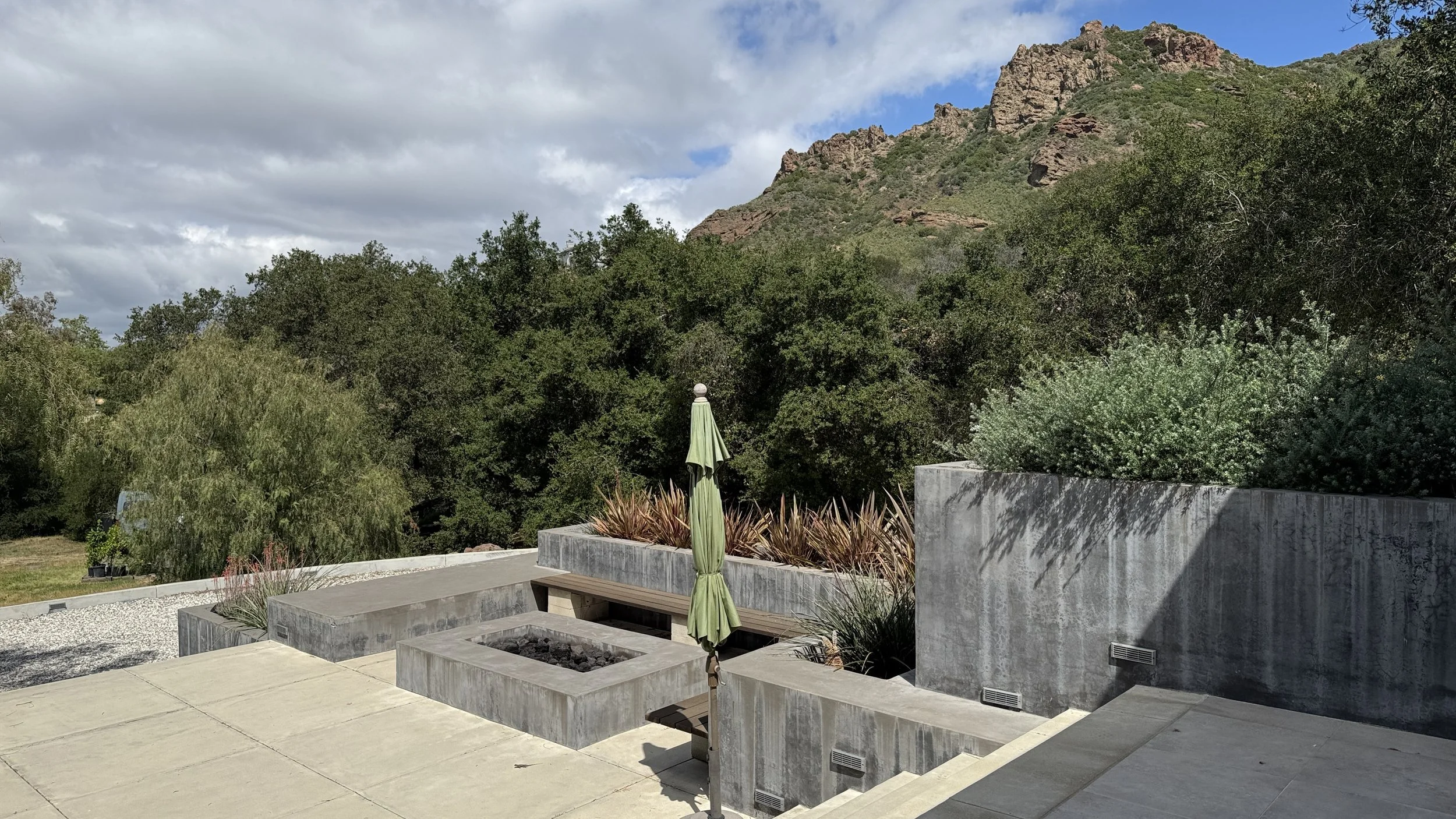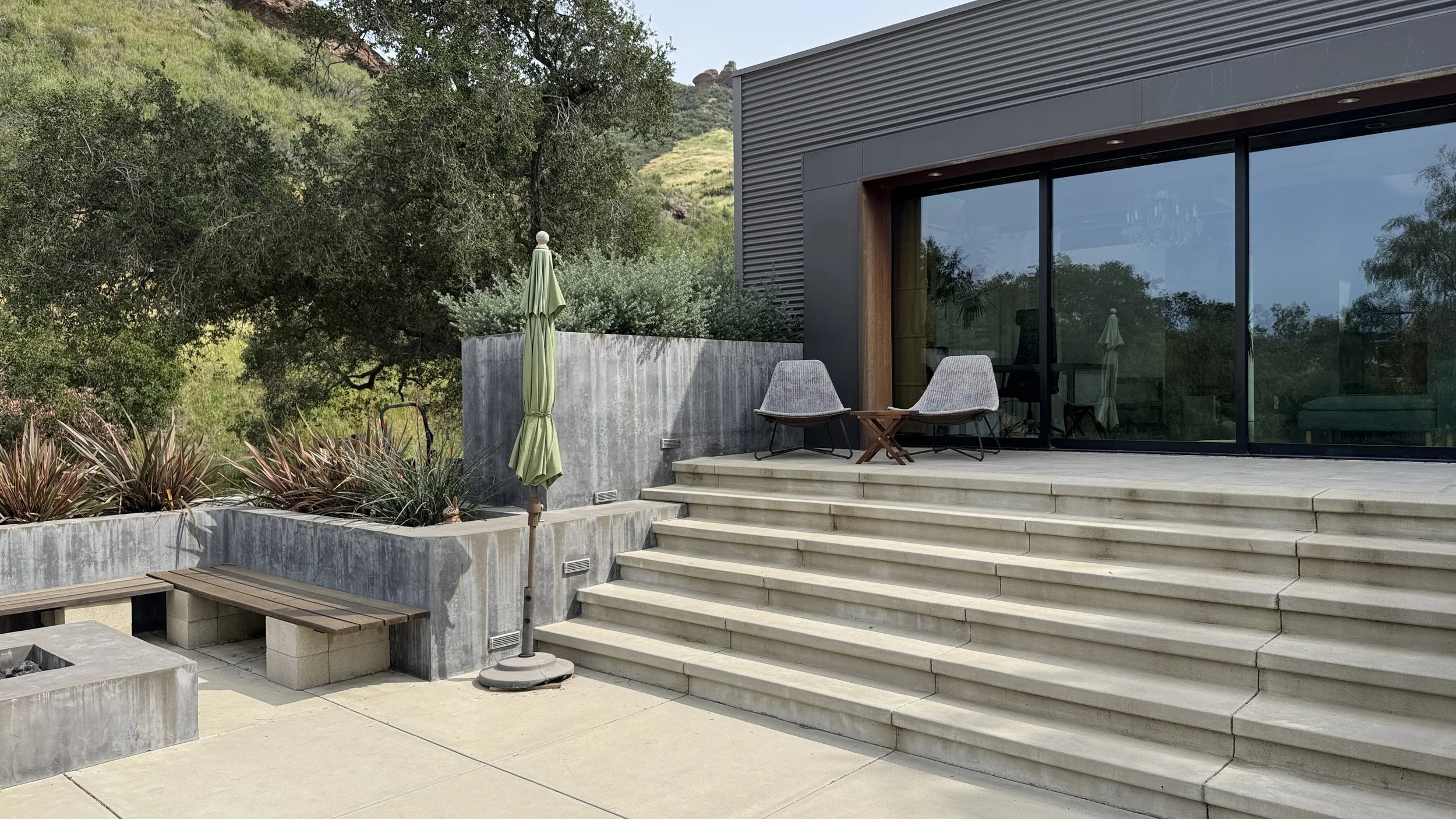 From outside, the house has simple design character, dark grey corrugated steel exterior and flat stucco planters blend with the surroundings. The expansive front patio, with Castlerock mountain as backdrop, is perfect for large, social gathering shoots. Rear patio designed to create character of a German beer garden with long table shared seating. At night, exterior lighting, combined with large fire pit with mountain backdrop and hidden glass walls, create a seamless indoor/outdoor experience.