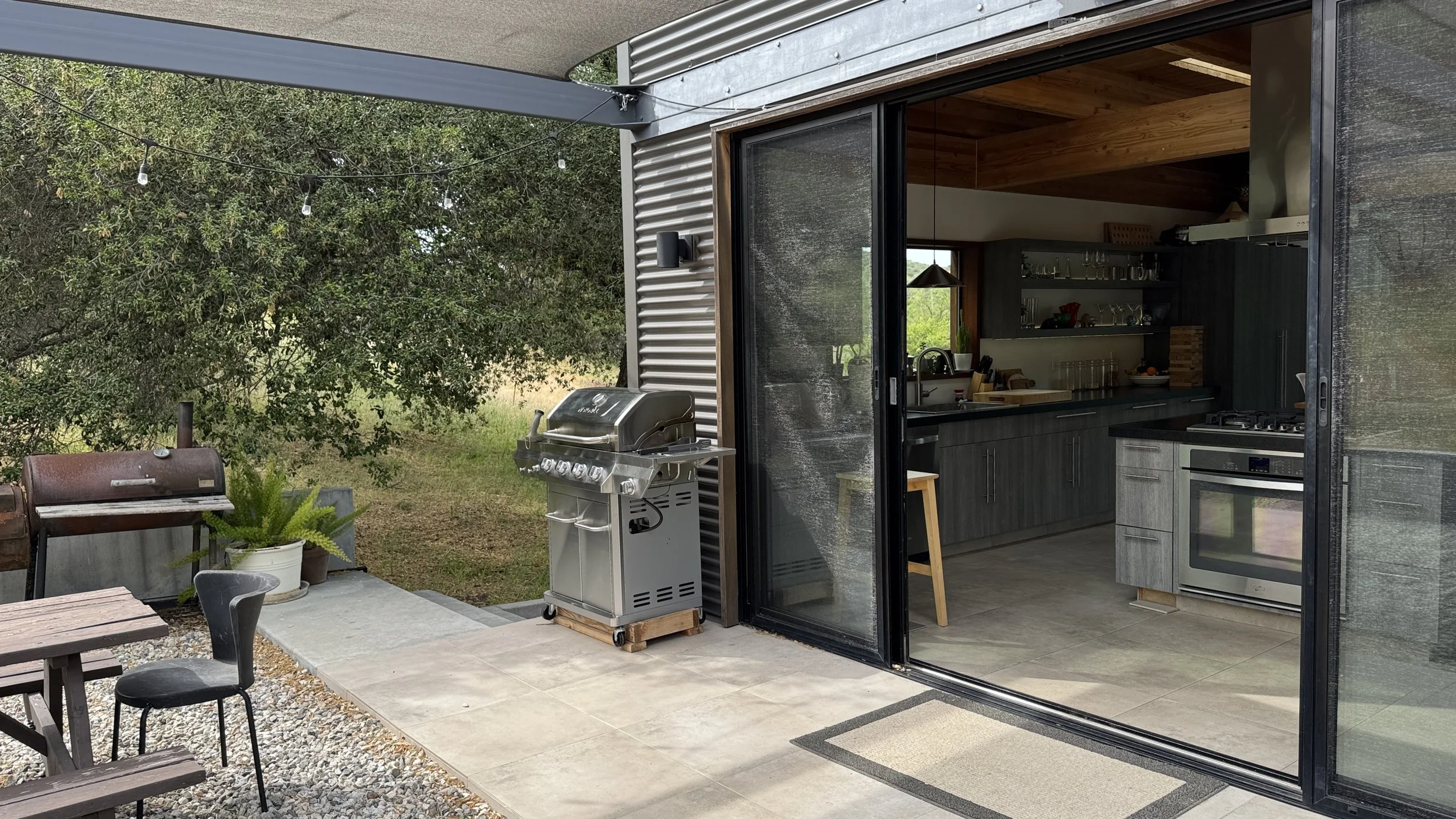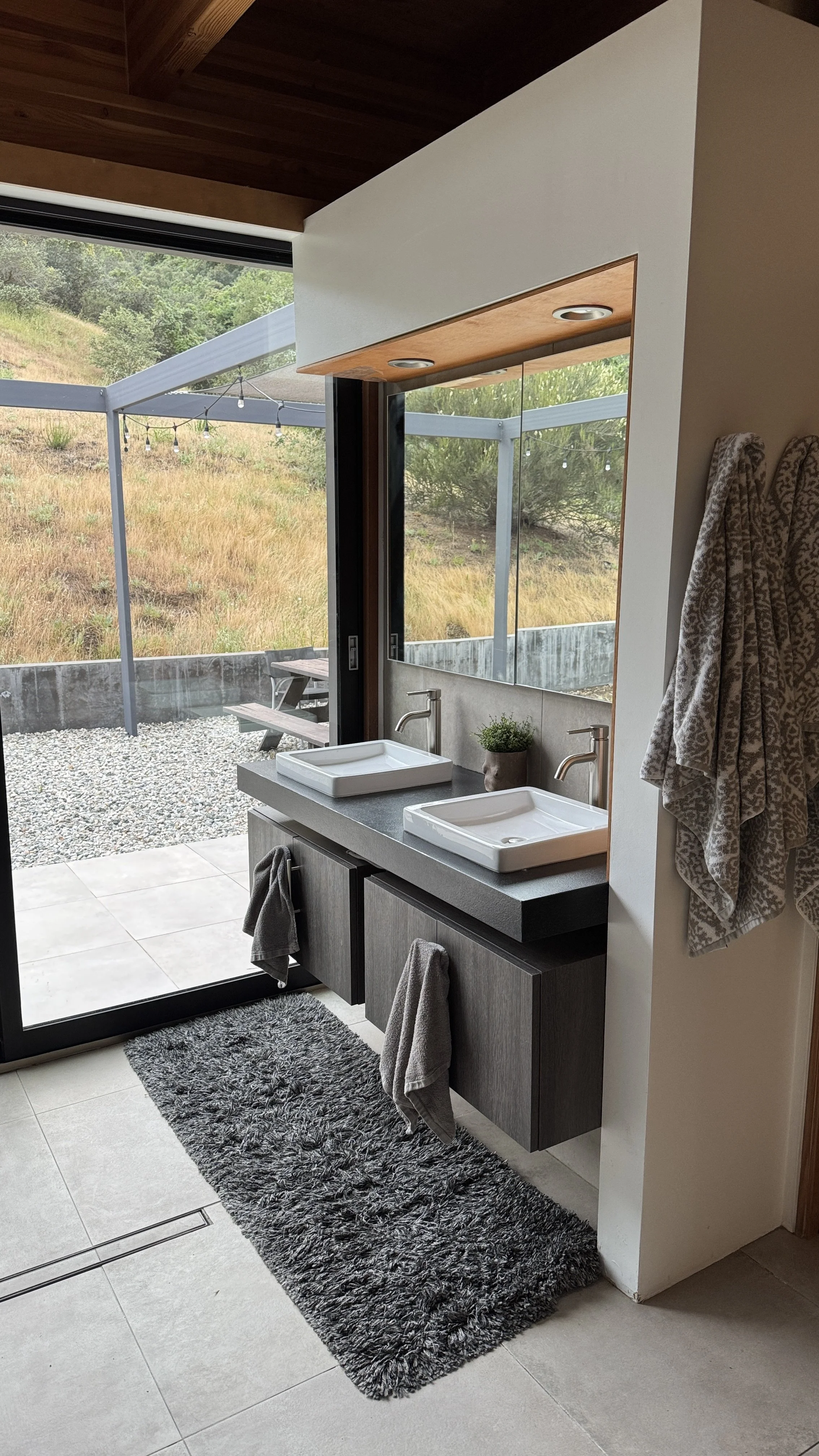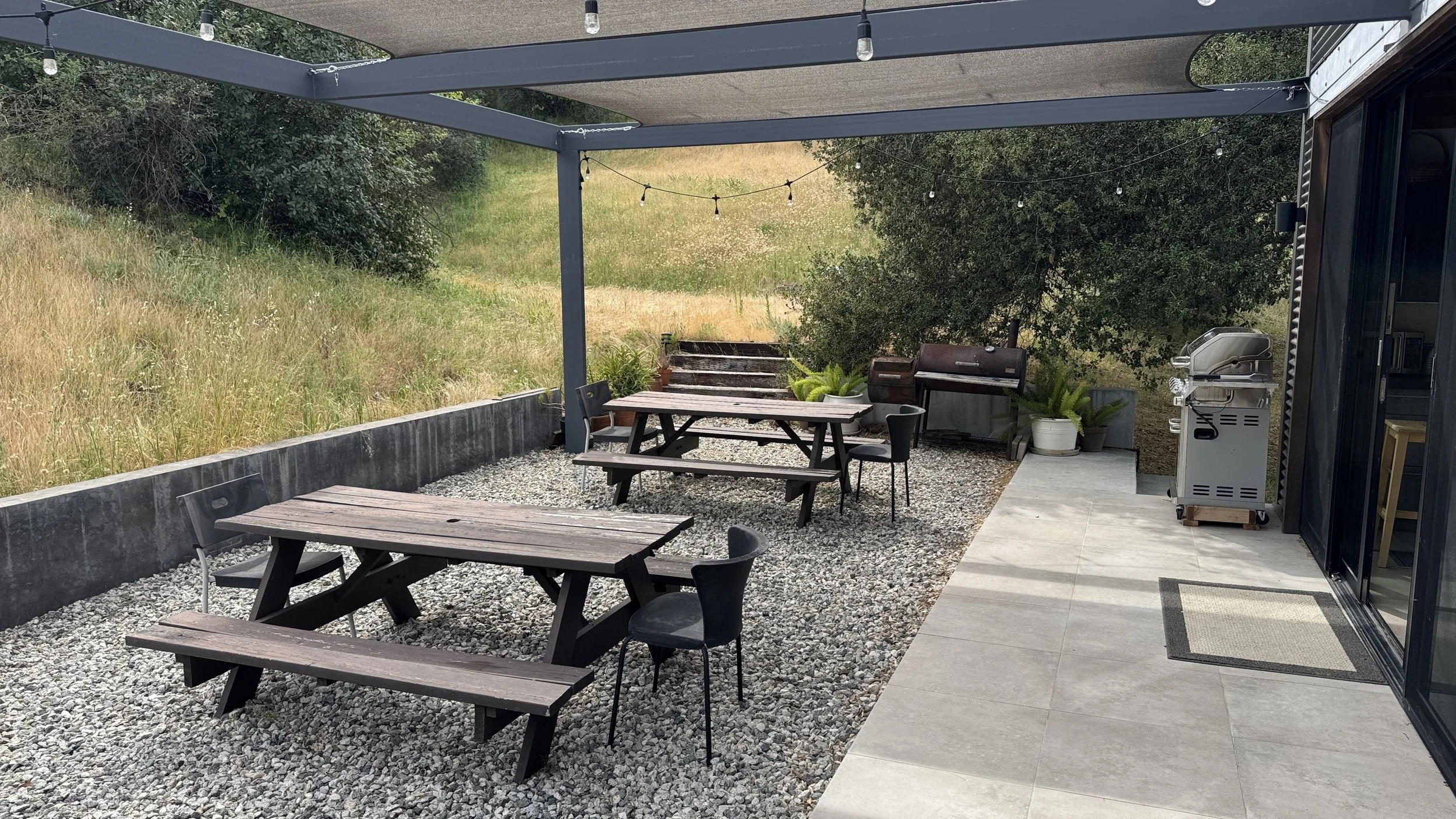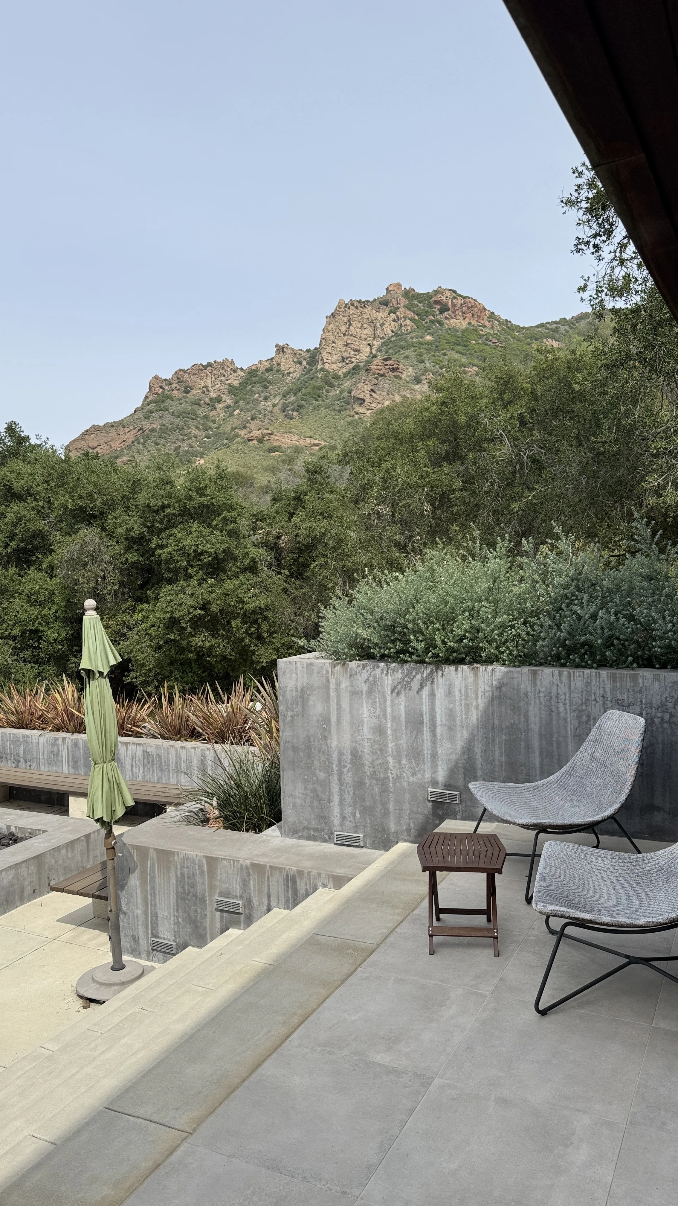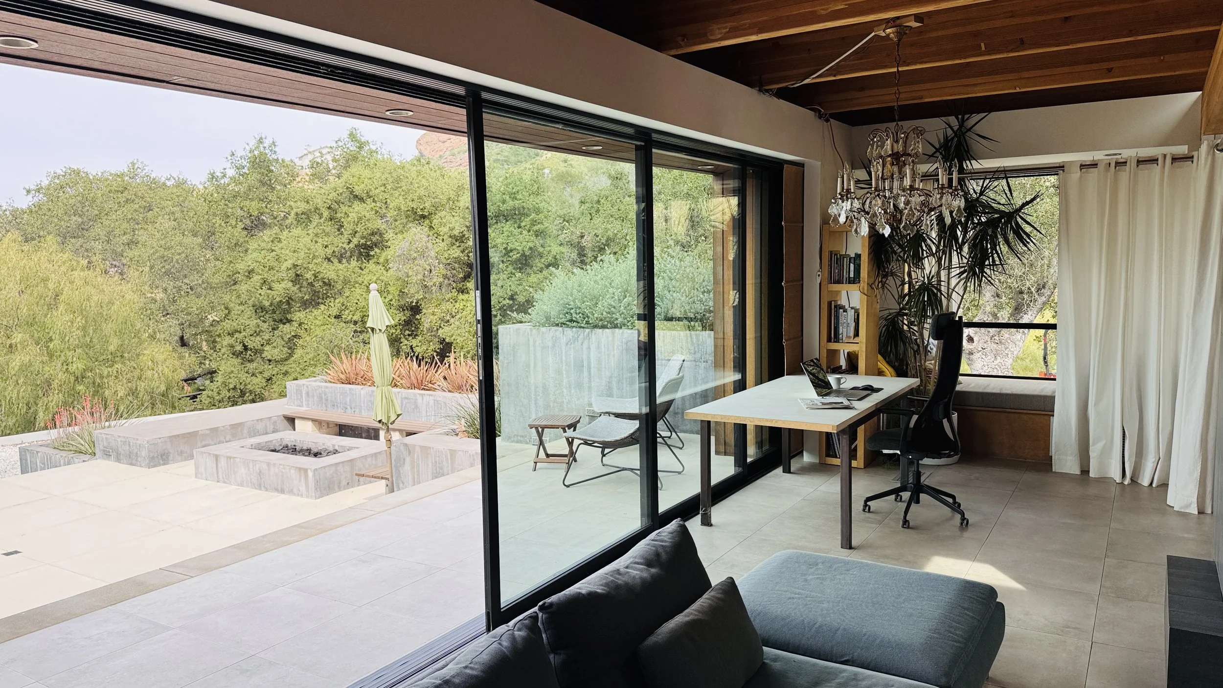 From outside, the house has simple design character, dark grey corrugated steel exterior and flat stucco planters blend with the surroundings. The expansive front patio, with Castlerock mountain as backdrop, is perfect for large, social gathering shoots. Rear patio designed to create character of a German beer garden with long table shared seating. At night, exterior lighting, combined with large fire pit with mountain backdrop and hidden glass walls, create a seamless indoor/outdoor experience.