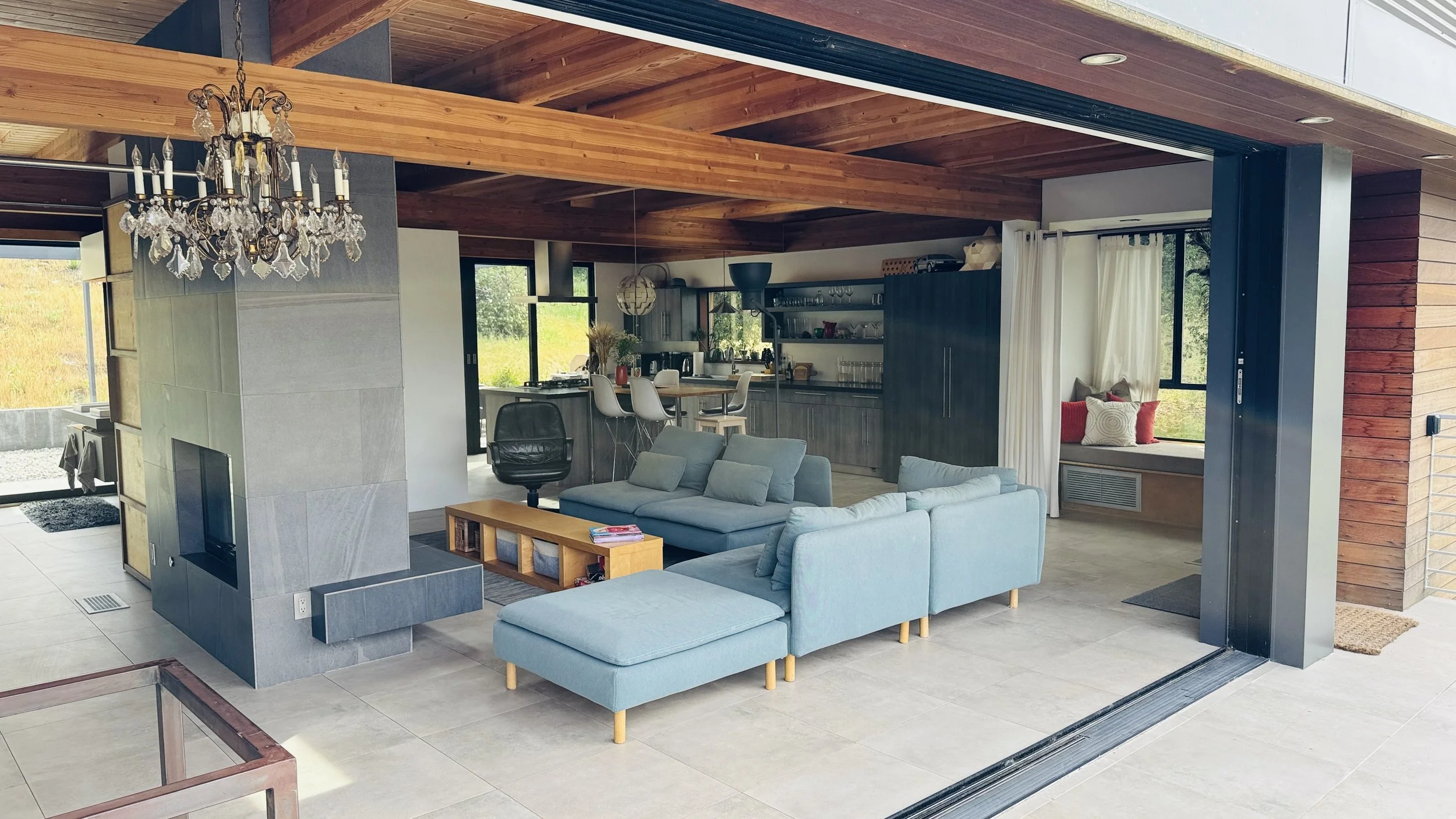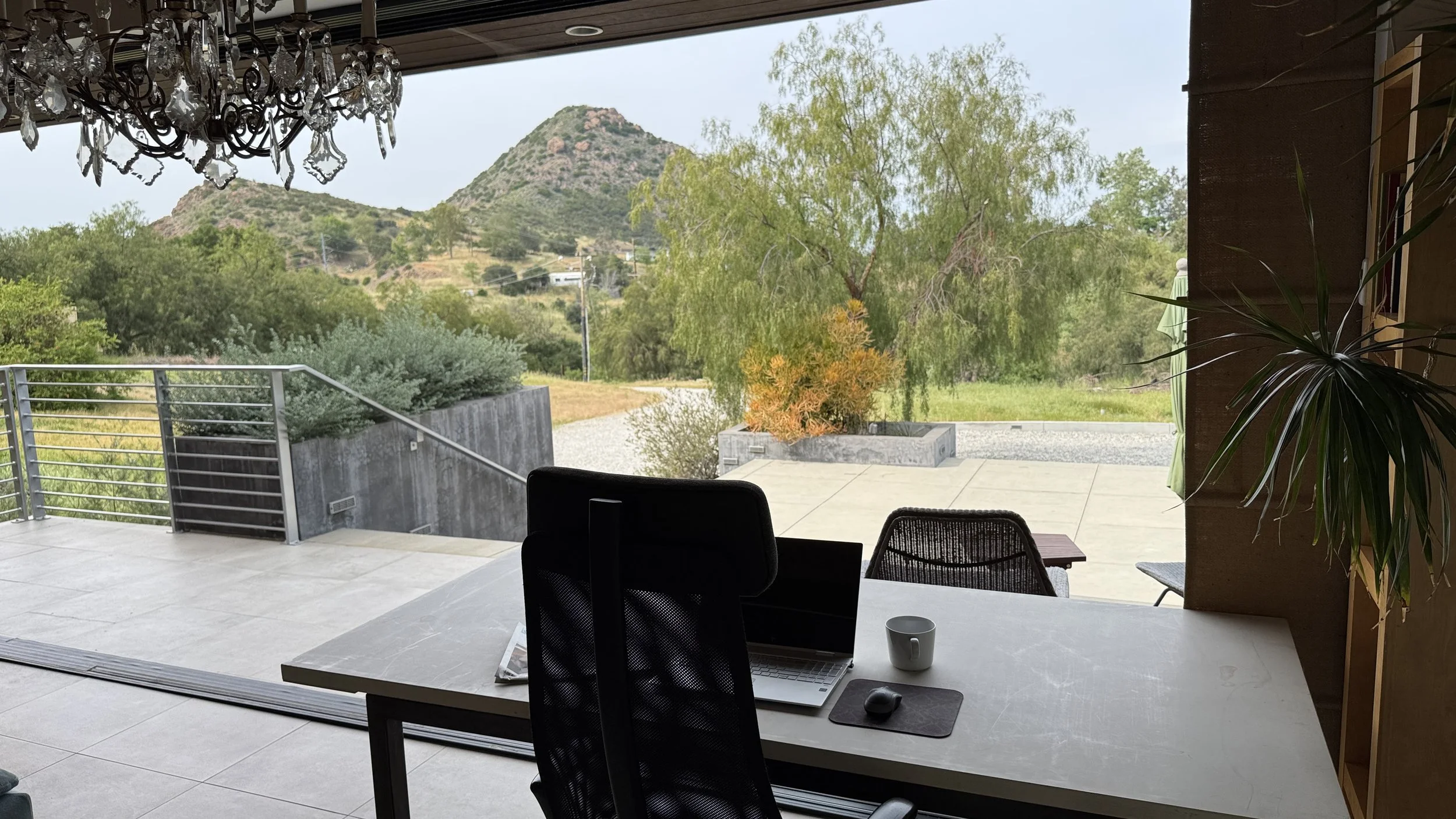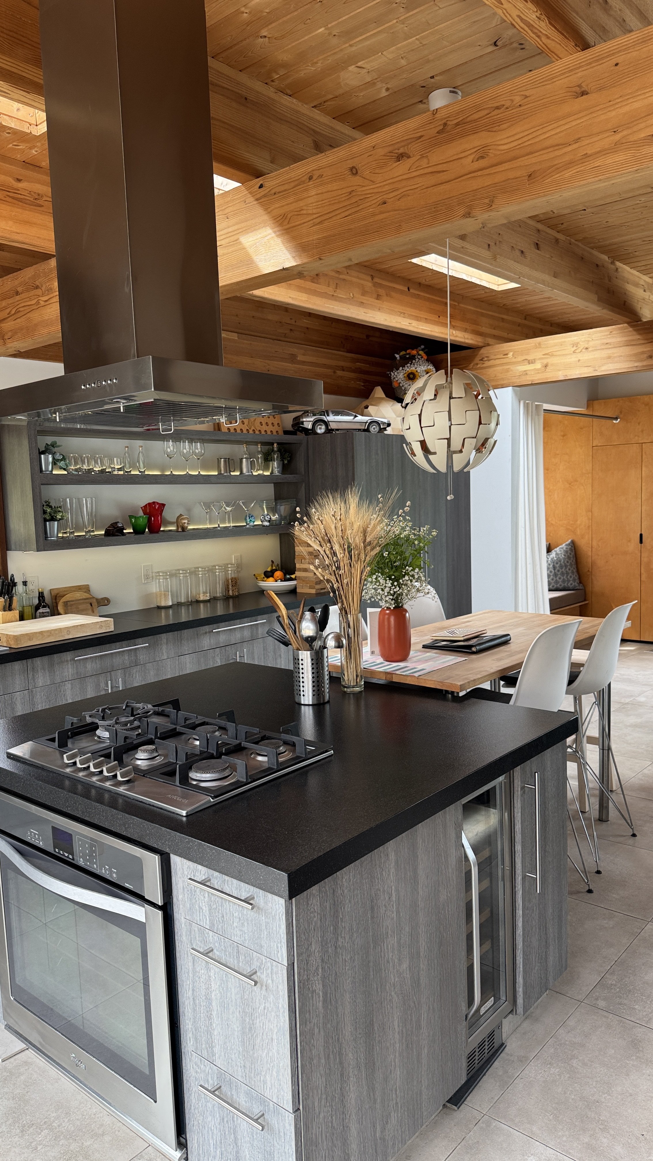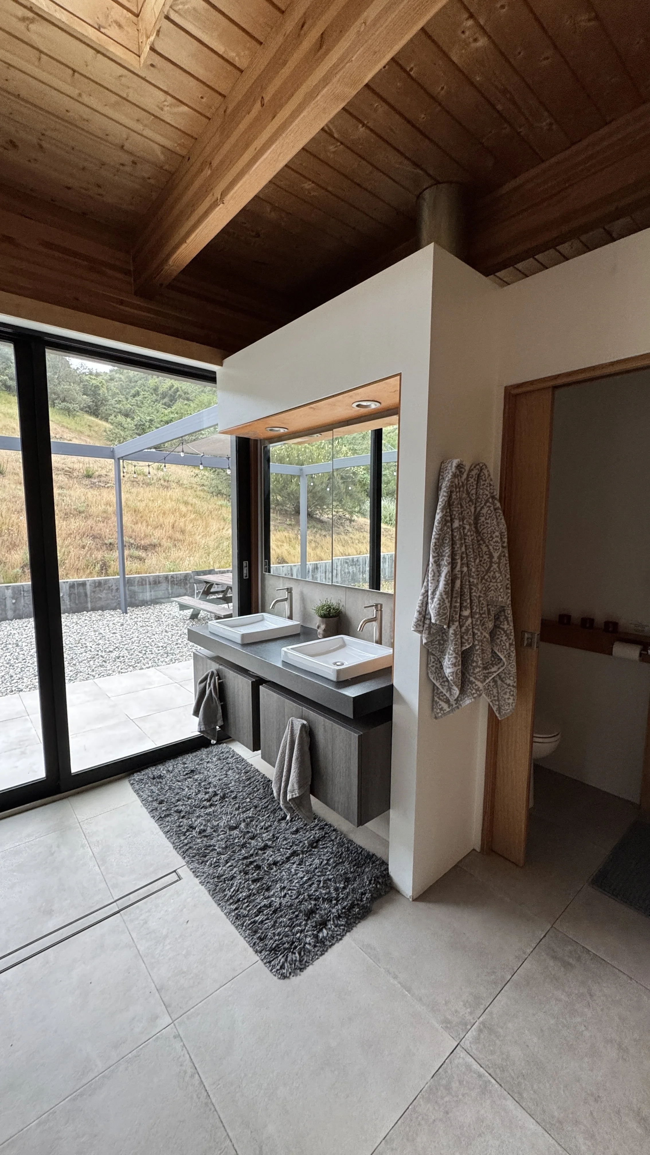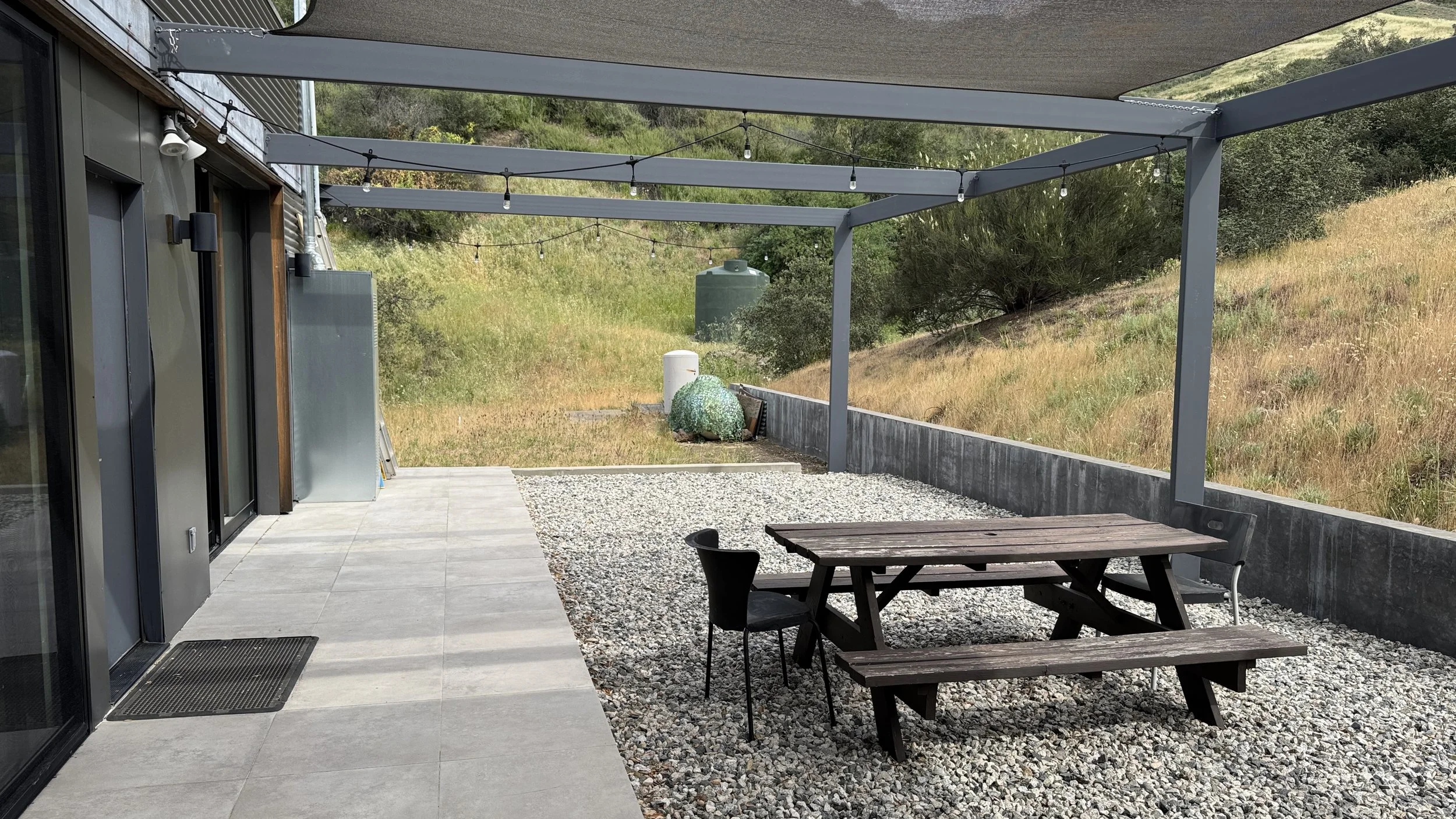 From outside, the house has simple design character, dark grey corrugated steel exterior and flat stucco planters blend with the surroundings. The expansive front patio, with Castlerock mountain as backdrop, is perfect for large, social gathering shoots. Rear patio designed to create character of a German beer garden with long table shared seating. At night, exterior lighting, combined with large fire pit with mountain backdrop and hidden glass walls, create a seamless indoor/outdoor experience.