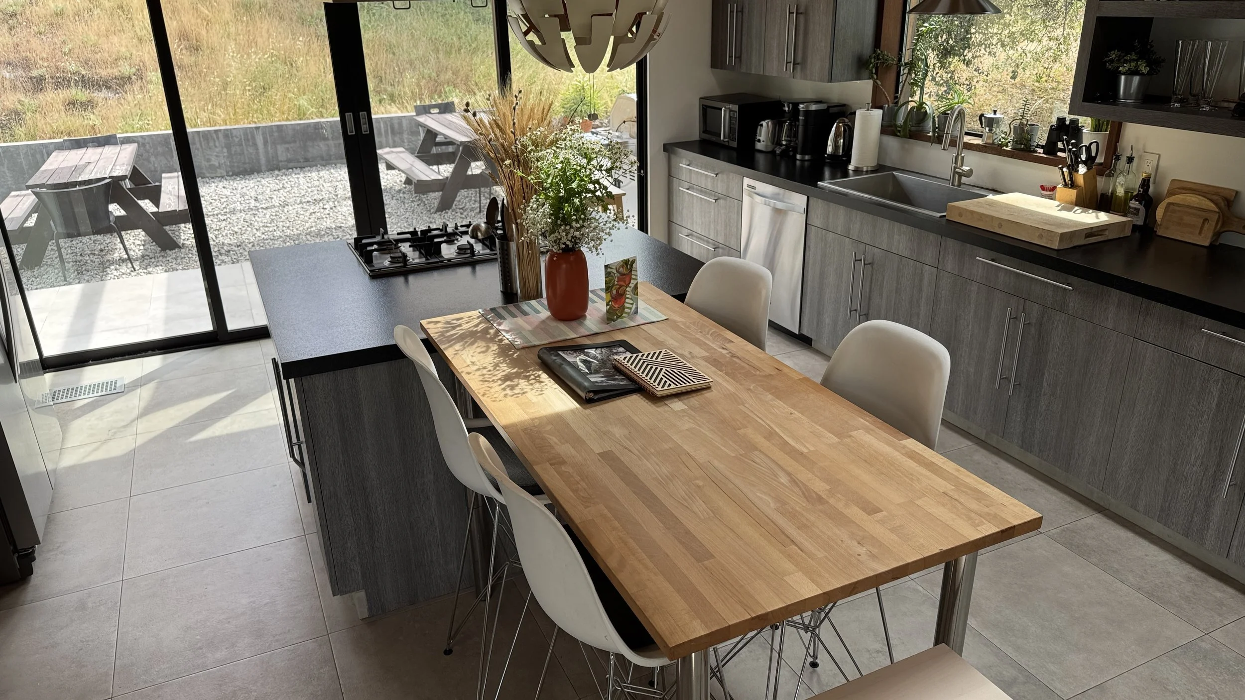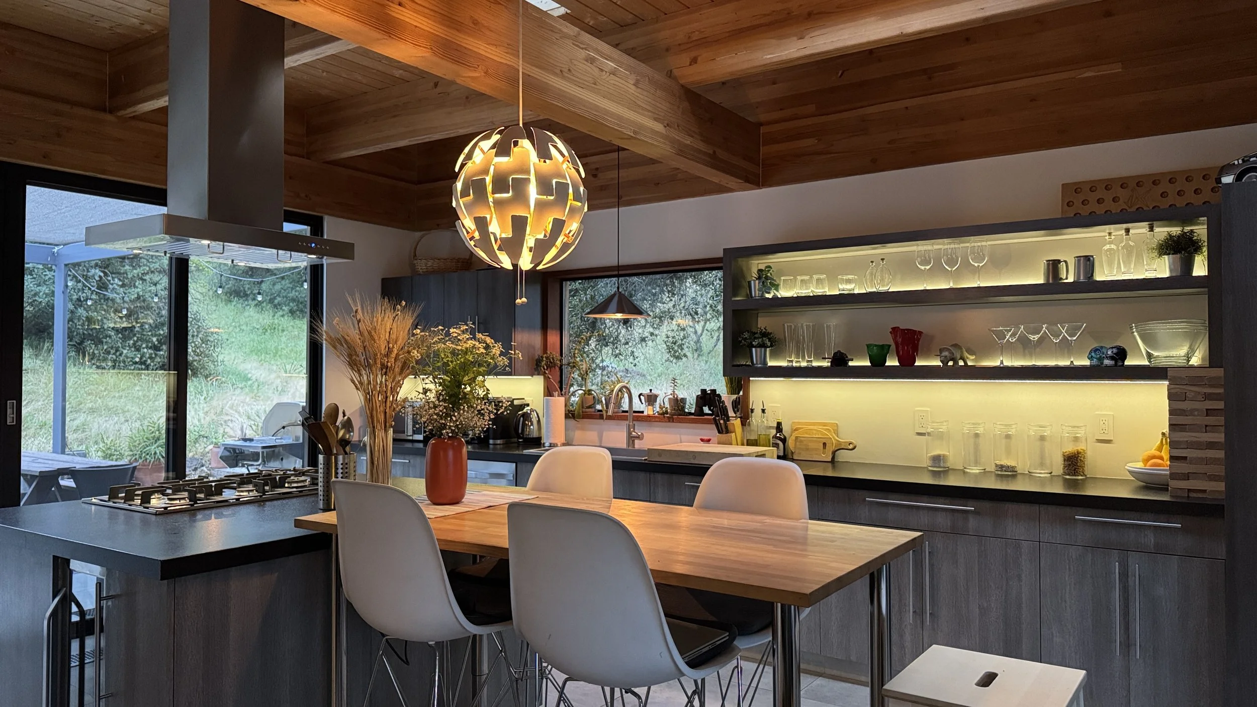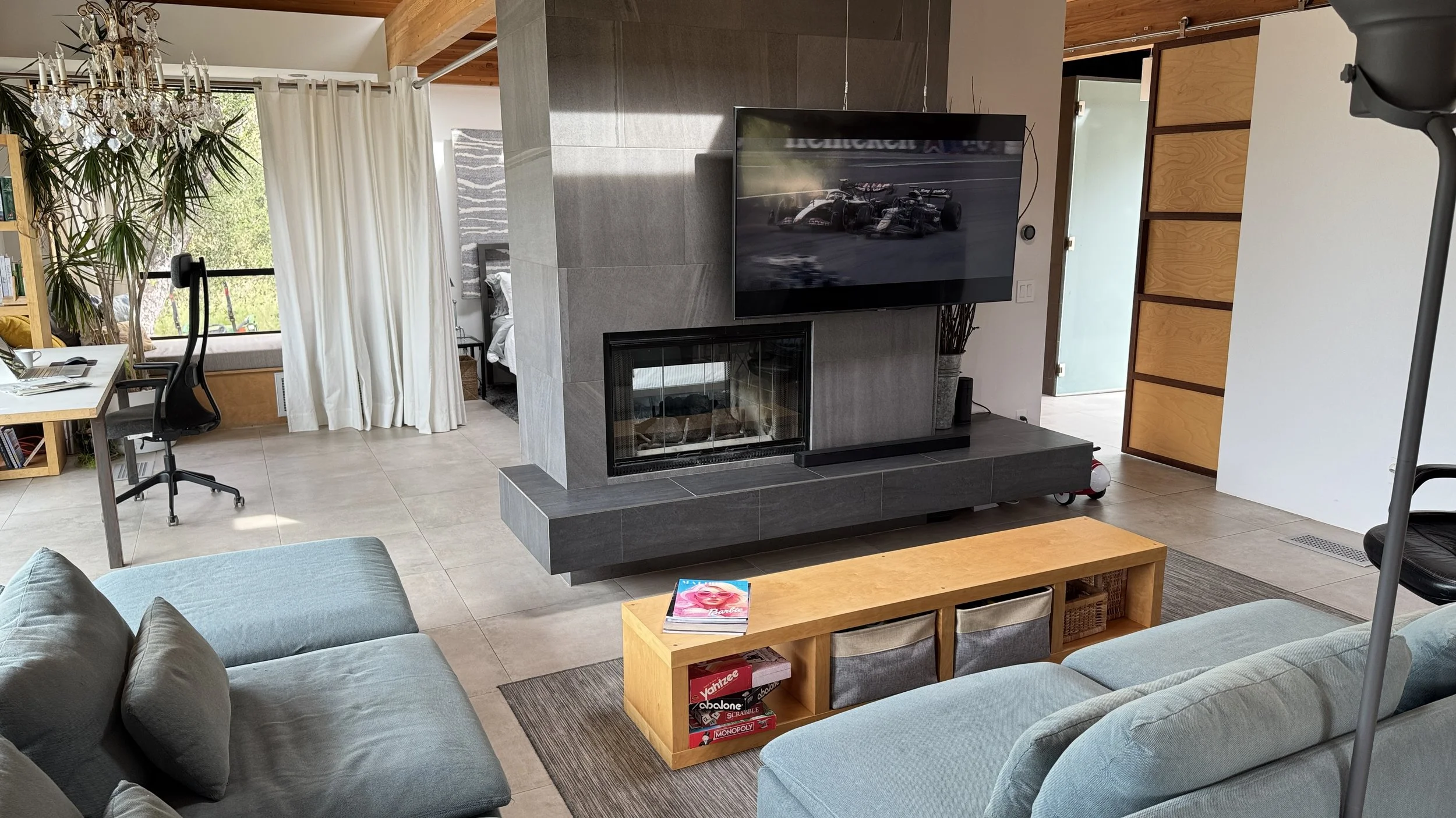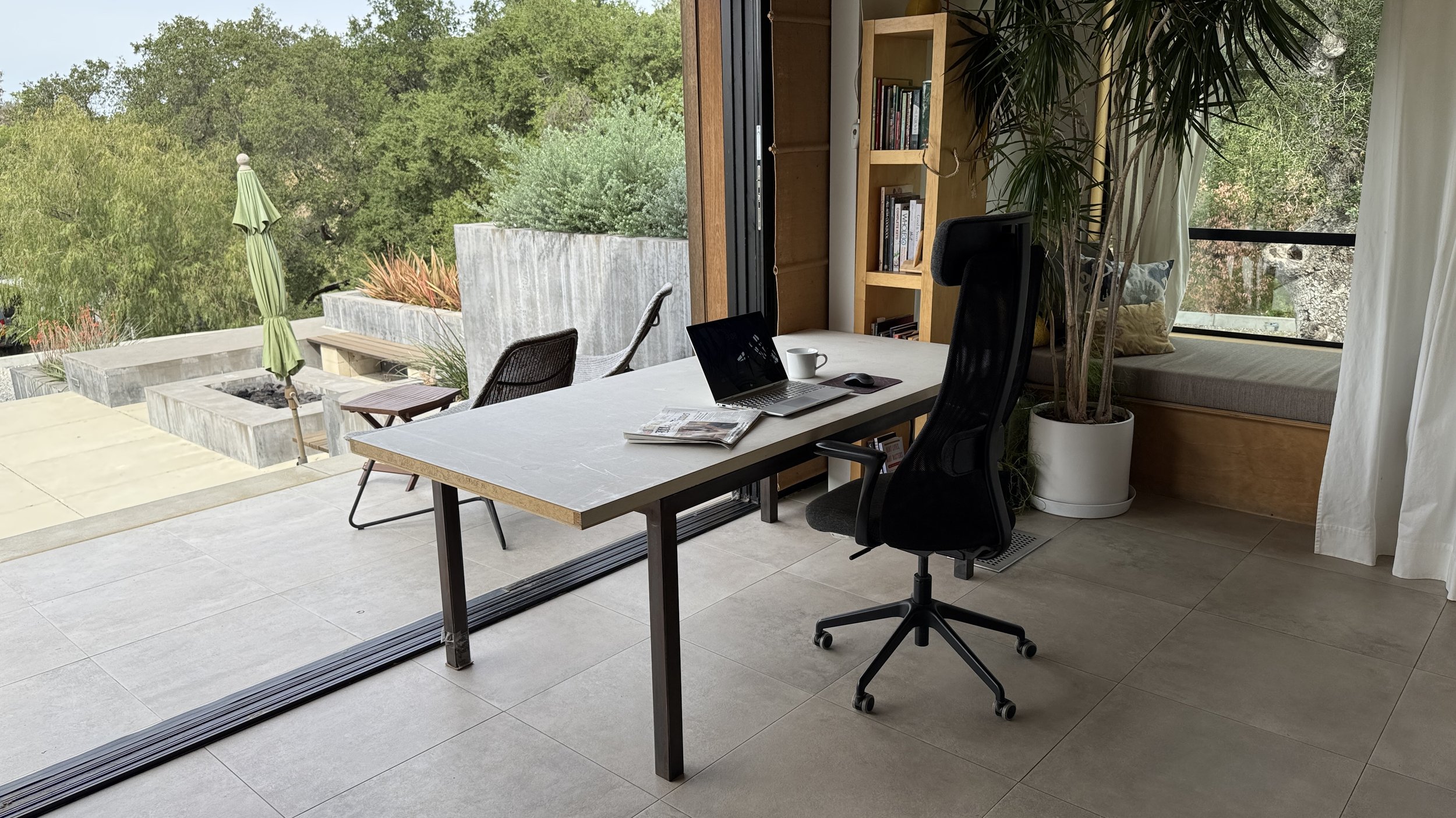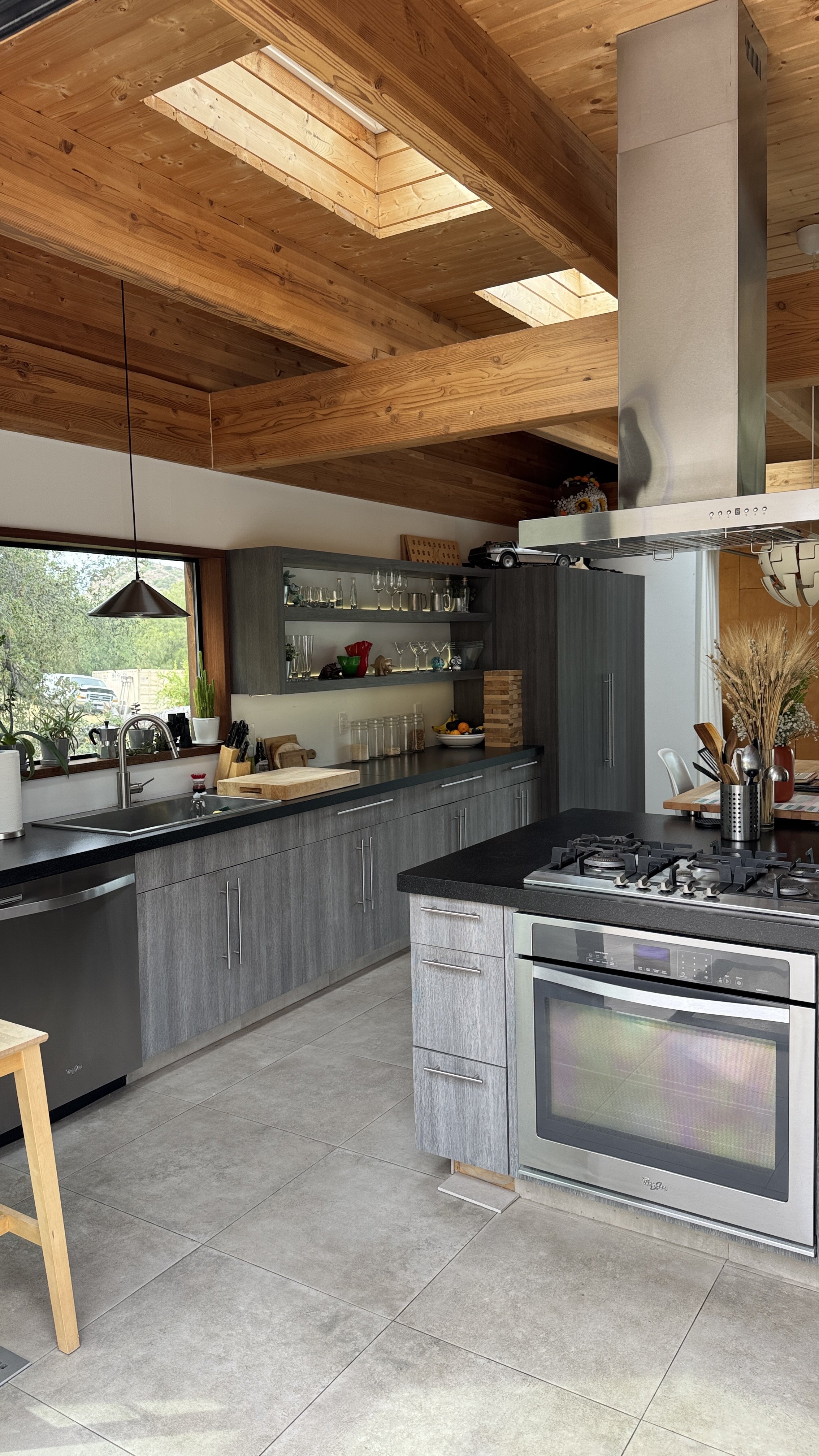 From outside, the house has simple design character, dark grey corrugated steel exterior and flat stucco planters blend with the surroundings. The expansive front patio, with Castlerock mountain as backdrop, is perfect for large, social gathering shoots. Rear patio designed to create character of a German beer garden with long table shared seating. At night, exterior lighting, combined with large fire pit with mountain backdrop and hidden glass walls, create a seamless indoor/outdoor experience.
