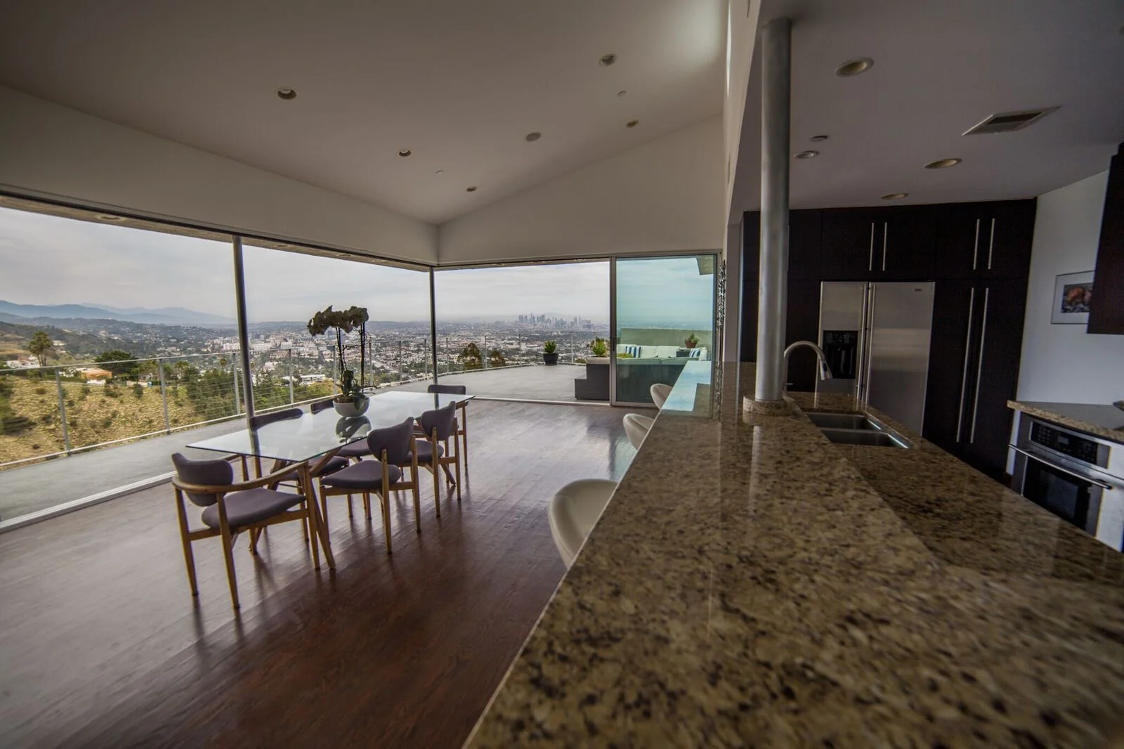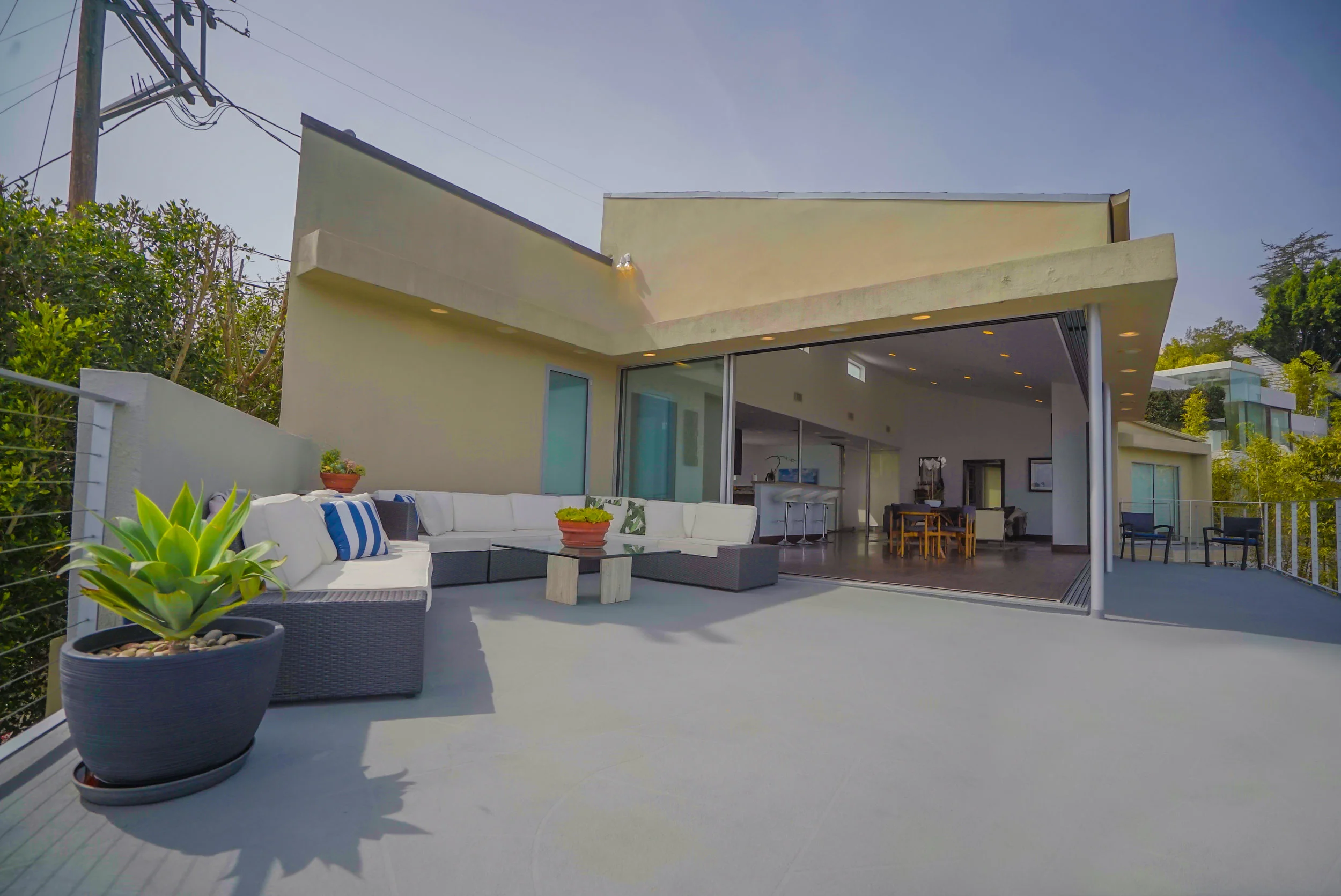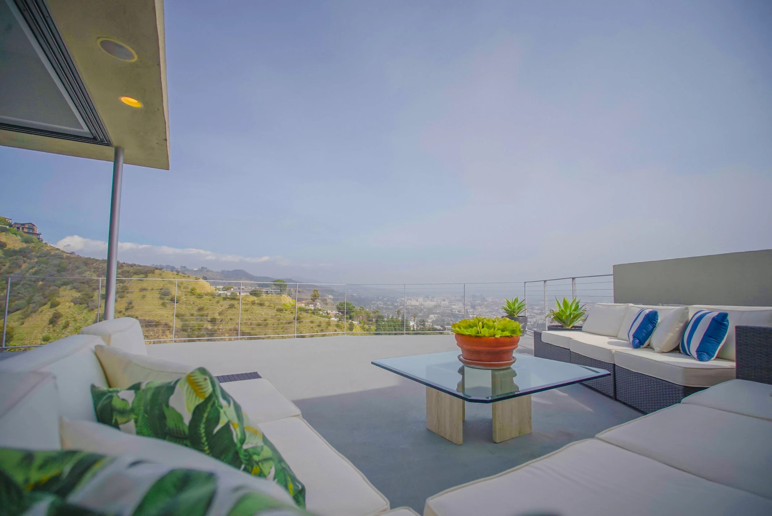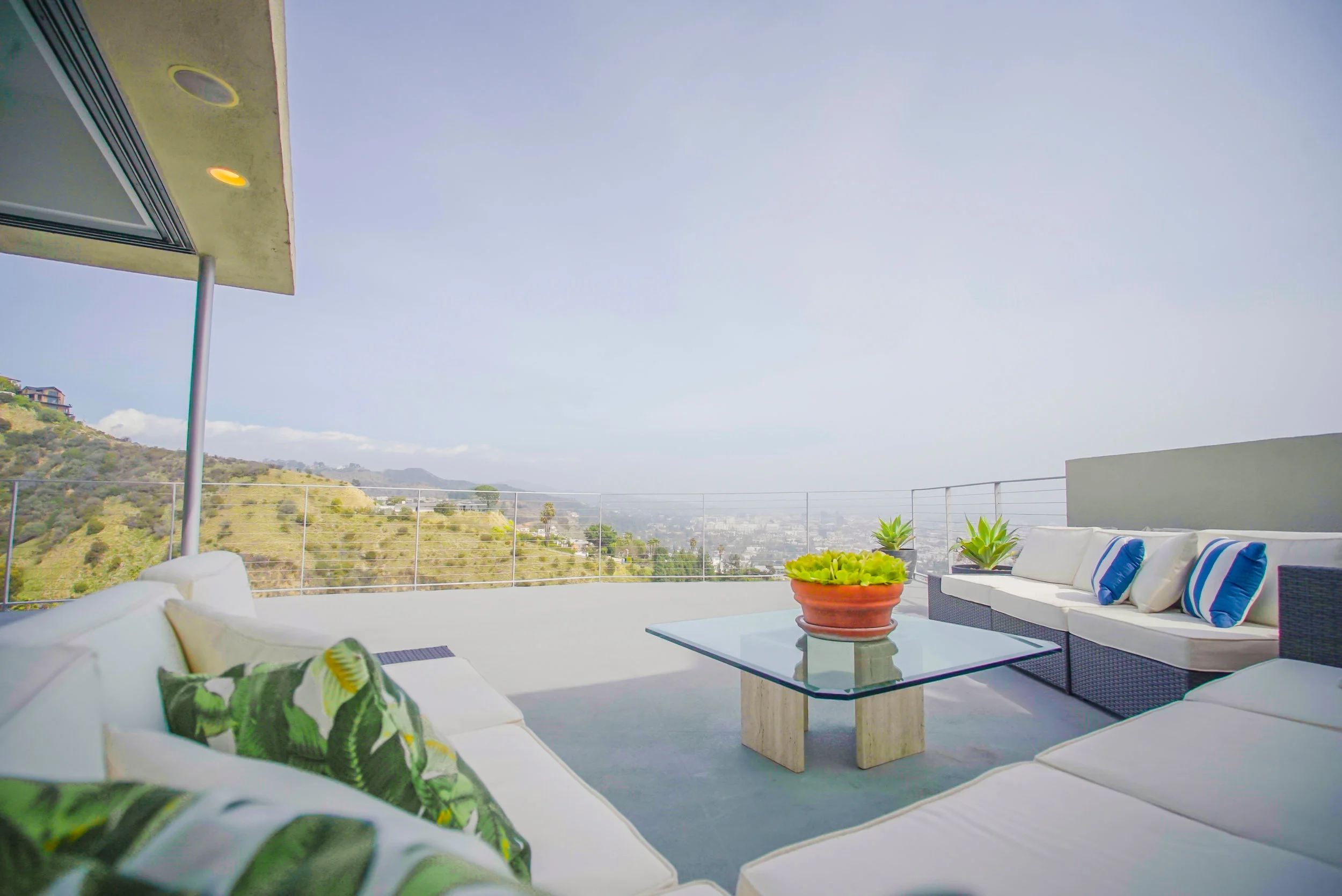 The main residence boasts over 3,000 square feet of living space, and has a clean, open feel with minimalist aesthetics. The main floor has an open floor plan with sliding doors that open to an expansive deck with breathtaking 360-degree views of Los Angeles.