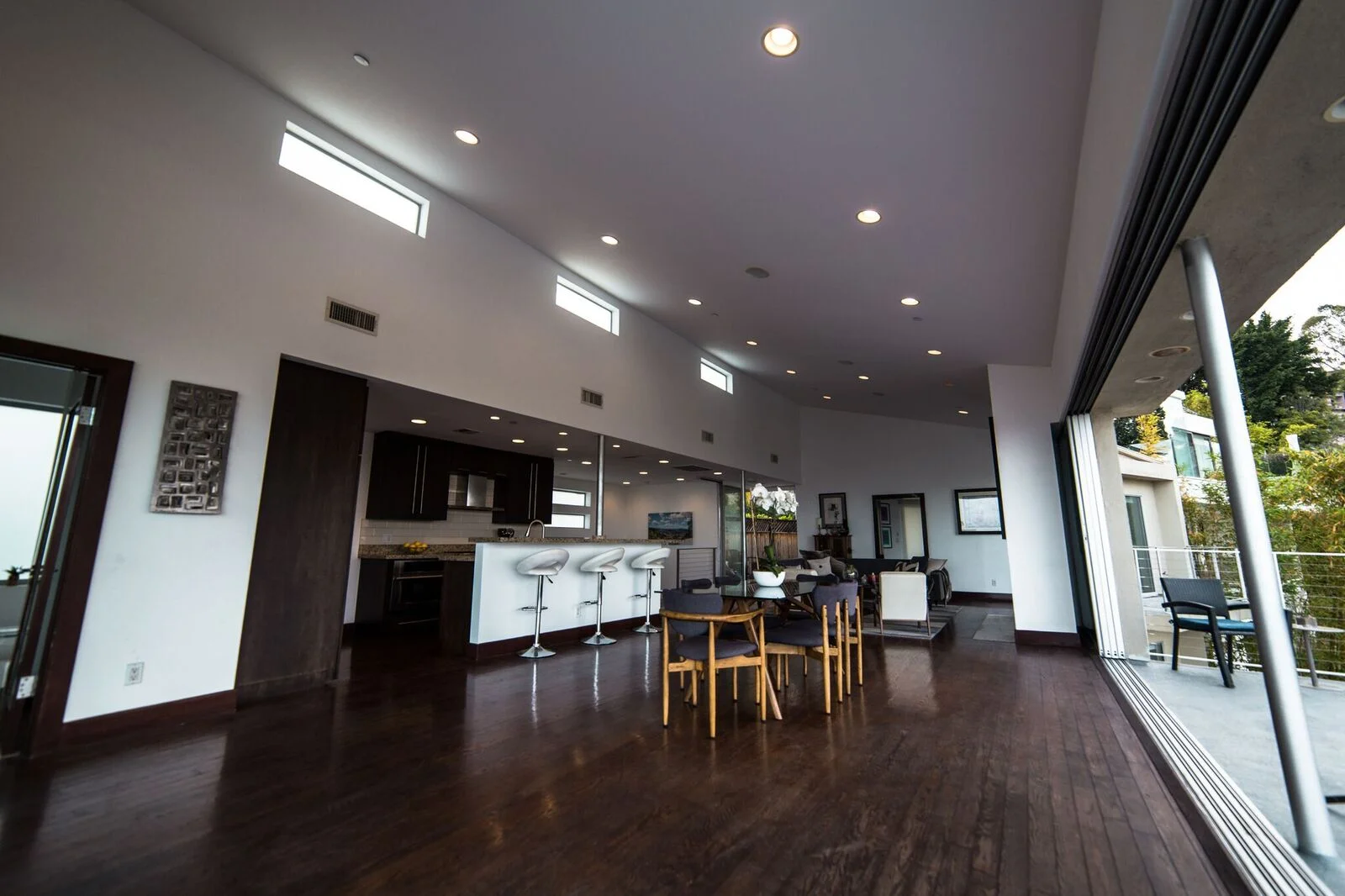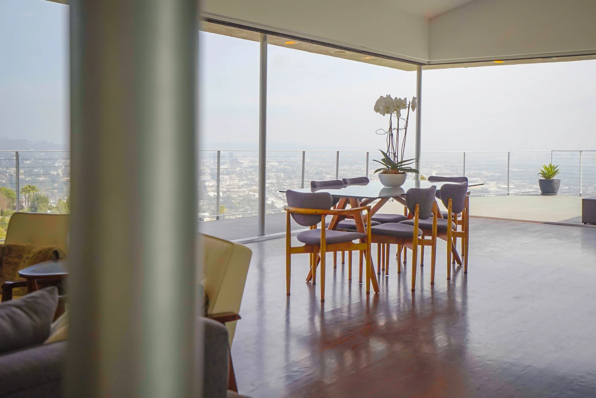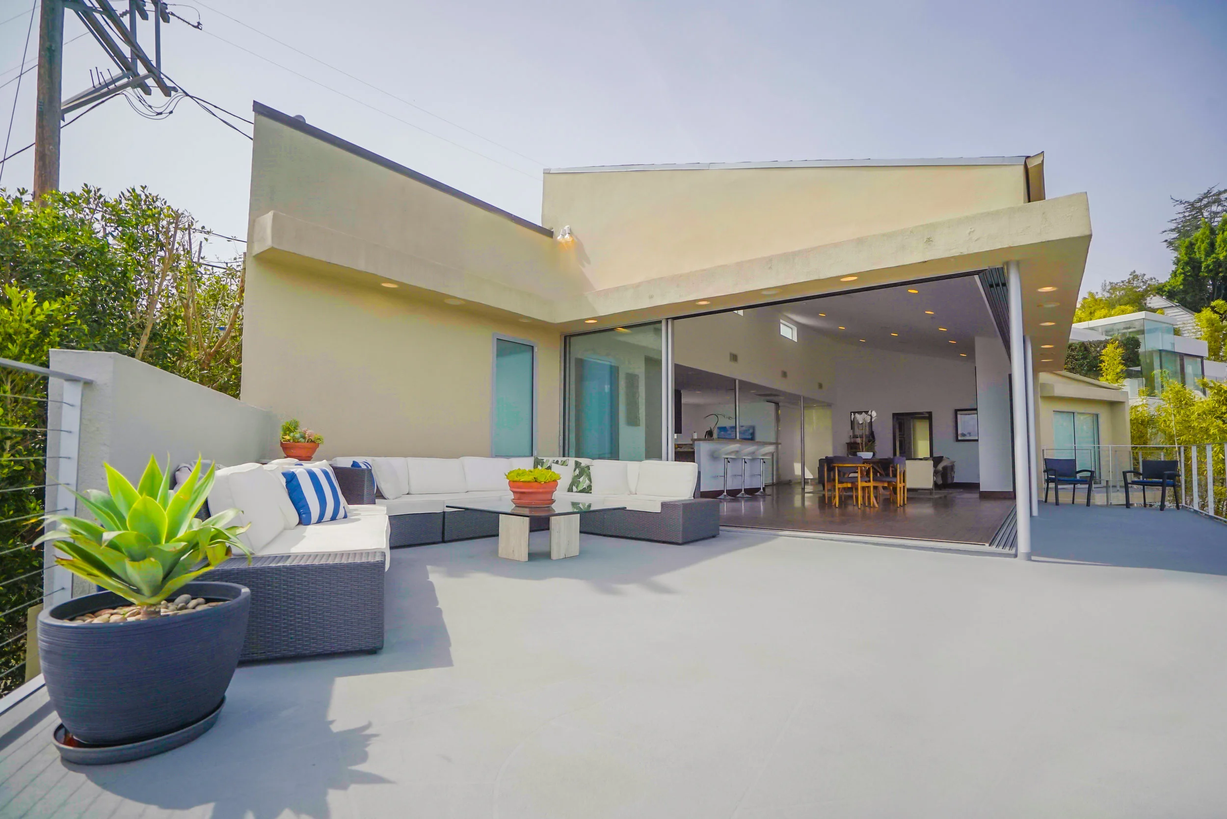 The main residence boasts over 3,000 square feet of living space, and has a clean, open feel with minimalist aesthetics. The main floor has an open floor plan with sliding doors that open to an expansive deck with breathtaking 360-degree views of Los Angeles.