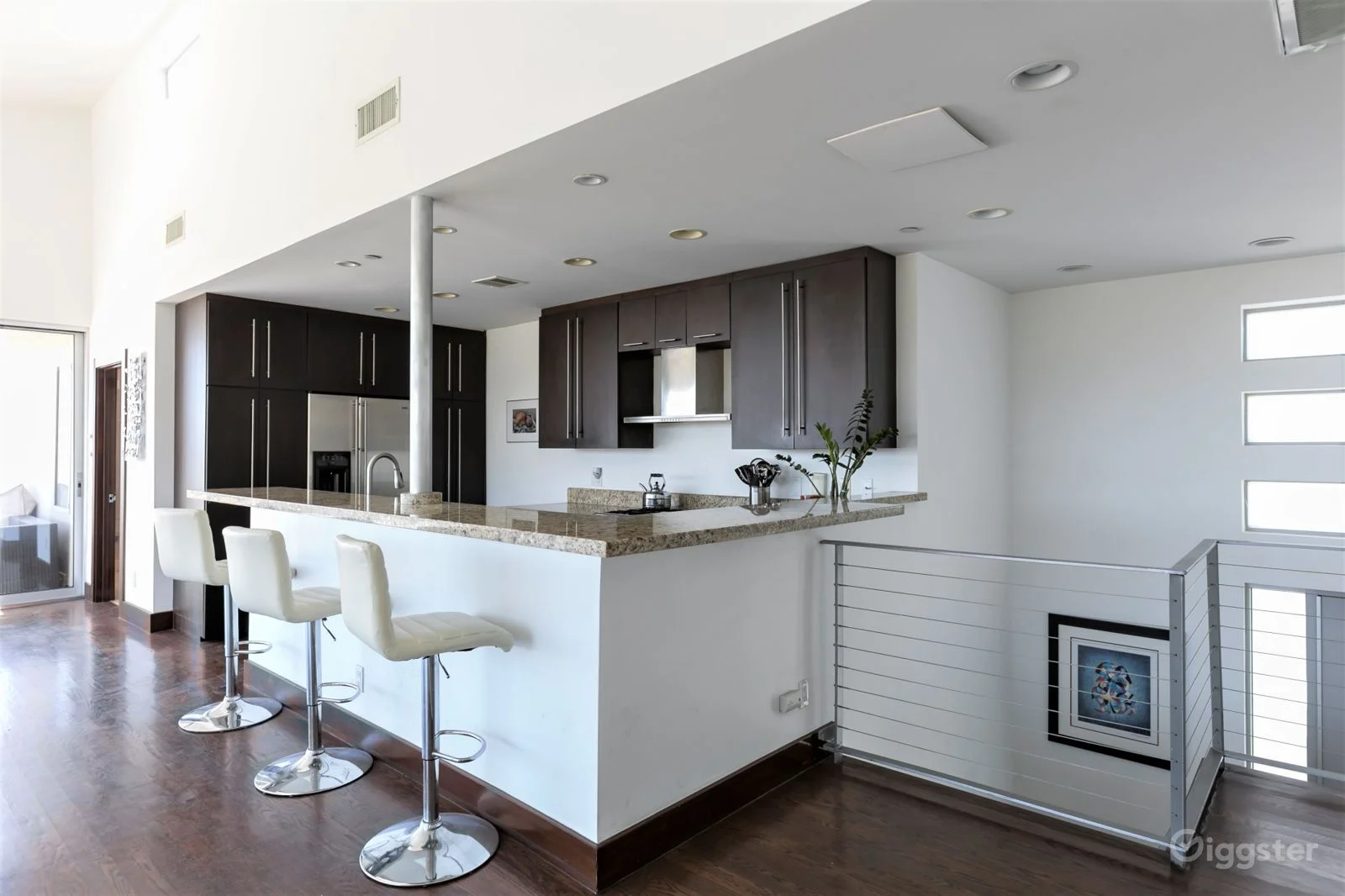 All of the rooms have been updated, including a kitchen and a large living room with a gas fireplace. It also features a den located directly off the living room for additional seating, staging, talent holding and hair/makeup.