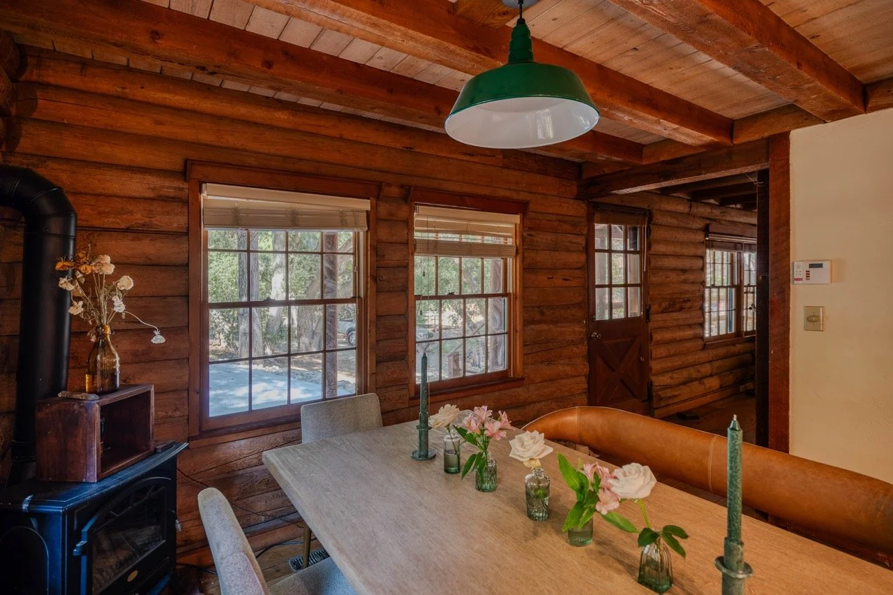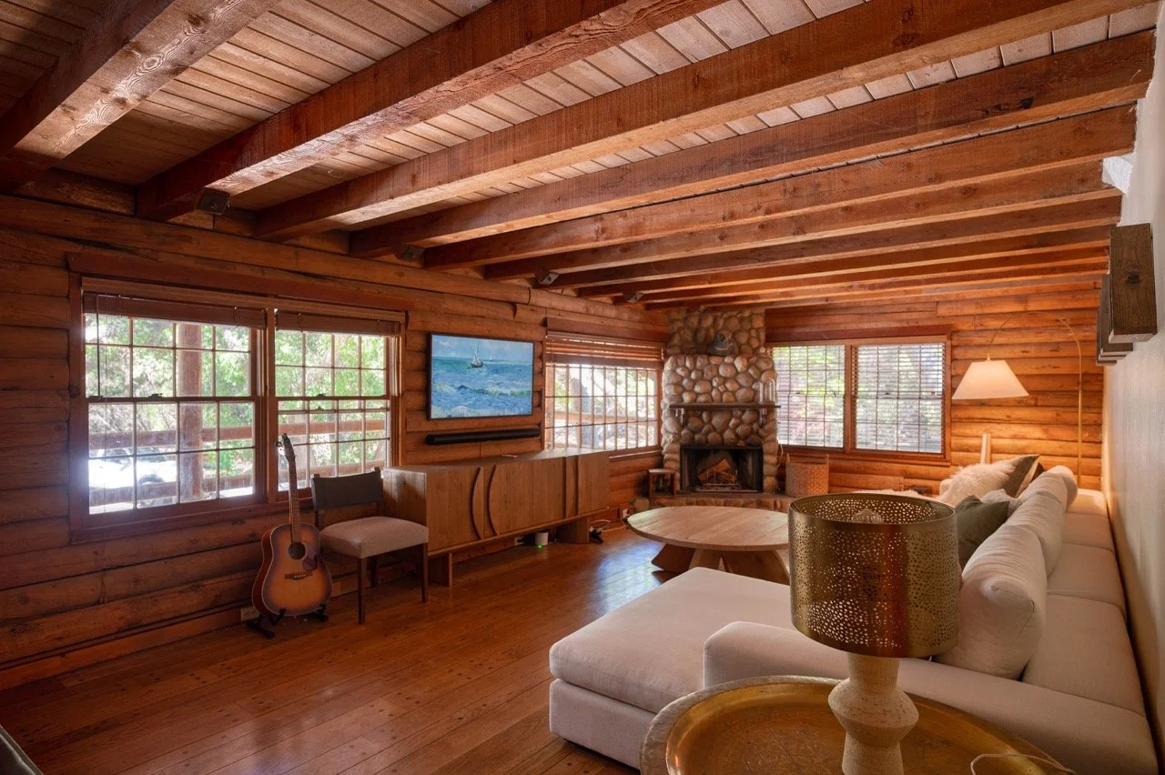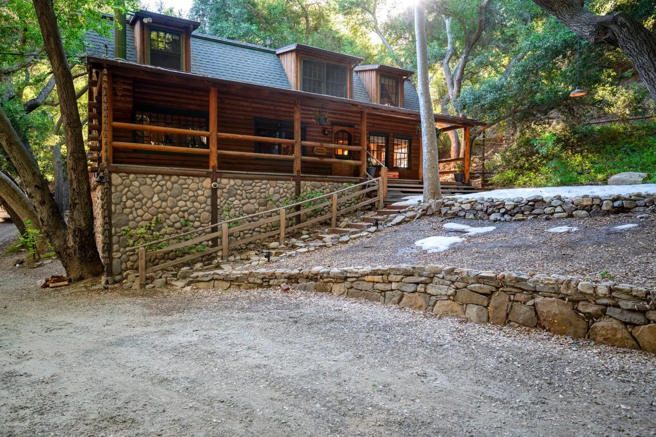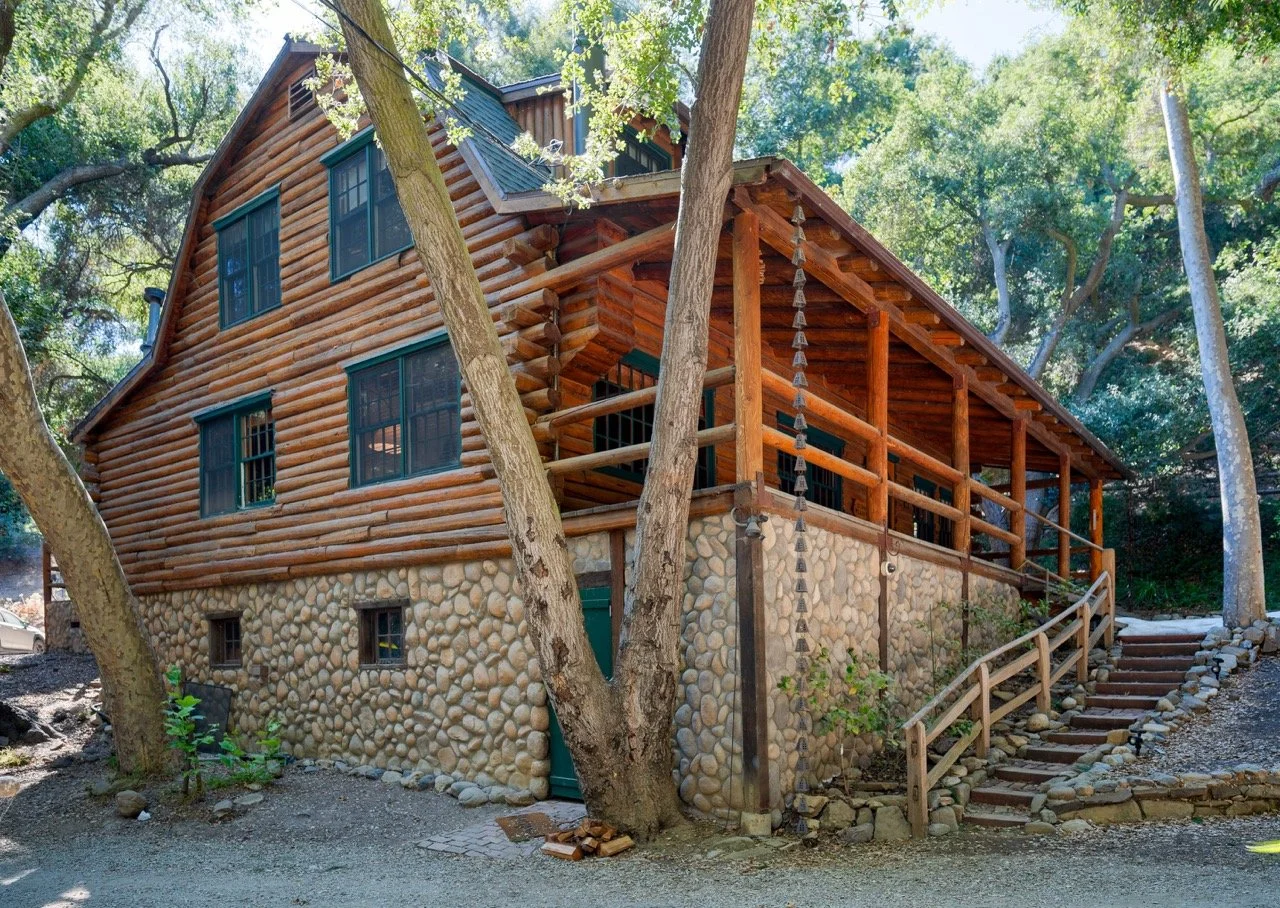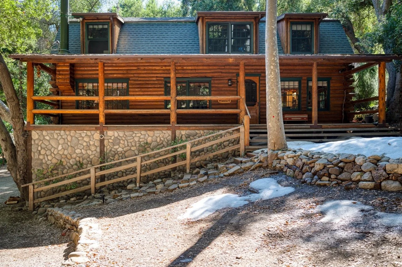 Craftsman Style log cabin nestled in three acres of private woodland just 30 minutes from Los Angeles, this stunning cabin offers productions an exceptional blend of rustic charm and modern sophistication. Featured in acclaimed shows including "This Is Us" and "Parks and Recreation," this versatile location delivers the perfect backdrop for everything from intimate character moments to expansive outdoor scenes. The cabin's modern rustic aesthetic is defined by dramatic wraparound windows that flood the space with natural light while offering seamless indoor-outdoor flow. With soaring ceilings, exposed beams features a river rock fireplace as the focal point. In the center of the cabin is a historic kitchen with vintage details and original cabinetry. Cozy seating nooks are scattered throughout filled with plants and texture. Plenty of natural light shines inside the home at different parts of the day and the house is illuminated with a warm golden glow. Outside you have the option of shooting in full sun or beneath the tree canopies with speckled or direct sunlight.