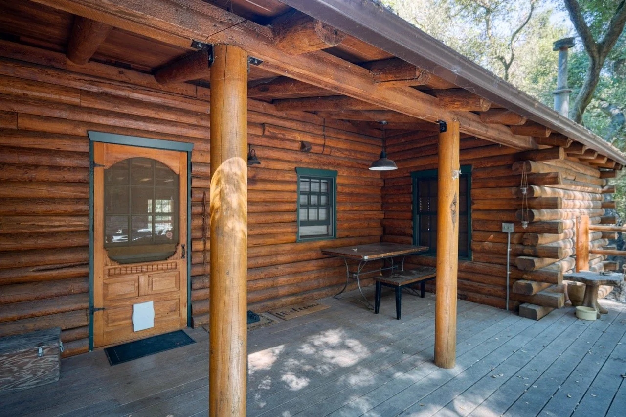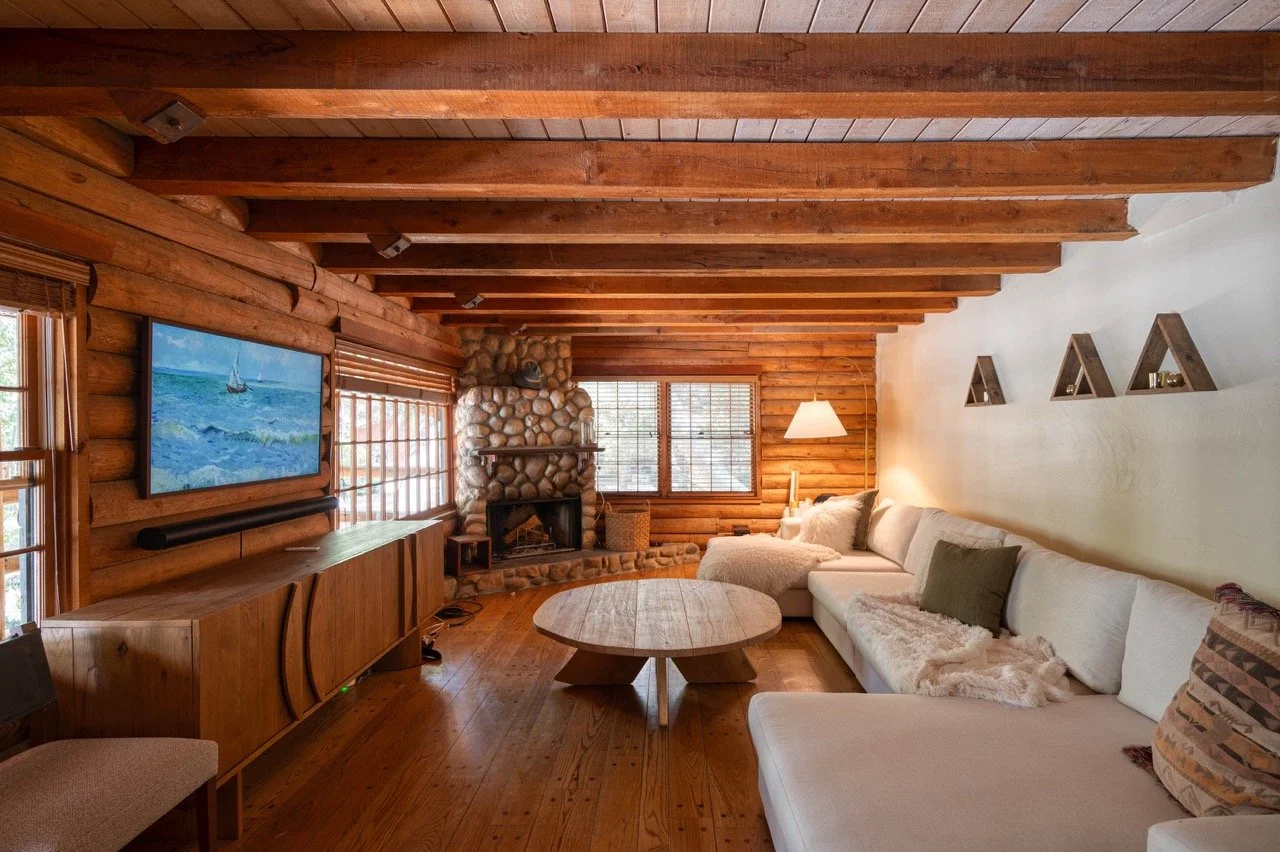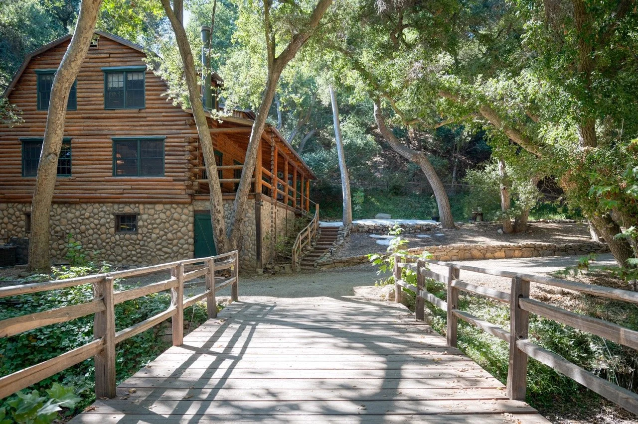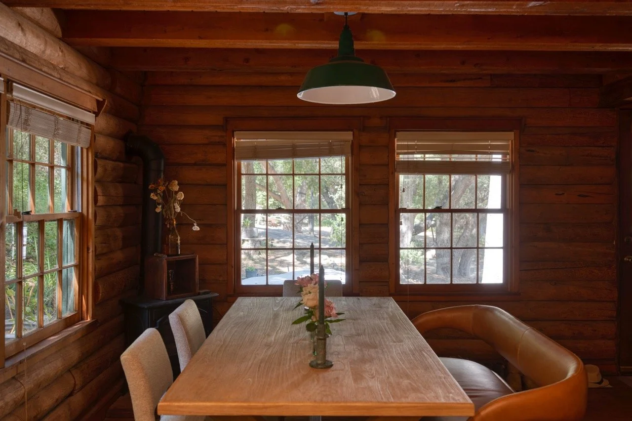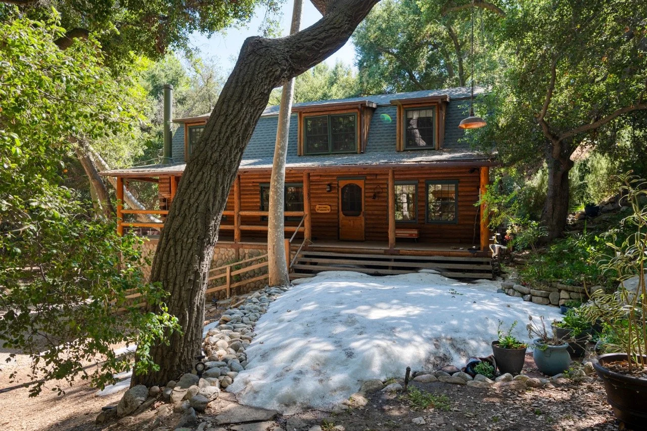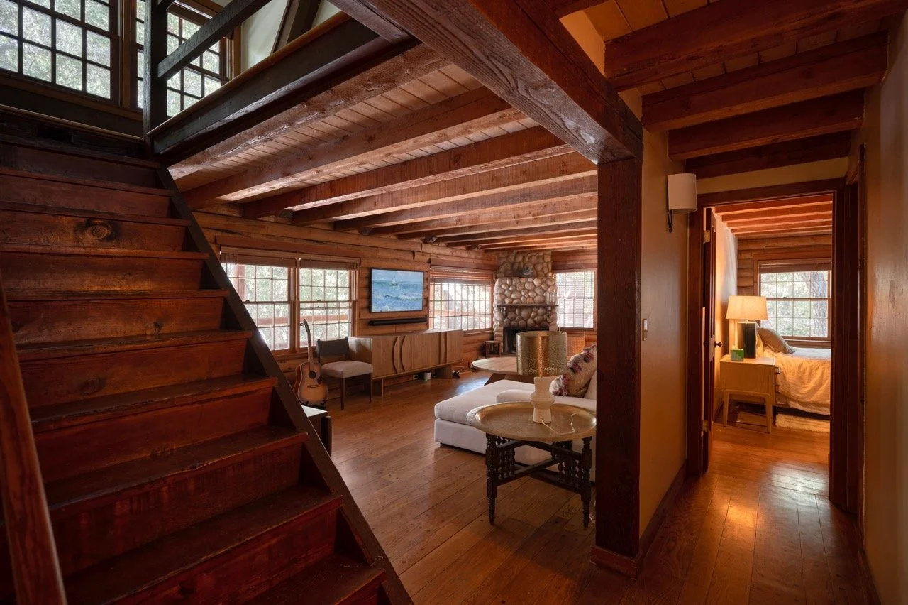 Craftsman Style log cabin nestled in three acres of private woodland just 30 minutes from Los Angeles, this stunning cabin offers productions an exceptional blend of rustic charm and modern sophistication. Featured in acclaimed shows including "This Is Us" and "Parks and Recreation," this versatile location delivers the perfect backdrop for everything from intimate character moments to expansive outdoor scenes. The cabin's modern rustic aesthetic is defined by dramatic wraparound windows that flood the space with natural light while offering seamless indoor-outdoor flow. With soaring ceilings, exposed beams features a river rock fireplace as the focal point. In the center of the cabin is a historic kitchen with vintage details and original cabinetry. Cozy seating nooks are scattered throughout filled with plants and texture. Plenty of natural light shines inside the home at different parts of the day and the house is illuminated with a warm golden glow. Outside you have the option of shooting in full sun or beneath the tree canopies with speckled or direct sunlight.