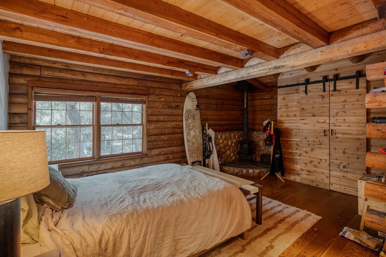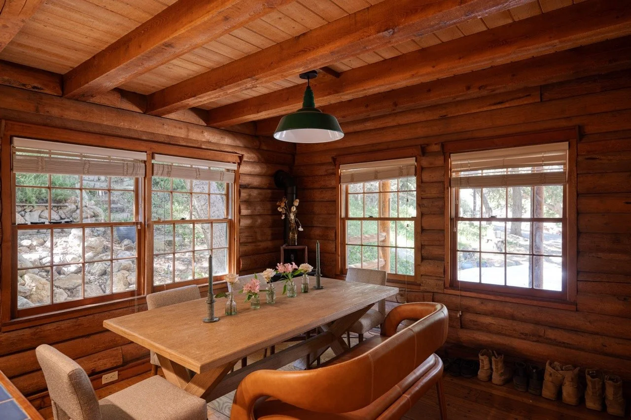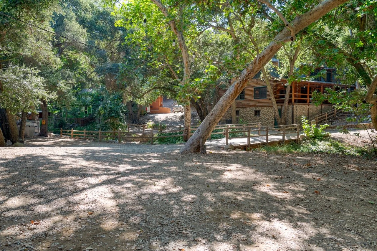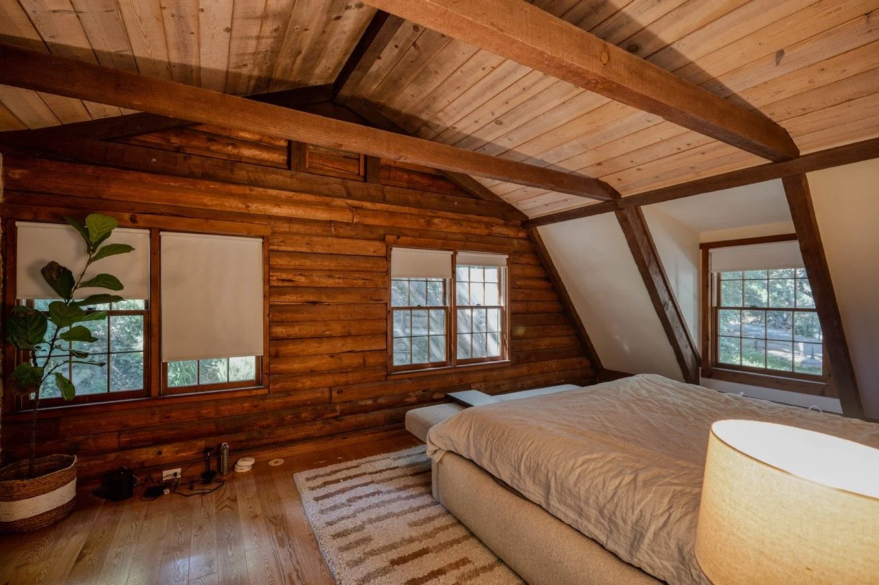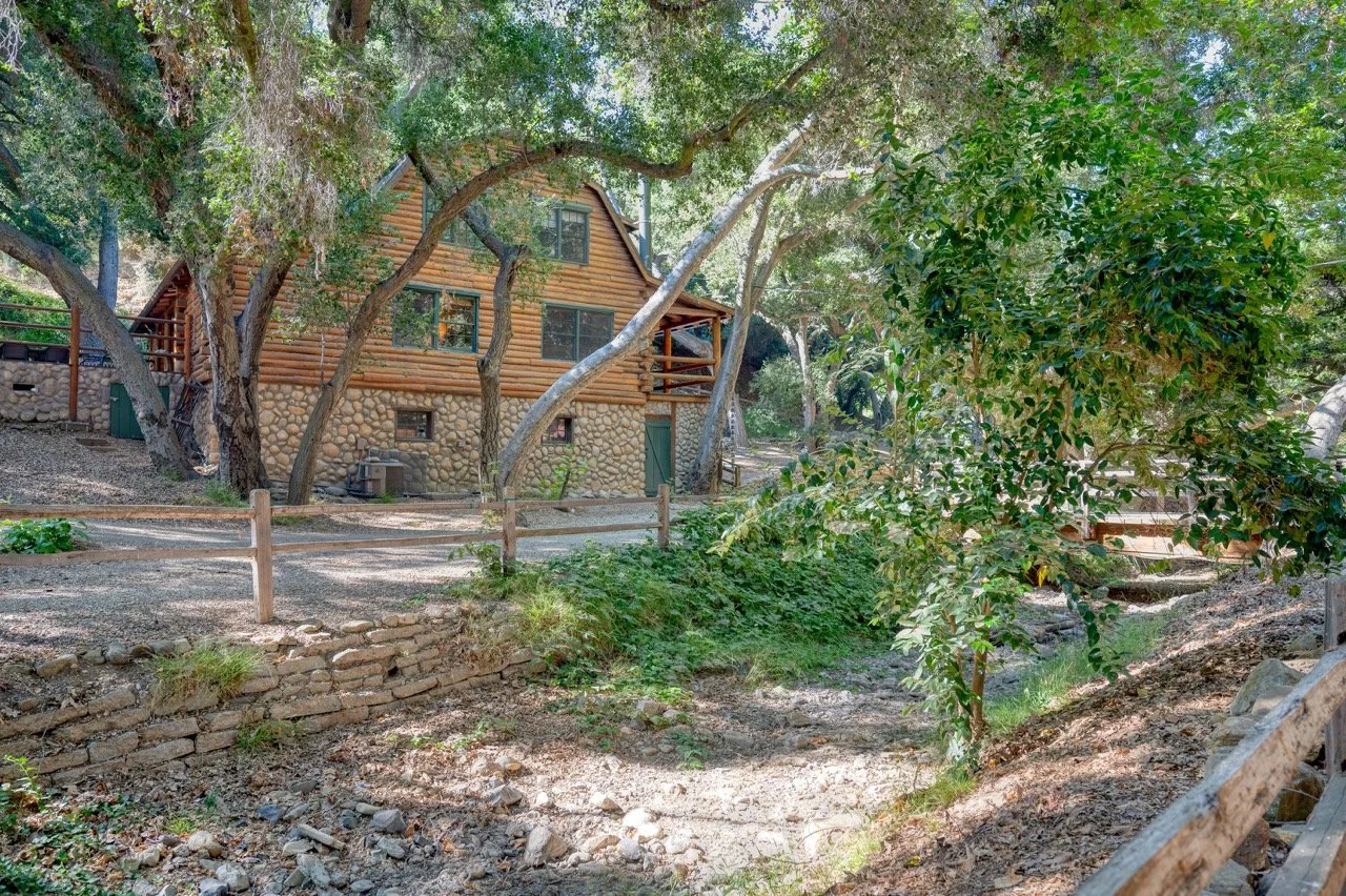 Craftsman Style log cabin nestled in three acres of private woodland just 30 minutes from Los Angeles, this stunning cabin offers productions an exceptional blend of rustic charm and modern sophistication. Featured in acclaimed shows including "This Is Us" and "Parks and Recreation," this versatile location delivers the perfect backdrop for everything from intimate character moments to expansive outdoor scenes. The cabin's modern rustic aesthetic is defined by dramatic wraparound windows that flood the space with natural light while offering seamless indoor-outdoor flow. With soaring ceilings, exposed beams features a river rock fireplace as the focal point. In the center of the cabin is a historic kitchen with vintage details and original cabinetry. Cozy seating nooks are scattered throughout filled with plants and texture. Plenty of natural light shines inside the home at different parts of the day and the house is illuminated with a warm golden glow. Outside you have the option of shooting in full sun or beneath the tree canopies with speckled or direct sunlight.