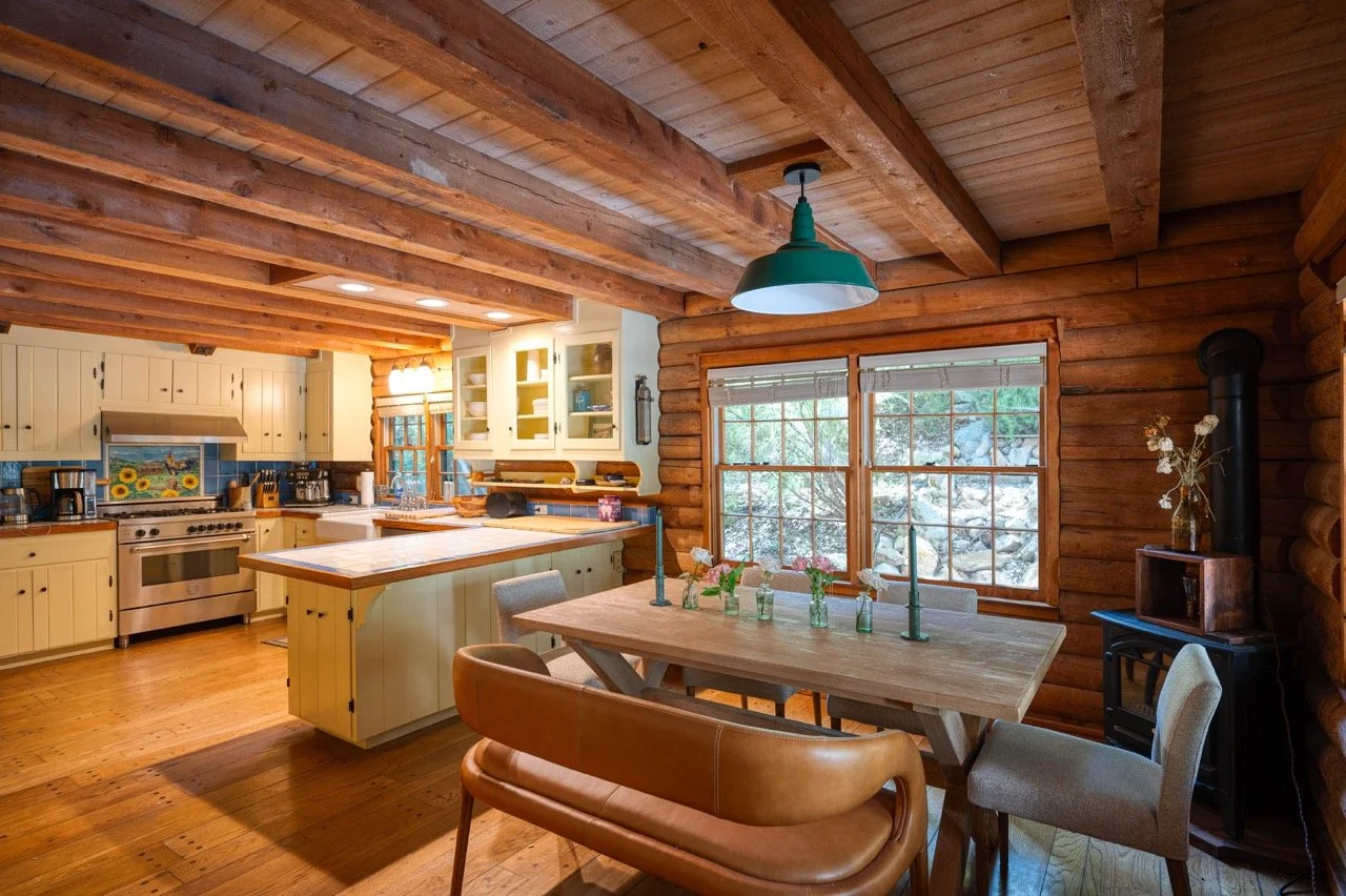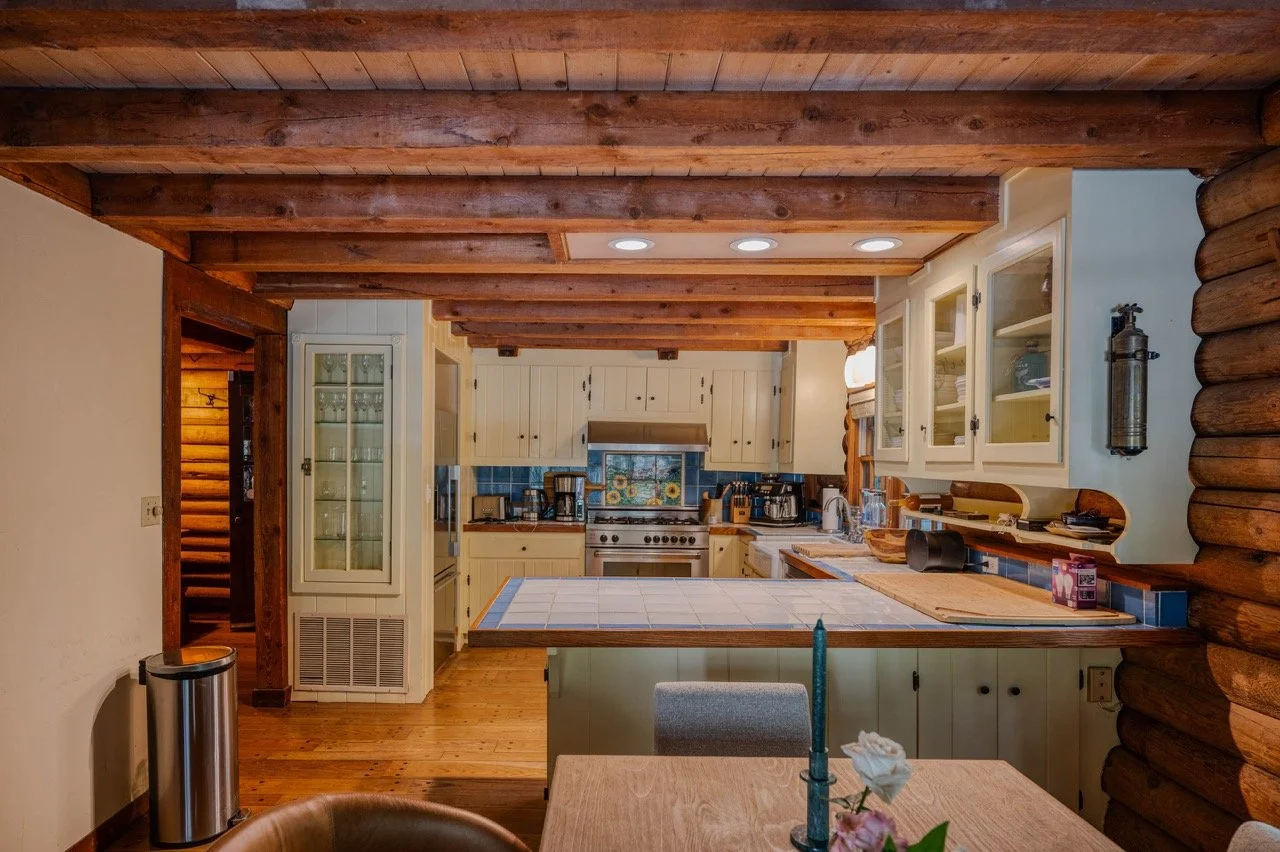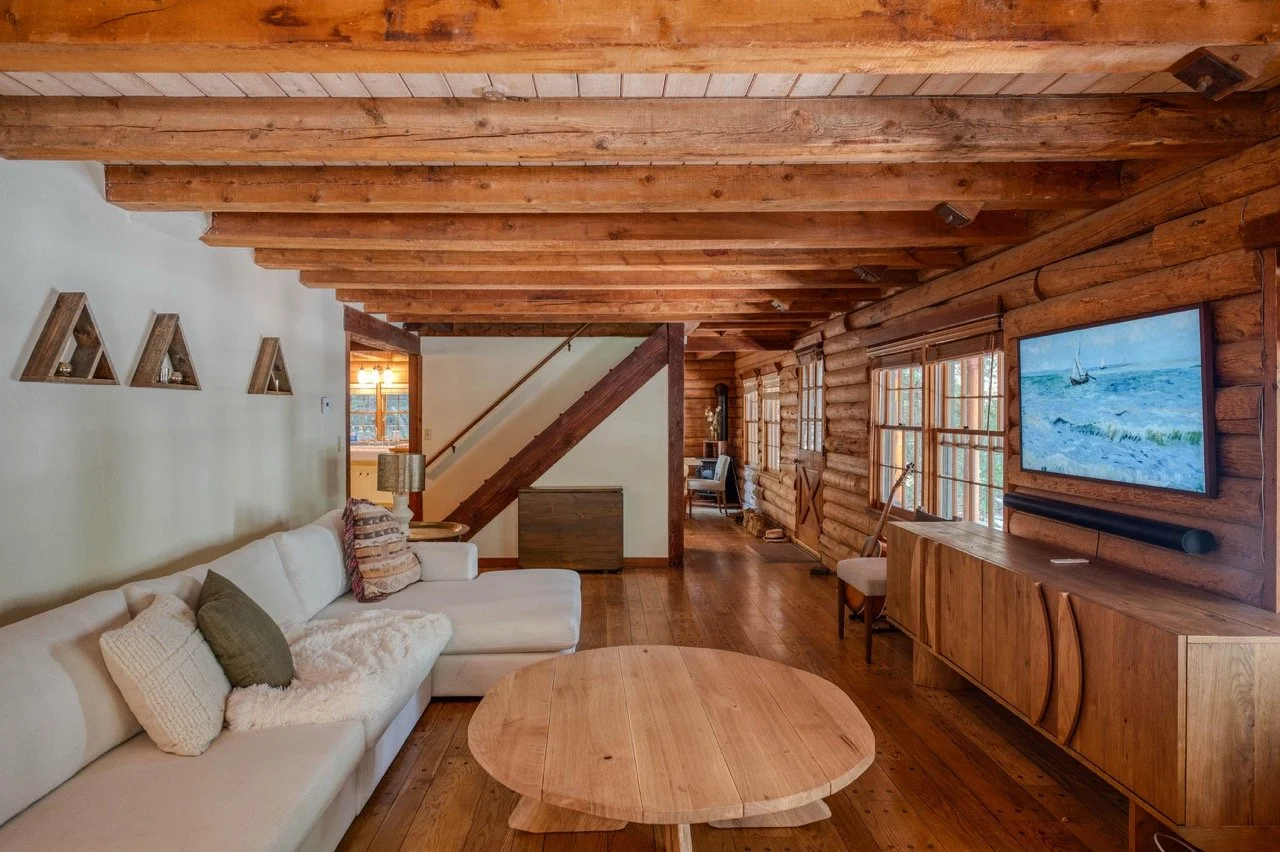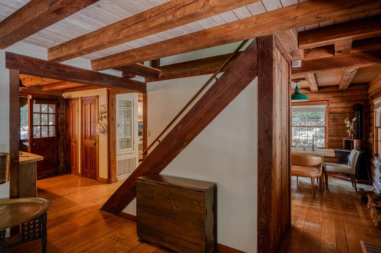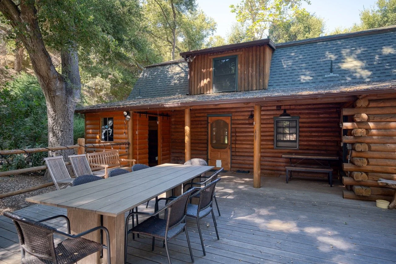 Built in 1977, this genuine log cabin on a 3 acre lot in Topanga features a huge windows, exposed wood beams, original log walls, and cozy, classic furnishings and decor.
