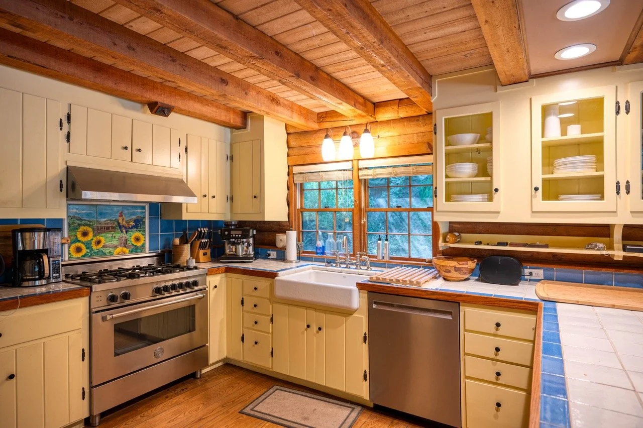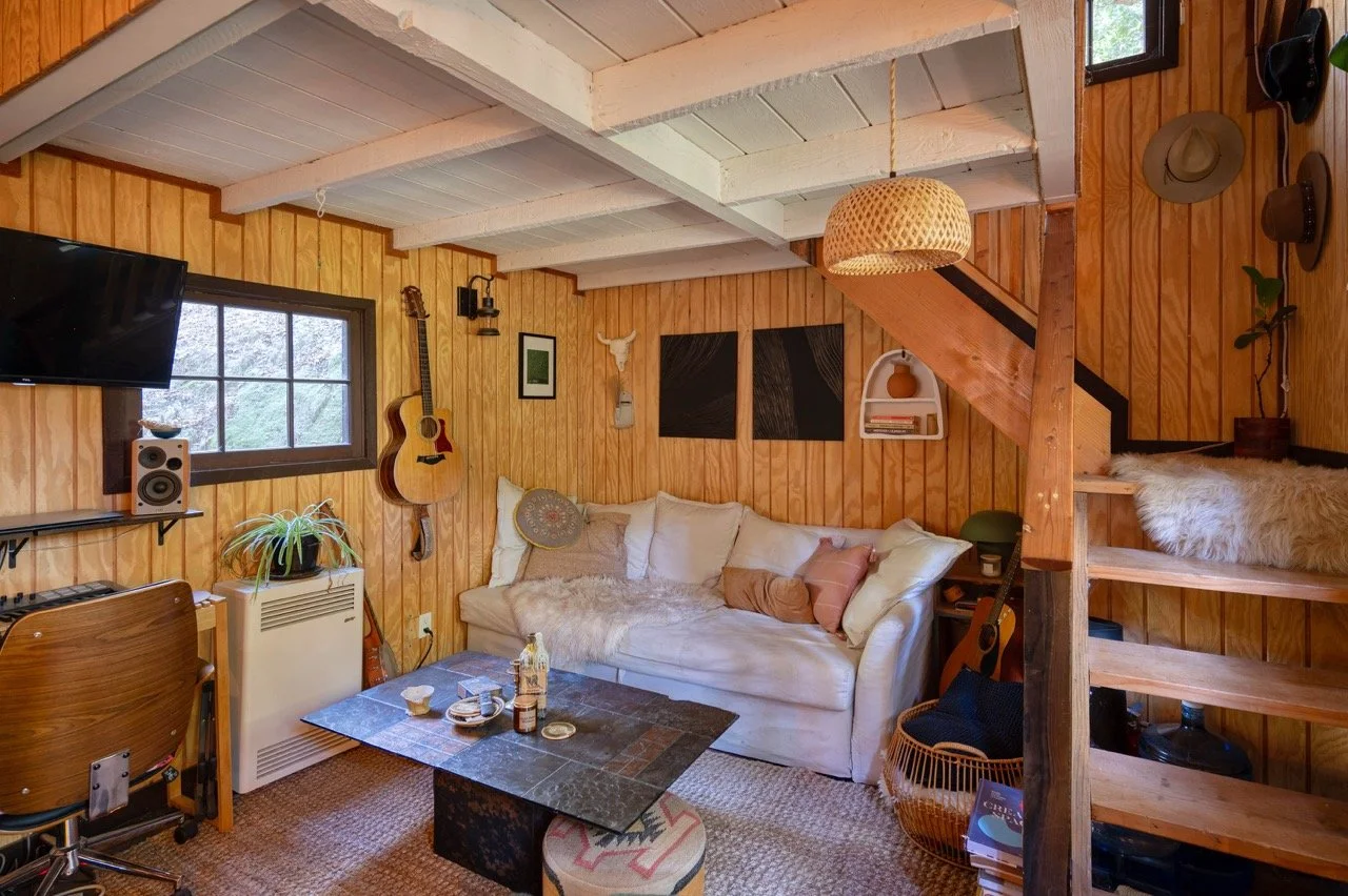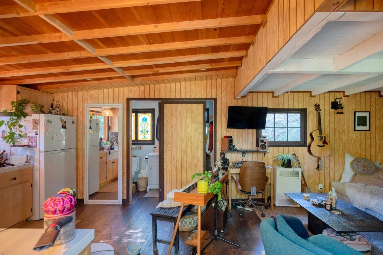 tags: Cabin, 1950s, 1960s, 1970s, 1980s, wood paneling, vintage, time capsule, romantic, rustic, floral, remote, central, retro, wood burning stove, copper kitchen, original, large windows, shingle, shaker, historic, moody, wood beams, topanga, LA proper, TMZ, vintage fireplace, mid century fireplace, midcentury, McM, bohemian, hippy, daisy jones and the six, location, cult, farmhouse, bungalow
