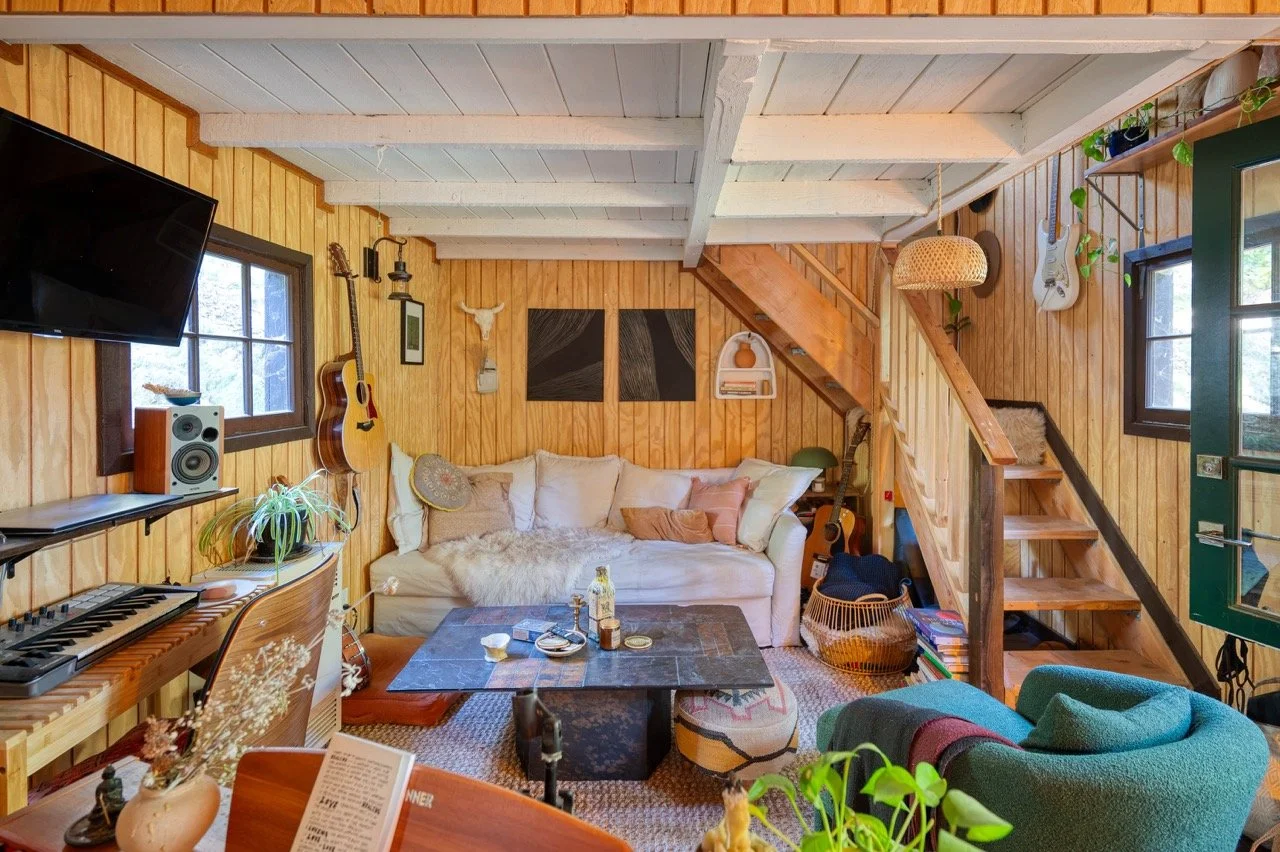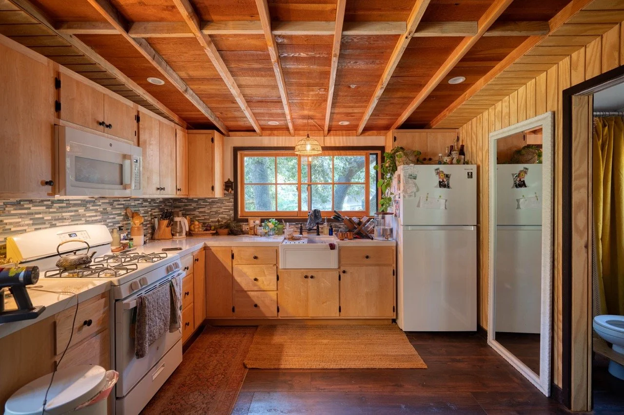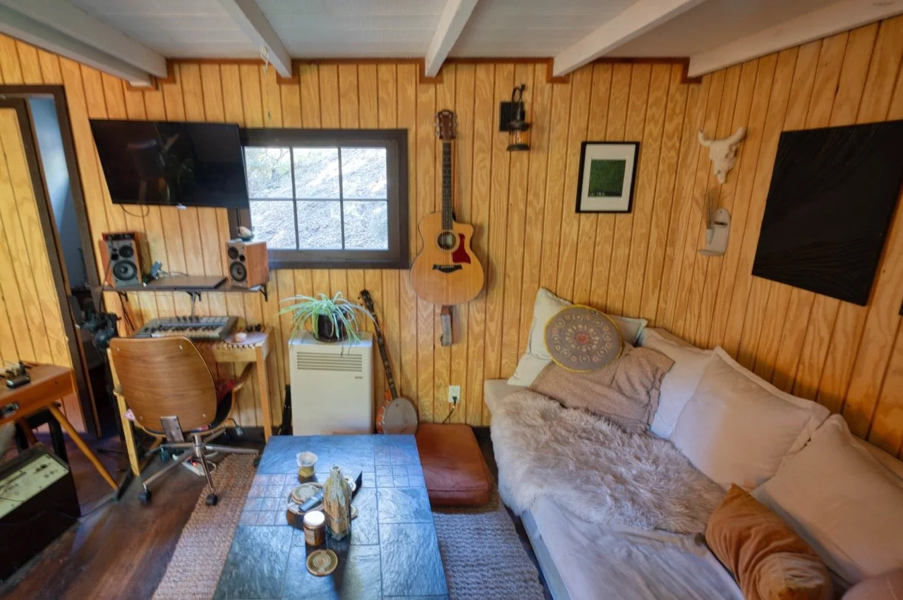 tags: Cabin, 1950s, 1960s, 1970s, 1980s, wood paneling, vintage, time capsule, romantic, rustic, floral, remote, central, retro, wood burning stove, copper kitchen, original, large windows, shingle, shaker, historic, moody, wood beams, topanga, LA proper, TMZ, vintage fireplace, mid century fireplace, midcentury, McM, bohemian, hippy, daisy jones and the six, location, cult, farmhouse, bungalow