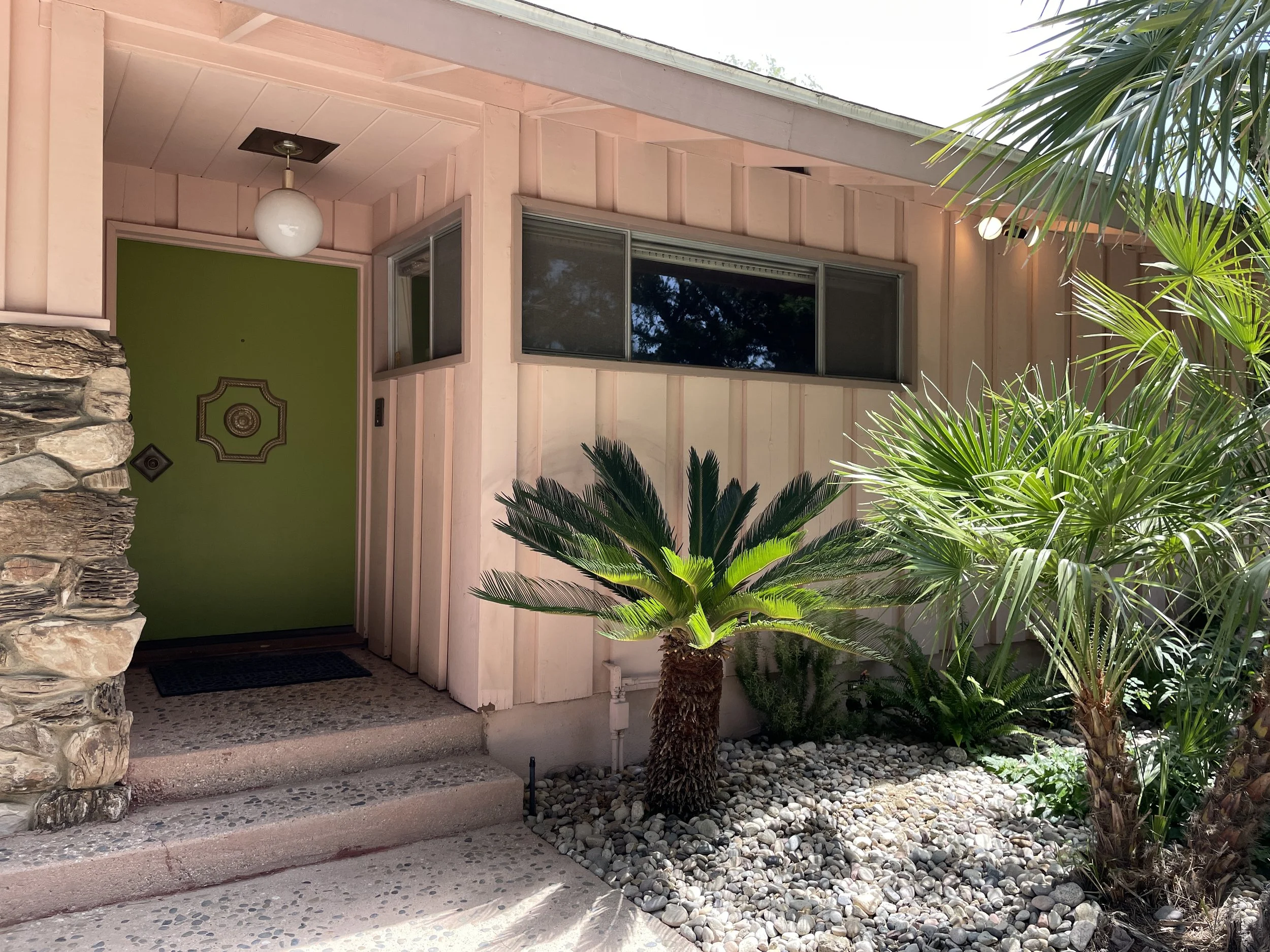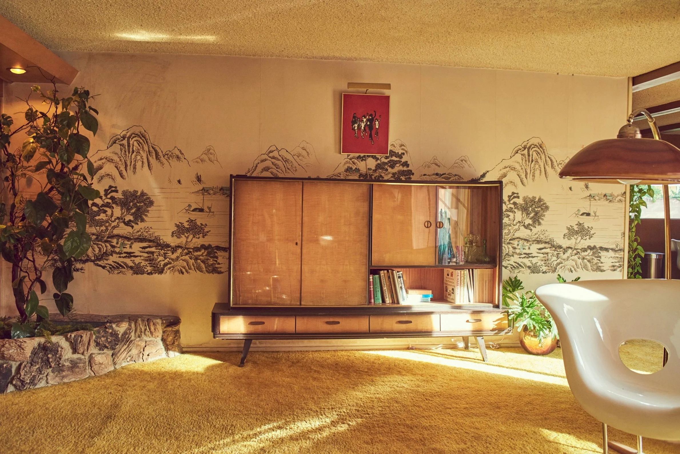 tags: midcentury time capsule, retro, 1950s, 1960s, 1970s, pink, ranch house, kitschy, grandma's house, swimming pool, fireplace, asian mural, bathtub, stone facade, wood paneling